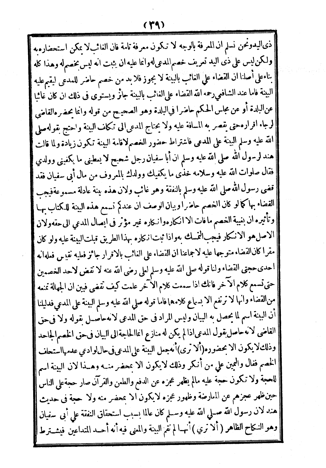 (أَلَا تَرَى) أَنَّهُ جَعَلَ الْبَيِّنَةَ عَلَى الْمُدَّعِي فِي حَالِ لَوْ ادَّعَى عَدَمَهَا اسْتَحْلَفَ الْخَصْمَ فَقَالَ «وَالْيَمِينُ عَلَى مَنْ أَنْكَرَ» وَذَلِكَ لَا يَكُونُ إلَّا بِمَحْضَرٍ مِنْهُ وَهَذَا؛ لِأَنَّ الْبَيِّنَةَ اسْمٌ لِلْحُجَّةِ وَلَا تَكُونُ حُجَّةً عَلَيْهِ مَا لَمْ يَظْهَرْ عَجْزُهُ عَنْ الدَّفْعِ وَالطَّعْنِ، وَالْقُرْآنُ صَارَ حُجَّةً عَلَى النَّاسِ حِينَ ظَهَرَ عَجْزُهُمْ عَنْ الْمُعَارَضَةِ وَظُهُورُ عَجْزِهِ لَا يَكُونُ إلَّا بِمَحْضَرٍ مِنْهُ وَلَا حُجَّةَ فِي حَدِيثِ هِنْدَ؛ لِأَنَّ رَسُولَ اللَّهِ - صَلَّى اللَّهُ عَلَيْهِ وَسَلَّمَ - كَانَ عَالِمًا بِسَبَبِ اسْتِحْقَاقِ النَّفَقَةِ عَلَى أَبِي سُفْيَانَ وَهُوَ النِّكَاحُ الظَّاهِرُ.