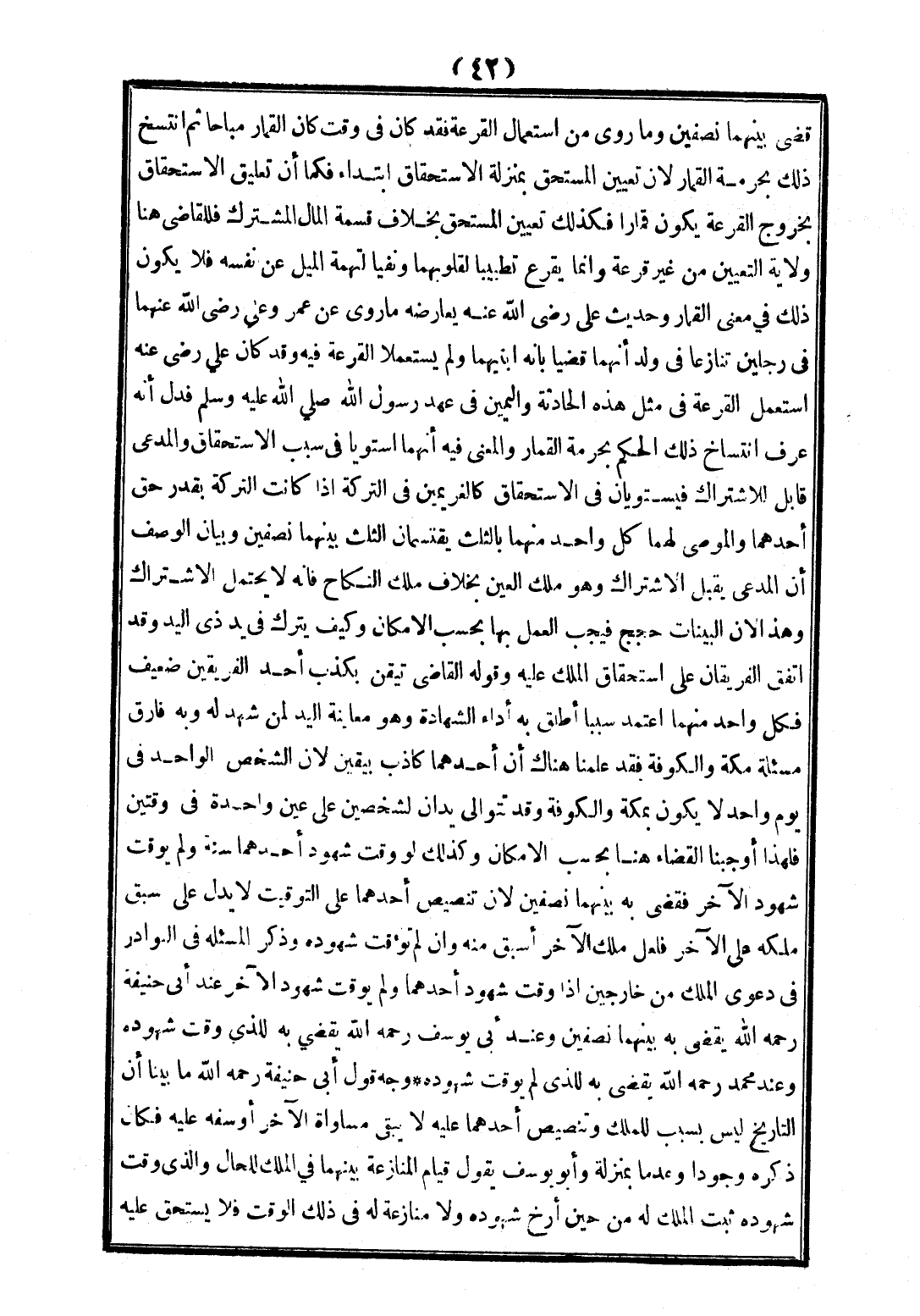 قَضَى بَيْنَهُمَا نِصْفَيْنِ» وَمَا رُوِيَ مِنْ اسْتِعْمَالِ الْقُرْعَةِ فَقَدْ كَانَ فِي وَقْتٍ كَانَ الْقِمَارُ مُبَاحًا ثُمَّ انْتَسَخَ ذَلِكَ بِحُرْمَةِ الْقِمَارِ لِأَنَّ تَعْيِينَ الْمُسْتَحِقِّ بِمَنْزِلَةِ الِاسْتِحْقَاقِ ابْتِدَاءً فَكَمَا أَنَّ تَعْلِيقَ الِاسْتِحْقَاقِ بِخُرُوجِ الْقُرْعَةِ يَكُونُ قِمَارًا فَكَذَلِكَ تَعْيِينُ الْمُسْتَحِقِّ بِخِلَافِ قِسْمَةِ الْمَالِ الْمُشْتَرَكِ فَلِلْقَاضِي هُنَا وِلَايَةُ التَّعْيِينِ مِنْ غَيْرِ قُرْعَةٍ وَإِنَّمَا يُقْرِعُ تَطْيِيبًا لِقُلُوبِهِمَا وَنَفْيًا لِتُهْمَةِ الْمَيْلِ عَنْ نَفْسِهِ فَلَا يَكُونُ ذَلِكَ فِي مَعْنَى الْقِمَارِ.