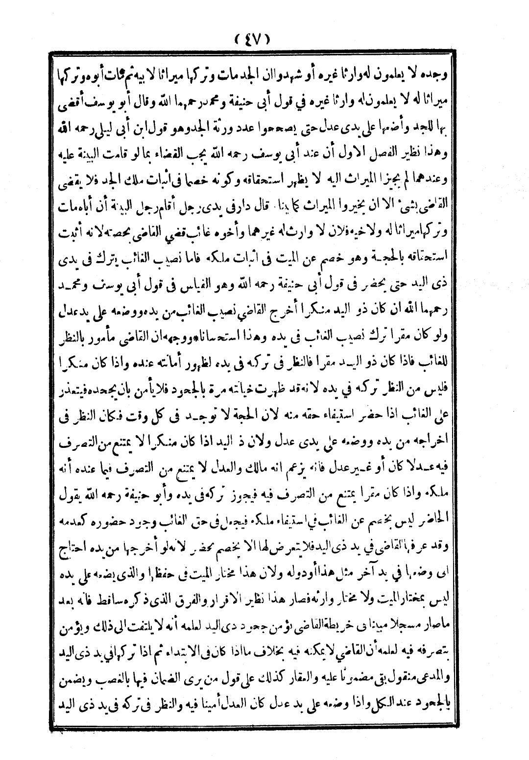 جَدِّهِ لَا يَعْلَمُونَ لَهُ وَارِثًا غَيْرَهُ أَوْ شَهِدُوا أَنَّ الْجَدَّ مَاتَ وَتَرَكَهَا مِيرَاثًا لِأَبِيهِ ثُمَّ مَاتَ أَبُوهُ وَتَرَكَهَا مِيرَاثًا لَهُ لَا يَعْلَمُونَ لَهُ وَارِثًا غَيْرَهُ فِي قَوْلِ أَبِي حَنِيفَةَ وَمُحَمَّدٍ رَحِمَهُمَا اللَّهُ وَقَالَ أَبُو يُوسُفَ أَقْضِي بِهَا لِلْجَدِّ وَأَضَعُهَا عَلَى يَدَيْ عَدْلٍ حَتَّى يُصَحِّحُوا عَدَدَ وَرَثَةِ الْجَدِّ وَهُوَ قَوْلُ ابْنِ أَبِي لَيْلَى - رَحِمَهُ اللَّهُ - وَهَذَا نَظِيرُ الْفَصْلِ الْأَوَّلِ أَنَّ عِنْدَ أَبِي يُوسُفَ - رَحِمَهُ اللَّهُ - يَجِبُ الْقَضَاءُ بِمَا لَوْ قَامَتْ الْبَيِّنَةُ عَلَيْهِ وَعِنْدَهُمَا لَمْ يُجِيزَا الْمِيرَاثَ إلَيْهِ لَا يَظْهَرُ اسْتِحْقَاقُهُ وَكَوْنُهُ خَصْمًا فِي إثْبَاتِ مِلْكِ الْجَدِّ فَلَا يَقْضِي الْقَاضِي بِشَيْءٍ إلَّا أَنْ يُخَيَّرُوا الْمِيرَاثَ كَمَا بَيَّنَّا.