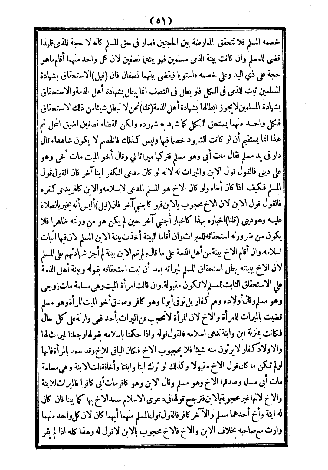 قَالَ دَارٌ فِي يَدِ مُسْلِمٍ فَقَالَ مَاتَ أَبِي وَهُوَ مُسْلِمٌ فَتَرَكَهَا مِيرَاثًا لِي وَقَالَ أَخُو الْمَيِّتِ مَاتَ أَخِي وَهُوَ عَلَى دِينِي فَالْقَوْلُ قَوْلُ الِابْنِ وَالْمِيرَاثُ لَهُ لِأَنَّهُ لَوْ كَانَ مُدَّعِي الْكُفْرِ ابْنًا آخَرَ كَانَ الْقَوْلُ قَوْلَ الْمُسْلِمِ فَكَيْفَ إذَا كَانَ أَخَاهُ وَلَوْ كَانَ الْأَخُ هُوَ الْمُسْلِمُ الْمُدَّعِي لِإِسْلَامِهِ وَالِابْنُ كَافِرٌ يَدَّعِي كُفْرَهُ فَالْقَوْلُ قَوْلُ الِابْنِ؛ لِأَنَّ الْأَخَ مَحْجُوبٌ بِالِابْنِ فَهُوَ كَأَجْنَبِيٍّ آخَرَ. فَإِنْ (قِيلَ) أَلَيْسَ أَنَّهُ يُخْبِرُ بِالصَّلَاةِ عَلَيْهِ وَهُوَ دِينِيٌّ (قُلْنَا) إخْبَارُهُ بِهَذَا كَإِخْبَارِ أَجْنَبِيٍّ آخَرَ حِينَ لَمْ يَكُنْ هُوَ مِنْ وَرَثَتِهِ ظَاهِرًا فَلَا يَكُونُ مِنْ ضَرُورَتِهِ اسْتِحْقَاقُهُ لِلْمِيرَاثِ وَإِنْ أَقَامَا الْبَيِّنَةَ أُخِذَتْ بَيِّنَةُ الِابْنِ الْمُسْلِمِ؛ لِأَنَّ فِيهَا إثْبَاتَ إسْلَامِهِ وَإِنْ أَقَامَ الْأَخُ بَيِّنَةً مِنْ أَهْلِ الذِّمَّةِ عَلَى مَا قَالَ وَلَمْ يُقِمْ الِابْنُ بَيِّنَةً لَمْ أُجِزْ شَهَادَتَهُمْ عَلَى الْمُسْلِمِ؛ لِأَنَّ الْأَخَ بِبَيِّنَتِهِ يُبْطِلُ اسْتِحْقَاقَ الْمُسْلِمِ لِمِيرَاثِهِ بَعْدَ أَنْ ثَبَتَ اسْتِحْقَاقُهُ بِقَوْلِهِ وَبَيِّنَةُ أَهْلِ الذِّمَّةِ عَلَى الِاسْتِحْقَاقِ الثَّابِتِ لِلْمُسْلِمِ لَا تَكُونُ مَقْبُولَةً.