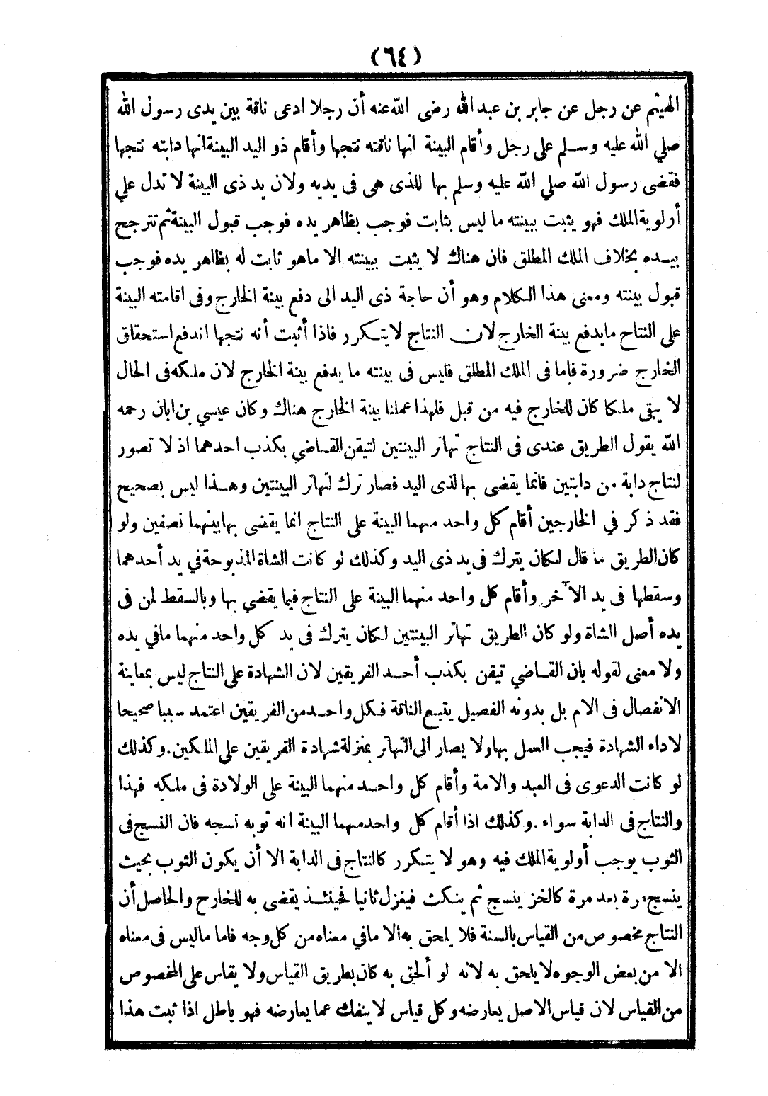 الْهَيْثَمِ عَنْ رَجُلٍ عَنْ جَابِرِ بْنِ عَبْدِ اللَّهِ - رَضِيَ اللَّهُ عَنْهُ - «أَنَّ رَجُلًا ادَّعَى نَاقَةً بَيْنَ يَدَيْ رَسُولِ اللَّهِ - صَلَّى اللَّهُ عَلَيْهِ وَسَلَّمَ - عَلَى رَجُلٍ، وَأَقَامَ الْبَيِّنَةَ أَنَّهَا نَاقَتُهُ نَتَجَهَا، وَأَقَامَ ذُو الْيَدِ الْبَيِّنَةَ أَنَّهَا دَابَّتُهُ نَتَجَهَا فَقَضَى رَسُولُ اللَّهِ - صَلَّى اللَّهُ عَلَيْهِ وَسَلَّمَ - بِهَا لِلَّذِي هِيَ فِي يَدَيْهِ»؛ وَلِأَنَّ يَدَ ذِي الْبَيِّنَةِ لَا تَدُلُّ عَلَى أَوْلَوِيَّةِ الْمِلْكِ فَهُوَ يُثْبِتُ مَا لَيْسَ بِثَابِتٍ فَوَجَبَ بِظَاهِرِ يَدِهِ فَوَجَبَ قَبُولُ الْبَيِّنَةِ.