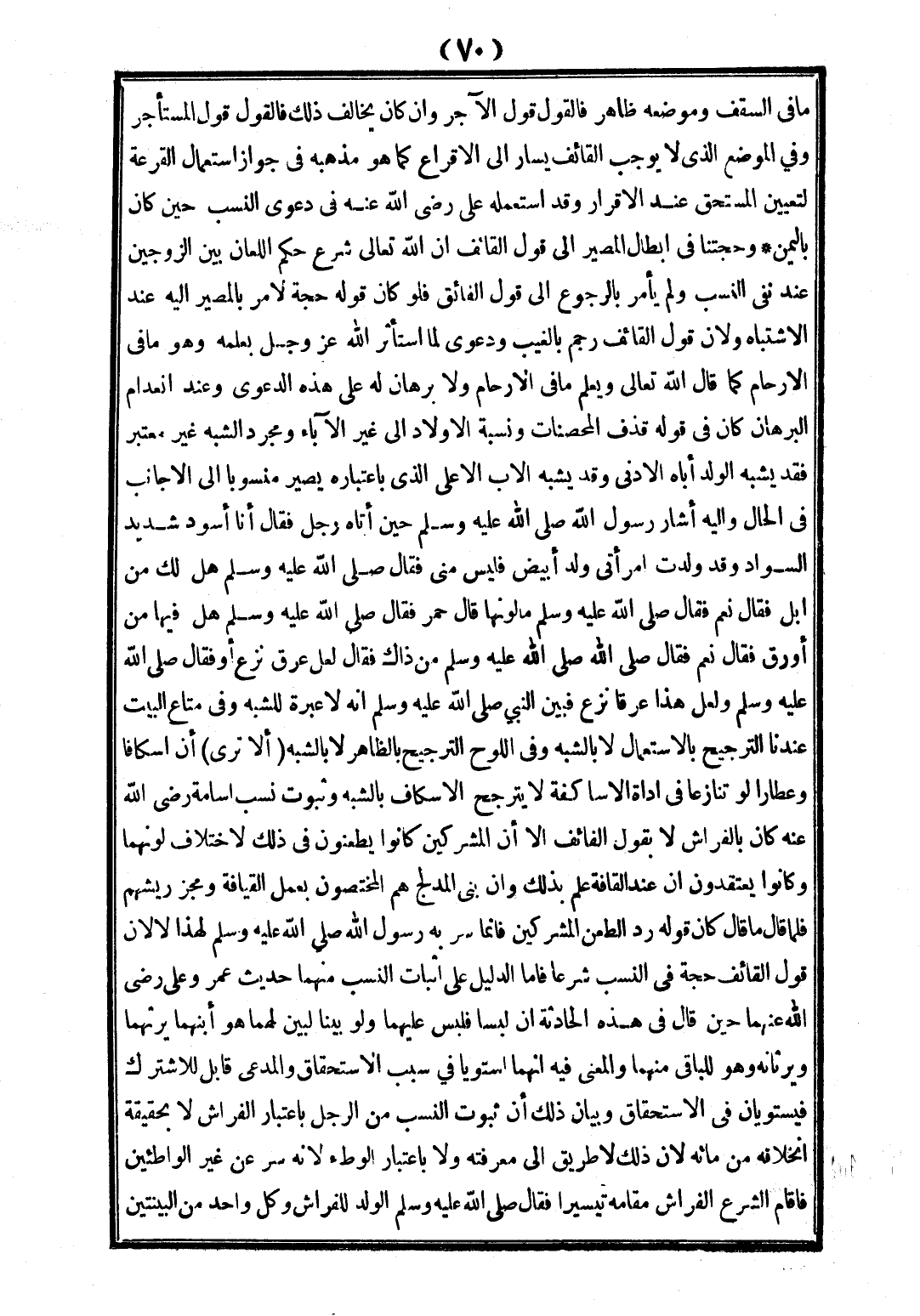 (أَلَا تَرَى) أَنْ إسْكَافًا وَعَطَّارًا لَوْ تَنَازَعَا فِي أَدَاةِ الْأَسَاكِفَةِ لَا يَتَرَجَّحُ الْإِسْكَافُ بِالشَّبَهِ، وَثُبُوتُ نَسَبِ أُسَامَةَ - رَضِيَ اللَّهُ عَنْهُ - كَانَ بِالْفِرَاشِ لَا بِقَوْلِ الْقَائِفِ إلَّا أَنَّ الْمُشْرِكِينَ كَانُوا يَطْعَنُونَ فِي ذَلِكَ لِاخْتِلَافِ لَوْنِهِمَا، وَكَانُوا يَعْتَقِدُونَ أَنَّ عِنْدَ الْقَافَةِ عِلْمٌ بِذَلِكَ، وَأَنَّ بَنِي الْمُدْلِجِ هُمْ الْمُخْتَصُّونَ بِعَمَلِ الْقِيَافَةِ، وَجَزِّ رِيشِهِمْ فَلَمَّا قَالَ مَا قَالَ كَانَ قَوْلُهُ رَدًّا لِطَعْنِ الْمُشْرِكِينَ فَإِنَّمَا سُرَّ بِهِ رَسُولُ اللَّهِ - صَلَّى اللَّهُ عَلَيْهِ وَسَلَّمَ - لِهَذَا، لَا لِأَنَّ قَوْلَ الْقَائِفِ حُجَّةٌ فِي النَّسَبِ شَرْعًا.