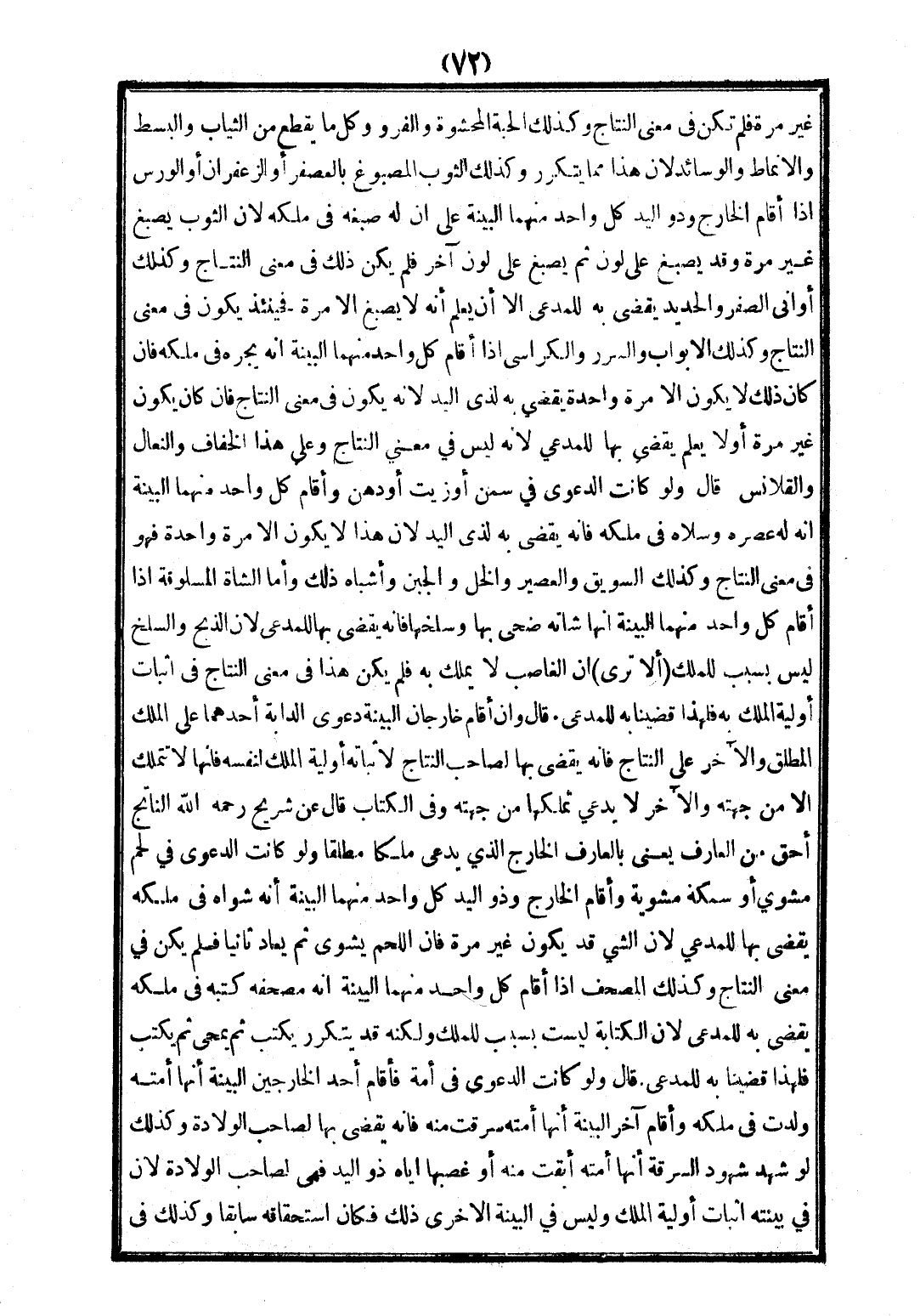 غَيْرَ مَرَّةٍ فَلَمْ تَكُنْ فِي مَعْنَى النِّتَاجِ، وَكَذَلِكَ الْحَبَّةُ الْمَحْشُوَّةُ وَالْفَرْوُ، وَكُلُّ مَا يُقْطَعُ مِنْ الثِّيَابِ وَالْبُسُطِ، وَالْأَنْمَاطِ وَالْوَسَائِدِ؛ لِأَنَّ هَذَا مِمَّا يَتَكَرَّرُ، وَكَذَلِكَ الثَّوْبُ الْمَصْبُوغُ بِالْعُصْفُرِ أَوْ الزَّعْفَرَانِ أَوْ الْوَرْسِ إذَا أَقَامَ الْخَارِجُ، وَذُو الْيَدِ كُلُّ وَاحِدٍ مِنْهُمَا الْبَيِّنَةَ عَلَى أَنَّ لَهُ صَبْغَهُ فِي مِلْكِهِ؛ لِأَنَّ الثَّوْبَ يُصْبَغُ غَيْرَ مَرَّةٍ، وَقَدْ يُصْبَغُ عَلَى لَوْنٍ، ثُمَّ يُصْبَغُ عَلَى لَوْنٍ آخَرَ فَلَمْ يَكُنْ ذَلِكَ فِي مَعْنَى النِّتَاجِ، وَكَذَلِكَ أَوَانِي الصُّفْرِ، وَالْحَدِيدِ يُقْضَى بِهِ لِلْمُدَّعِي إلَّا أَنْ يُعْلَمَ أَنَّهُ لَا يُصْبَغُ إلَّا مَرَّةً فَحِينَئِذٍ يَكُونُ فِي مَعْنَى النِّتَاجِ، وَكَذَلِكَ الْأَبْوَابُ، وَالسُّرَرُ وَالْكَرَاسِيُّ إذَا أَقَامَ كُلُّ وَاحِدٍ مِنْهُمَا الْبَيِّنَةَ أَنَّهُ يَجُرُّهُ فِي مِلْكِهِ فَإِنْ كَانَ ذَلِكَ لَا يَكُونُ إلَّا مَرَّةً وَاحِدَةً يُقْضَى بِهِ لِذِي الْيَدِ؛ لِأَنَّهُ يَكُونُ فِي مَعْنَى النِّتَاجِ فَإِنْ كَانَ يَكُونُ غَيْرَ مَرَّةٍ أَوْ لَا يُعْلَمُ يُقْضَى بِهَا لِلْمُدَّعِي؛ لِأَنَّهُ لَيْسَ فِي مَعْنَى النِّتَاجِ وَعَلَى هَذَا الْخِفَافُ وَالنِّعَالُ، وَالْقَلَانِسُ.