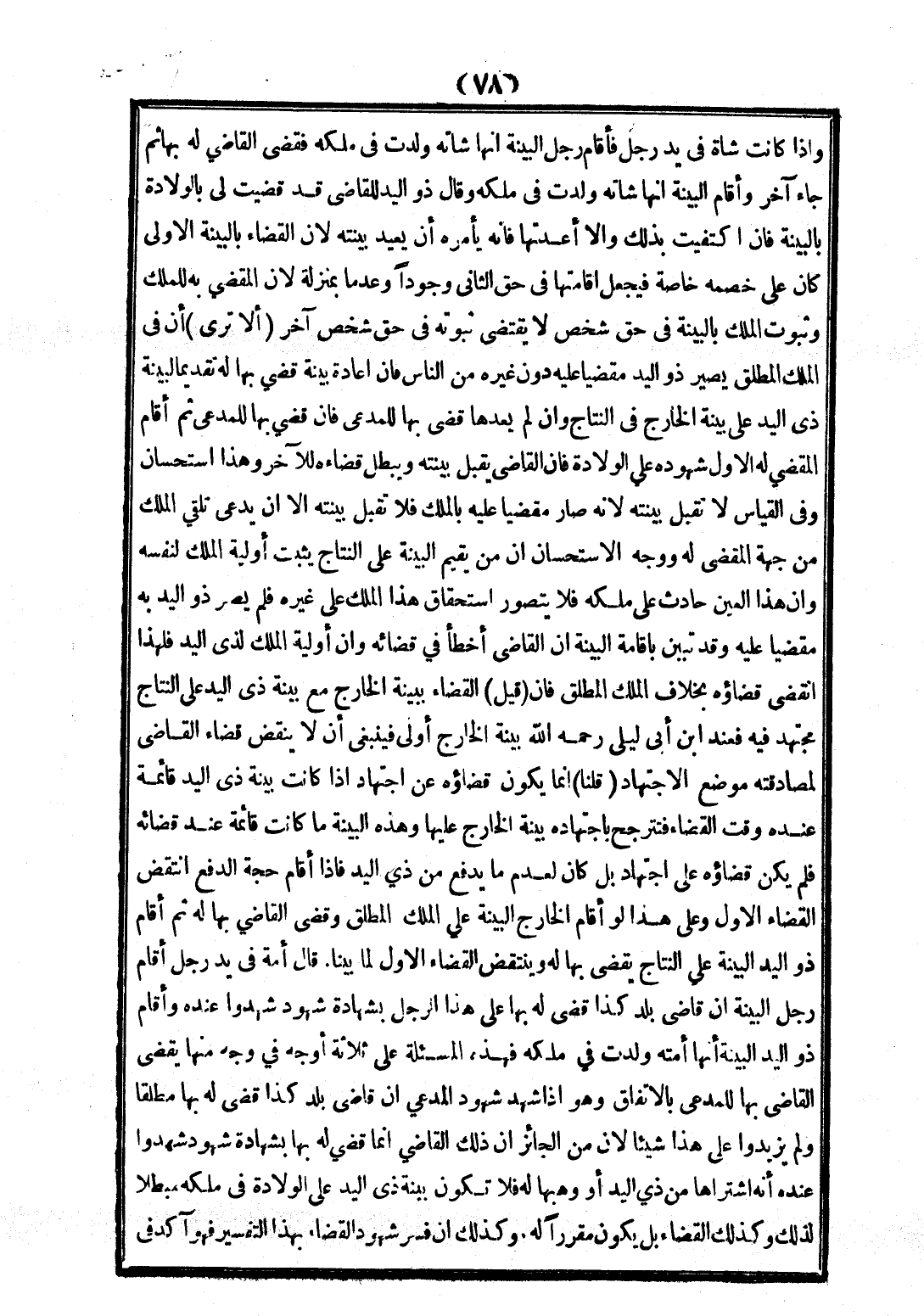 (أَلَا تَرَى) أَنَّ فِي الْمِلْكِ الْمُطْلَقِ يَصِيرُ ذُو الْيَدِ مَقْضِيًّا عَلَيْهِ دُونَ غَيْرِهِ مِنْ النَّاسِ فَإِنْ أَعَادَ بَيِّنَةً قَضَى بِهَا لَهُ تَقْدِيمًا لِبَيِّنَةِ ذِي الْيَدِ عَلَى بَيِّنَةِ الْخَارِجِ فِي النِّتَاجِ، وَإِنْ لَمْ يُعِدْهَا قَضَى بِهَا لِلْمُدَّعِي فَإِنْ قَضَى بِهَا لِلْمُدَّعِي، ثُمَّ أَقَامَ الْمَقْضِيُّ لَهُ الْأَوَّلُ شُهُودَهُ عَلَى الْوِلَادَةِ فَإِنَّ الْقَاضِيَ يَقْبَلُ بَيِّنَتَهُ وَيُبْطِلُ قَضَاءَهُ لِلْآخَرِ، وَهَذَا اسْتِحْسَانٌ وَفِي الْقِيَاسِ لَا تُقْبَلُ بَيِّنَتُهُ؛ لِأَنَّهُ صَارَ مَقْضِيًّا عَلَيْهِ بِالْمِلْكِ فَلَا تُقْبَلُ بَيِّنَتُهُ إلَّا أَنْ يَدَّعِيَ تَلَقِّي الْمِلْكِ مِنْ جِهَةِ الْمَقْضِيِّ لَهُ.