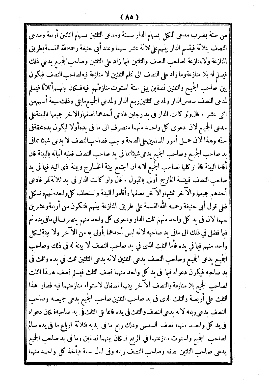 قَالَ: وَلَوْ كَانَتْ الدَّارُ فِي يَدِ ثَلَاثَةِ نَفَرٍ فَادَّعَى أَحَدُهُمْ جَمِيعَهَا وَالْآخَرُ ثُلُثَيْهَا وَالْآخَرُ نِصْفَهَا، وَأَقَامُوا الْبَيِّنَةَ، وَاسْتُحْلِفَ كُلُّ وَاحِدٍ مِنْهُمْ وَنَكَلَ فَعَلَى قَوْلِ أَبِي حَنِيفَةَ - رَحِمَهُ اللَّهُ - الْقِسْمَةُ عَلَى طَرِيقِ الْمُنَازَعَةِ بَيْنَهُمْ فَتَكُونُ مِنْ أَرْبَعَةٍ وَعِشْرِينَ سَهْمًا؛ لِأَنَّ فِي يَدِ كُلِّ وَاحِدٍ مِنْهُمْ ثُلُثَ الدَّارِ، وَدَعْوَى كُلِّ وَاحِدٍ مِنْهُمْ يَنْصَرِفُ إلَى مَا فِي يَدِهِ، ثُمَّ فِيمَا فَضَلَ فِي ذَلِكَ إلَى مَا فِي يَدِ صَاحِبِهِ؛ لِأَنَّهُ لَيْسَ أَحَدُهُمَا بِأَوْلَى بِهِ مِنْ الْآخَرِ، وَلَا بَيِّنَةَ لِكُلِّ وَاحِدٍ مِنْهُمْ فِيمَا فِي يَدِهِ فَأَمَّا الثُّلُثُ الَّذِي فِي يَدِ صَاحِبِ النِّصْفِ لَا بَيِّنَةَ لَهُ فِي ذَلِكَ، وَصَاحِبُ الْجَمِيعِ يَدَّعِي الْجَمِيعَ، وَصَاحِبُ النِّصْفِ يَدَّعِي الثُّلُثَيْنِ؛ لِأَنَّهُ يَدَّعِي الثُّلُثَيْنِ ثُلُثٌ فِي يَدِهِ وَثُلُثٌ فِي يَدِ صَاحِبِهِ فَيَكُونُ دَعْوَاهُ فِيمَا فِي يَدِ كُلِّ وَاحِدٍ مِنْهُمَا نِصْفَ الثُّلُثِ فَيُسَلِّمُ نِصْفَ هَذَا الثُّلُثِ لِصَاحِبِ الْجَمِيعِ بِلَا مُنَازَعَةٍ، وَالنِّصْفُ الْآخَرُ بَيْنَهُمَا نِصْفَانِ؛ لِاسْتِوَاءِ مُنَازَعَتِهِمَا فِيهِ فَصَارَ هَذَا الثُّلُثُ عَلَى أَرْبَعَةٍ، وَالثُّلُثُ الَّذِي فِي يَدِ صَاحِبِ الثُّلُثَيْنِ صَاحِبُ الْجَمِيعِ يَدَّعِي جَمِيعَهُ، وَصَاحِبُ النِّصْفِ يَدَّعِي رُبُعَهُ؛ لِأَنَّهُ يَدَّعِي النِّصْفَ وَالثُّلُثَ فِي يَدِهِ فَإِنَّمَا بَقِيَ الثُّلُثُ فِي يَدِ صَاحِبِهِ فَكَانَ دَعْوَاهُ فِي يَدِ كُلِّ وَاحِدٍ مِنْهُمَا نِصْفَ السُّدُسِ، وَذَلِكَ رُبُعُ مَا فِي يَدَيْهِ فَثَلَاثَةُ أَرْبَاعِ مَا فِي يَدِهِ سَالِمٌ لِصَاحِبِ الْجَمِيعِ، وَاسْتَوَتْ مُنَازَعَتُهُمَا فِي الرُّبُعِ فَكَانَ بَيْنَهُمَا نِصْفَيْنِ، وَمَا فِي يَدِ صَاحِبِ الْجَمِيعِ يَدَّعِي صَاحِبُ الثُّلُثَيْنِ نِصْفَهُ وَصَاحِبُ النِّصْفِ رُبُعَهُ وَفِي الْمَالِ سِعَةٌ فَيَأْخُذُ كُلُّ وَاحِدٍ مِنْهُمَا