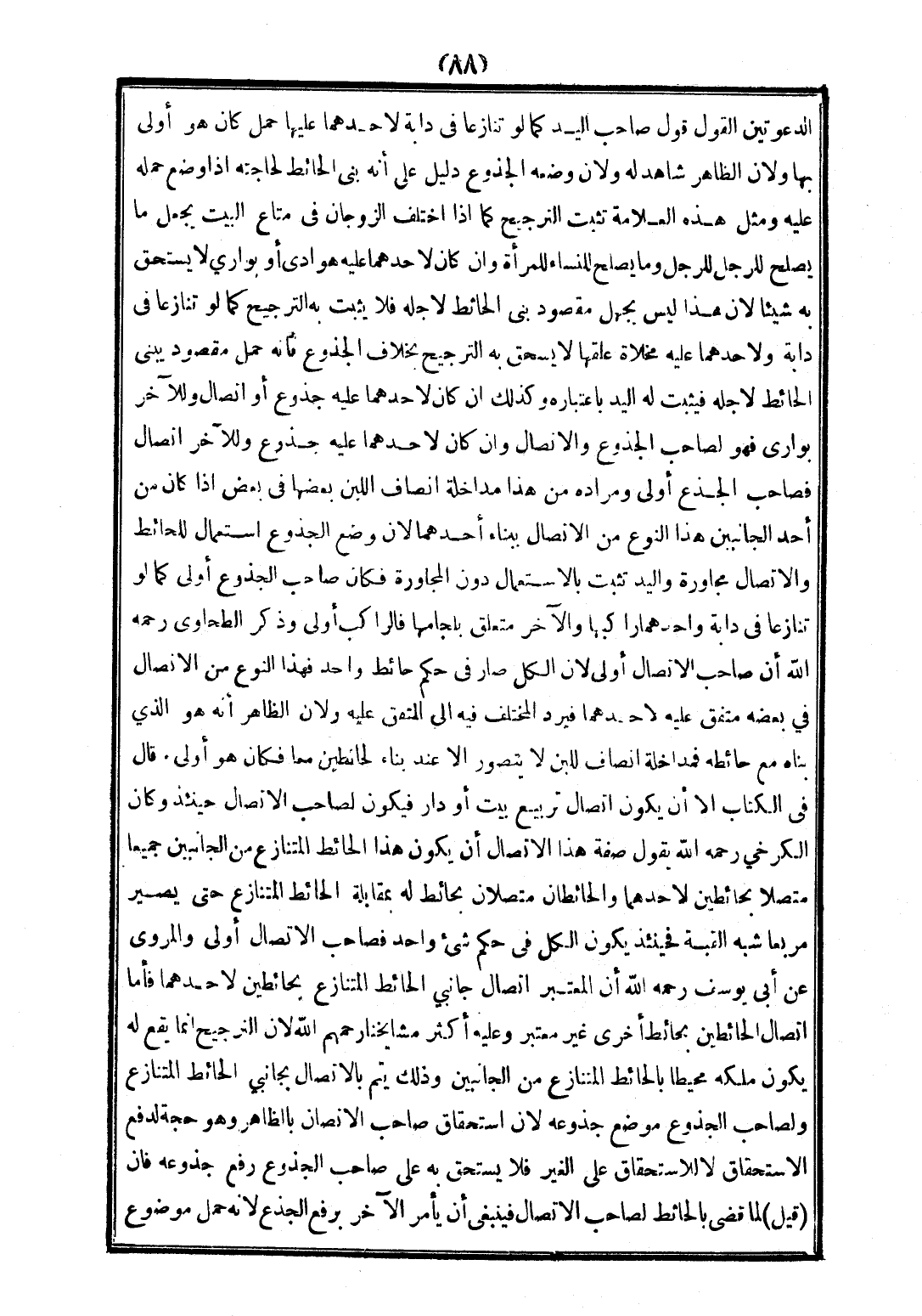 وَالْمَرْوِيُّ عَنْ أَبِي يُوسُفَ - رَحِمَهُ اللَّهُ - أَنَّ الْمُعْتَبَرَ اتِّصَالُ جَانِبَيْ الْحَائِطِ الْمُتَنَازَعِ بِحَائِطَيْنِ لِأَحَدِهِمَا فَأَمَّا اتِّصَالُ الْحَائِطَيْنِ بِحَائِطٍ أُخْرَى غَيْرُ مُعْتَبَرٍ وَعَلَيْهِ أَكْثَرُ مَشَايِخِنَا - رَحِمَهُمُ اللَّهُ -.