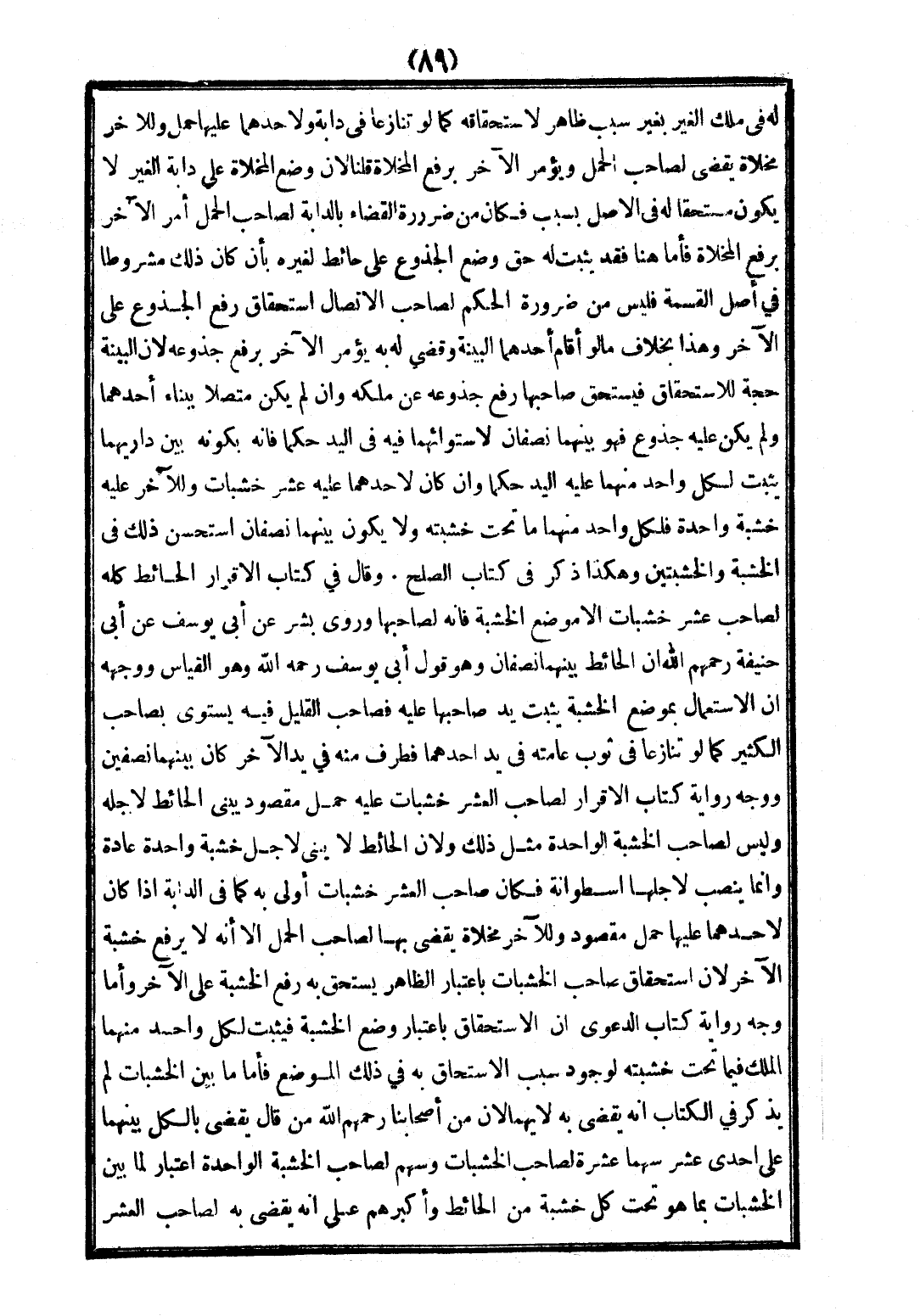 لَهُ فِي مِلْكِ الْغَيْرِ بِغَيْرِ سَبَبٍ ظَاهِرٍ لِاسْتِحْقَاقِهِ كَمَا لَوْ تَنَازَعَا فِي دَابَّةٍ لِأَحَدِهِمَا عَلَيْهَا حِمْلٌ؛ وَلِلْآخَرِ مِخْلَاةٌ يَقْضِي لِصَاحِبِ الْحِمْلِ، وَيُؤْمَرُ الْآخَرُ بِرَفْعِ الْمِخْلَاةِ قُلْنَا: لِأَنَّ وَضْعَ الْمِخْلَاةِ عَلَى دَابَّةِ الْغَيْرِ لَا يَكُونُ مُسْتَحَقًّا لَهُ فِي الْأَصْلِ بِسَبَبٍ فَكَانَ مِنْ ضَرُورَةِ الْقَضَاءِ بِالدَّابَّةِ لِصَاحِبِ الْحِمْلِ أَمْرُ الْآخَرِ بِرَفْعِ الْمِخْلَاةِ فَأَمَّا هُنَا فَقَدْ يَثْبُتُ لَهُ حَقُّ وَضْعِ الْجُذُوعِ عَلَى حَائِطٍ لِغَيْرِهِ بِأَنْ كَانَ ذَلِكَ مَشْرُوطًا فِي أَصْلِ الْقِسْمَةِ فَلَيْسَ مِنْ ضَرُورَةِ الْحُكْمِ لِصَاحِبِ الِاتِّصَالِ اسْتِحْقَاقُ رَفْعِ الْجُذُوعِ عَلَى الْآخَرِ، وَهَذَا بِخِلَافِ مَا لَوْ أَقَامَ أَحَدُهُمَا الْبَيِّنَةَ، وَقَضَى لَهُ بِهِ يُؤْمَرُ الْآخَرُ بِرَفْعِ جُذُوعِهِ؛ لِأَنَّ الْبَيِّنَةَ حُجَّةٌ لِلِاسْتِحْقَاقِ فَيَسْتَحِقُّ صَاحِبُهَا رَفْعَ جُذُوعِهِ عَنْ مِلْكِهِ، وَإِنْ لَمْ يَكُنْ مُتَّصِلًا بِبِنَاءِ أَحَدِهِمَا، وَلَمْ يَكُنْ عَلَيْهِ جُذُوعٌ فَهُوَ بَيْنَهُمَا نِصْفَانِ لِاسْتِوَائِهِمَا فِيهِ فِي الْيَدِ حُكْمًا فَإِنَّهُ بِكَوْنِهِ بَيْنَ دَارَيْهِمَا يَثْبُتُ لِكُلِّ وَاحِدٍ مِنْهُمَا عَلَيْهِ الْيَدُ حُكْمًا، وَإِنْ كَانَ لِأَحَدِهِمَا عَلَيْهِ عَشْرُ خَشَبَاتٍ؛ وَلِلْآخَرِ عَلَيْهِ خَشَبَةٌ وَاحِدَةٌ فَلِكُلِّ وَاحِدٍ مِنْهُمَا مَا تَحْتَ خَشَبَتِهِ، وَلَا يَكُونُ بَيْنَهُمَا نِصْفَانِ اسْتَحْسَنَ ذَلِكَ فِي الْخَشَبَةِ وَالْخَشَبَتَيْنِ، وَهَكَذَا ذَكَرَ فِي كِتَابِ الصُّلْحِ.
