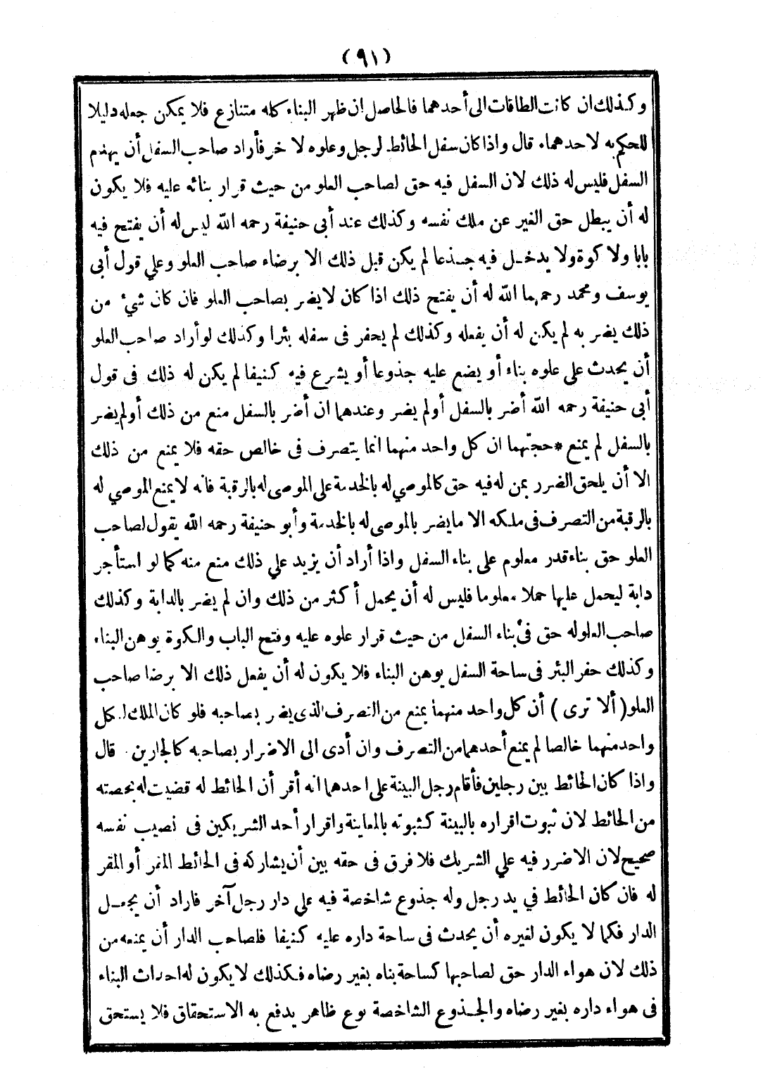 وَكَذَلِكَ عِنْدَ أَبِي حَنِيفَةَ - رَحِمَهُ اللَّهُ - لَيْسَ لَهُ أَنْ يَفْتَحَ فِيهِ بَابًا، وَلَا كُوَّةً، وَلَا يُدْخِلُ فِيهِ جِذْعًا لَمْ يَكُنْ قَبْلَ ذَلِكَ إلَّا بِرِضَاءِ صَاحِبِ الْعُلُوِّ، وَعَلَى قَوْلِ أَبِي يُوسُفَ وَمُحَمَّدٍ رَحِمَهُمَا اللَّهُ لَهُ أَنْ يَفْتَحَ ذَلِكَ إذَا كَانَ لَا يَضُرُّ بِصَاحِبِ الْعُلُوِّ فَإِنْ كَانَ شَيْءٌ مِنْ ذَلِكَ يَضُرُّ بِهِ لَمْ يَكُنْ لَهُ أَنْ يَفْعَلَهُ، وَكَذَلِكَ لَمْ يَحْفِرْ فِي سُفْلِهِ بِئْرًا، وَكَذَلِكَ لَوْ أَرَادَ صَاحِبُ الْعُلُوِّ أَنْ يُحْدِثَ عَلَى عُلُوِّهِ بِنَاءً أَوْ يَضَعَ عَلَيْهِ جُذُوعًا أَوْ يَشْرَعَ فِيهِ كَنِيفًا لَمْ يَكُنْ لَهُ ذَلِكَ فِي قَوْلِ أَبِي حَنِيفَةَ - رَحِمَهُ اللَّهُ - أَضَرَّ بِالسُّفْلِ أَوْ لَمْ يَضُرَّ وَعِنْدَهُمَا إنْ أَضَرَّ بِالسُّفْلِ مُنِعَ مِنْ ذَلِكَ أَوْ لَمْ يَضُرَّ بِالسُّفْلِ لَمْ يُمْنَعْ.