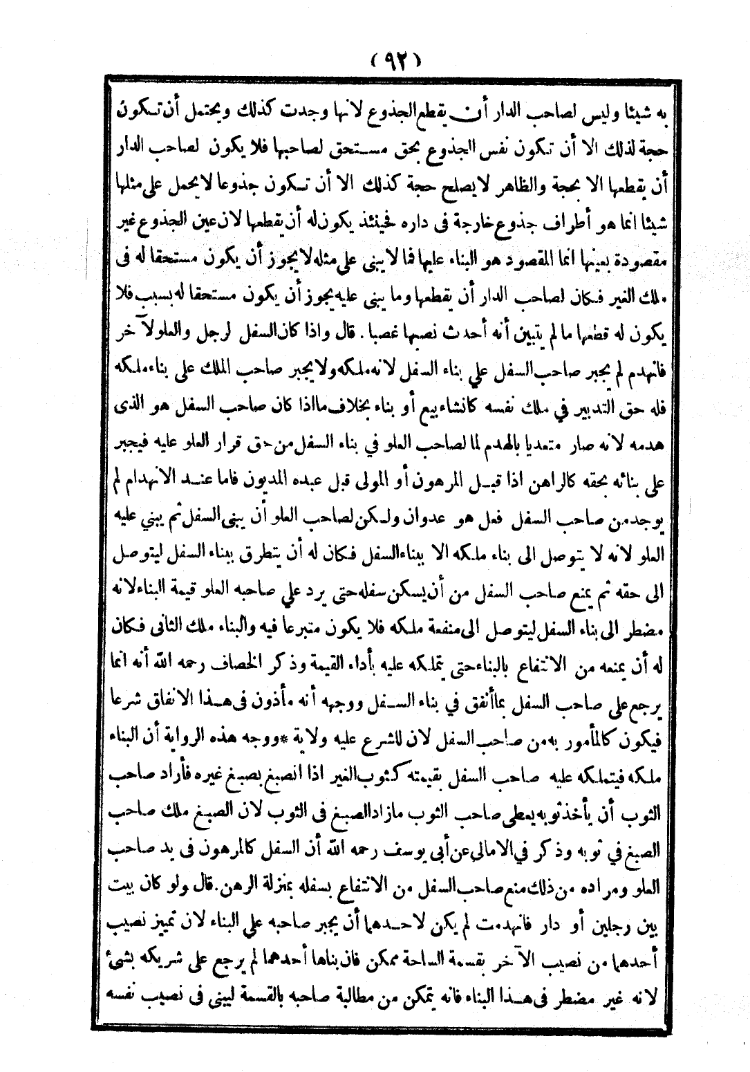 بِهِ شَيْئًا، وَلَيْسَ لِصَاحِبِ الدَّارِ أَنْ يَقْطَعَ الْجُذُوعَ؛ لِأَنَّهَا وُجِدَتْ كَذَلِكَ، وَيَحْتَمِلُ أَنْ تَكُونَ حُجَّةً لِذَلِكَ إلَّا أَنْ تَكُونَ نَفْسُ الْجُذُوعِ بِحَقٍّ مُسْتَحَقًّا لِصَاحِبِهَا فَلَا يَكُونُ لِصَاحِبِ الدَّارِ أَنْ يَقْطَعَهَا إلَّا بِحُجَّةٍ وَالظَّاهِرُ لَا يَصْلُحُ حُجَّةً كَذَلِكَ إلَّا أَنْ تَكُونَ جُذُوعًا لَا يَحْمِلُ عَلَى مِثْلِهَا شَيْئًا إنَّمَا هُوَ أَطْرَافُ جُذُوعٍ خَارِجَةٍ فِي دَارِهِ فَحِينَئِذٍ يَكُونُ لَهُ أَنْ يَقْطَعَهَا؛ لِأَنَّ عَيْنَ الْجُذُوعِ غَيْرُ مَقْصُودَةٍ بِعَيْنِهَا إنَّمَا الْمَقْصُودُ هُوَ الْبِنَاءُ عَلَيْهَا فَمَا لَا يُبْنَى عَلَى مِثْلِهِ لَا يَجُوزُ أَنْ يَكُونَ مُسْتَحَقًّا لَهُ فِي مِلْكِ الْغَيْرِ فَكَانَ لِصَاحِبِ الدَّارِ أَنْ يَقْطَعَهَا وَمَا يُبْنَى عَلَيْهِ يَجُوزُ أَنْ يَكُونَ مُسْتَحَقًّا لَهُ بِسَبَبٍ فَلَا يَكُونُ لَهُ قَطْعُهَا مَا لَمْ يَتَبَيَّنْ أَنَّهُ أَحْدَثَ نَصْبَهَا غَصْبًا