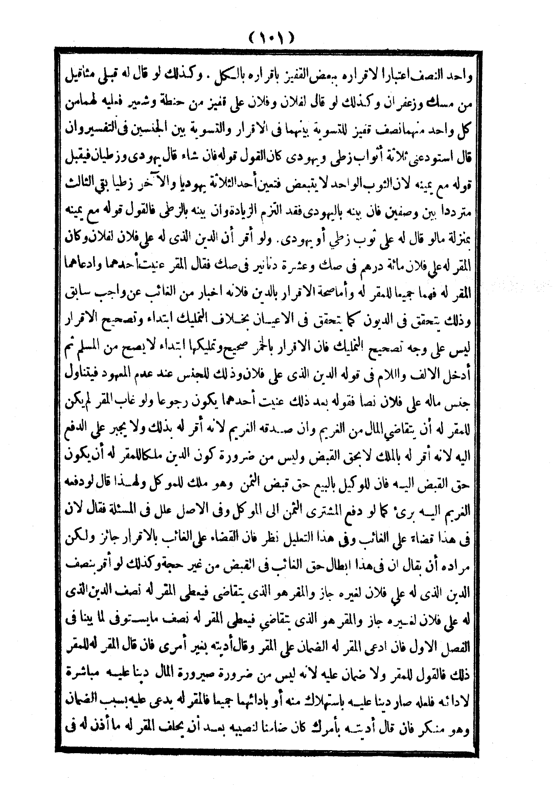 وَاحِدٍ النِّصْفُ اعْتِبَارًا لِإِقْرَارِهِ بِبَعْضِ الْقَفِيزِ بِإِقْرَارِهِ بِالْكُلِّ. وَكَذَلِكَ لَوْ قَالَ: لَهُ قِبَلِي مَثَاقِيلُ مِنْ مِسْكٍ وَزَعْفَرَانٍ. وَكَذَلِكَ لَوْ قَالَ: لِفُلَانٍ وَفُلَانٍ عَلَيَّ قَفِيزٌ مِنْ حِنْطَةٍ وَشَعِيرٍ فَعَلَيْهِ لَهُمَا مِنْ كُلِّ وَاحِدٍ مِنْهُمَا نِصْفُ قَفِيزٍ لِلتَّسْوِيَةِ بَيْنَهُمَا فِي الْإِقْرَارِ وَالتَّسْوِيَةِ بَيْنَ الْجِنْسَيْنِ فِي التَّفْسِيرِ.