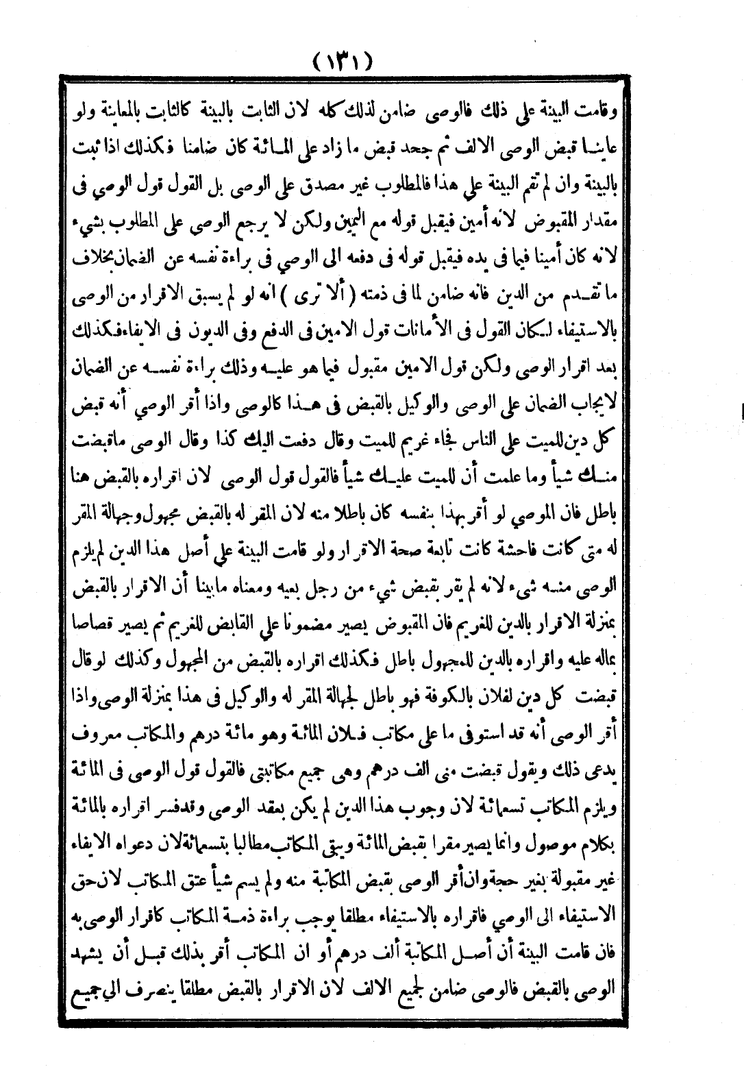 وَقَامَتْ الْبَيِّنَةُ عَلَى ذَلِكَ فَالْوَصِيُّ ضَامِنٌ لِذَلِكَ كُلِّهِ لِأَنَّ الثَّابِتَ بِالْبَيِّنَةِ كَالثَّابِتِ بِالْمُعَايَنَةِ وَلَوْ عَايَنَّا قَبْضَ الْوَصِيِّ الْأَلْفَ، ثُمَّ جَحَدَ قَبْضَ مَا زَادَ عَلَى الْمِائَةِ كَانَ ضَامِنًا فَكَذَلِكَ إذَا ثَبَتَ بِالْبَيِّنَةِ، وَإِنْ لَمْ تَقُمْ الْبَيِّنَةُ عَلَى هَذَا فَالْمَطْلُوبُ غَيْرُ مُصَدِّقٍ عَلَى الْوَصِيِّ بَلْ الْقَوْلُ قَوْلُ الْوَصِيِّ فِي مِقْدَارِ الْمَقْبُوضِ؛ لِأَنَّهُ أَمِينٌ فَيُقْبَلُ قَوْلُهُ مَعَ الْيَمِينِ، وَلَكِنْ لَا يَرْجِعُ الْوَصِيُّ عَلَى الْمَطْلُوبِ بِشَيْءٍ؛ لِأَنَّهُ كَانَ أَمِينًا فِيمَا فِي يَدِهِ فَيُقْبَلُ قَوْلُهُ فِي دَفْعِهِ إلَى الْوَصِيِّ فِي بَرَاءَةِ نَفْسِهِ عَنْ الضَّمَانِ بِخِلَافِ مَا تَقَدَّمَ مِنْ الدَّيْنِ فَإِنَّهُ ضَامِنٌ لِمَا فِي ذِمَّتِهِ.