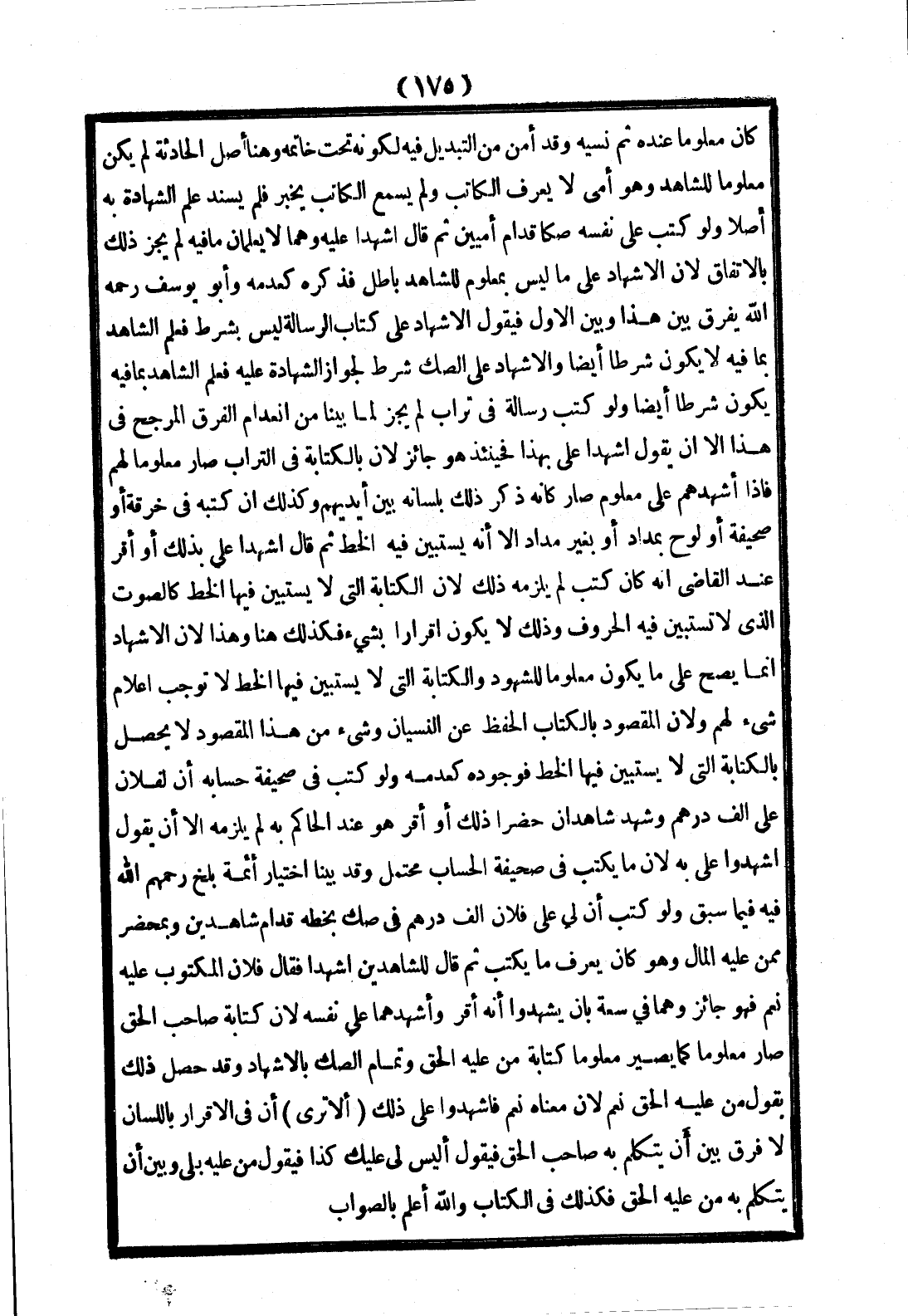 كَانَ مَعْلُومًا عِنْدَهُ، ثُمَّ نَسِيَهُ، وَقَدْ أَمِنَ مِنْ التَّبْدِيلِ فِيهِ لِكَوْنِهِ تَحْتَ خَاتِمِهِ وَهُنَا أَصْلُ الْحَادِثَةِ لَمْ يَكُنْ مَعْلُومًا لِلشَّاهِدِ، وَهُوَ أُمِّيٌّ لَا يَعْرِفُ الْكَاتِبَ، وَلَمْ يَسْمَعْ الْكَاتِبَ يُخْبِرْ فَلَمْ يُسْنَدْ عِلْمُ الشَّهَادَةِ بِهِ أَصْلًا.