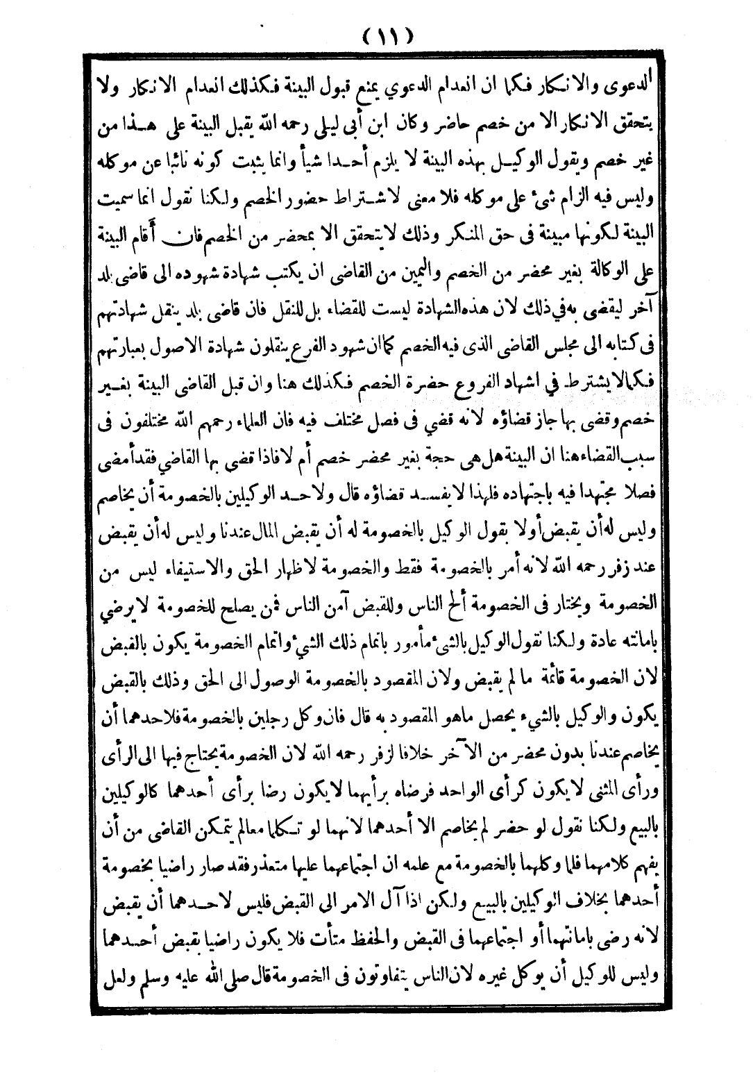 الدَّعْوَى وَالْإِنْكَارُ، فَكَمَا أَنَّ انْعِدَامَ الدَّعْوَى يَمْنَعُ قَبُولَ الْبَيِّنَةِ، فَكَذَلِكَ انْعِدَامُ الْإِنْكَارِ، وَلَا يَتَحَقَّقُ الْإِنْكَارُ إلَّا مِنْ خَصْمٍ حَاضِرٍ، وَكَانَ ابْنُ أَبِي لَيْلَى - رَحِمَهُ اللَّهُ - يَقْبَلُ الْبَيِّنَةَ عَلَى هَذَا مِنْ غَيْرِ خَصْمٍ، وَيَقُولُ: الْوَكِيلُ بِهَذِهِ الْبَيِّنَةِ لَا يُلْزِمُ أَحَدًا شَيْئًا، وَإِنَّمَا يَثْبُتُ كَوْنُهُ نَائِبًا عَنْ مُوَكِّلِهِ، وَلَيْسَ فِيهِ إلْزَامُ شَيْءٍ عَلَى مُوَكِّلِهِ فَلَا مَعْنَى لِاشْتِرَاطِ حُضُورِ الْخَصْمِ، وَلَكِنَّا نَقُولُ إنَّمَا سُمِّيَتْ: الْبَيِّنَةَ، لِكَوْنِهَا مُبَيِّنَةً فِي حَقِّ الْمُنْكِرِ، وَذَلِكَ لَا يَتَحَقَّقُ إلَّا بِمَحْضَرٍ مِنْ الْخَصْمِ، فَإِنْ أَقَامَ الْبَيِّنَةَ عَلَى الْوَكَالَةِ بِغَيْرِ مَحْضَرٍ مِنْ الْخَصْمِ - وَالْيَمِينُ مِنْ الْقَاضِي - أَنْ يَكْتُبَ شَهَادَةَ شُهُودِهِ إلَى قَاضِي بَلَدٍ يَنْقُلُ شَهَادَتَهُمْ فِي كِتَابِهِ إلَى مَجْلِسِ الْقَاضِي الَّذِي فِيهِ الْخَصْمُ، كَمَا أَنَّ شُهُودَ الْفَرْعِ يَنْقُلُونَ شَهَادَةَ الْأُصُولِ بِعِبَارَتِهِمْ، فَكَمَا لَا يُشْتَرَطُ فِي إشْهَادِ الْفُرُوعِ حَضْرَةُ الْخَصْمِ، فَكَذَلِكَ هُنَا، وَإِنْ قَبِلَ الْقَاضِي الْبَيِّنَةَ بِغَيْرِ خَصْمٍ وَقَضَى بِهَا جَازَ قَضَاؤُهُ؛ لِأَنَّهُ قَضَى فِي فَصْلٍ مُخْتَلَفٍ فِيهِ، فَإِنَّ الْعُلَمَاءَ - رَحِمَهُمُ اللَّهُ - مُخْتَلِفُونَ فِي سَبَبِ الْقَضَاءِ هُنَا: أَنَّ الْبَيِّنَةَ هَلْ هِيَ حُجَّةٌ بِغَيْرِ مَحْضَرِ خَصْمٍ أَمْ لَا؟ فَإِذَا قَضَى بِهَا الْقَاضِي فَقَدْ أَمْضَى فَصْلًا مُجْتَهِدًا فِيهِ بِاجْتِهَادِهِ، فَلِهَذَا لَا يَفْسُدُ قَضَاؤُهُ، قَالَ: وَلِأَحَدِ الْوَكِيلَيْنِ بِالْخُصُومَةِ أَنْ يُخَاصِمَ، وَلَيْسَ لَهُ أَنْ يَقْبِضَ أَوَّلًا بِقَوْلِ الْوَكِيلِ بِالْخُصُومَةِ، لَهُ أَنْ يَقْبِضَ الْمَالَ عِنْدَنَا، وَلَيْسَ لَهُ أَنْ يَقْبِضَ عِنْدَ زُفَرَ - رَحِمَهُ اللَّهُ - لِأَنَّهُ أَمْرٌ بِالْخُصُومَةِ فَقَطْ، وَالْخُصُومَةُ لِإِظْهَارِ الْحَقِّ، وَالِاسْتِيفَاءُ لَيْسَ مِنْ الْخُصُومَةِ، وَيَخْتَارُ فِي الْخُصُومَةِ أَلَحَّ النَّاسِ، وَلِلْقَبْضِ آمَنَ النَّاسِ، فَمَنْ يَصْلُحُ لِلْخُصُومَةِ لَا يُرْضَى بِأَمَانَتِهِ عَادَةً، وَلَكِنَّا نَقُولُ: الْوَكِيلُ بِالشَّيْءِ مَأْمُورٌ بِإِتْمَامِ ذَلِكَ الشَّيْءِ، وَإِتْمَامُ الْخُصُومَةِ يَكُونُ بِالْقَبْضِ؛ لِأَنَّ الْخُصُومَةَ قَائِمَةٌ مَا لَمْ يَقْبِضْ، وَلِأَنَّ الْمَقْصُودَ بِالْخُصُومَةِ الْوُصُولُ إلَى الْحَقِّ وَذَلِكَ بِالْقَبْضِ يَكُونُ، وَالْوَكِيلُ بِالشَّيْءِ يُحَصِّلُ مَا هُوَ الْمَقْصُودُ بِهِ.