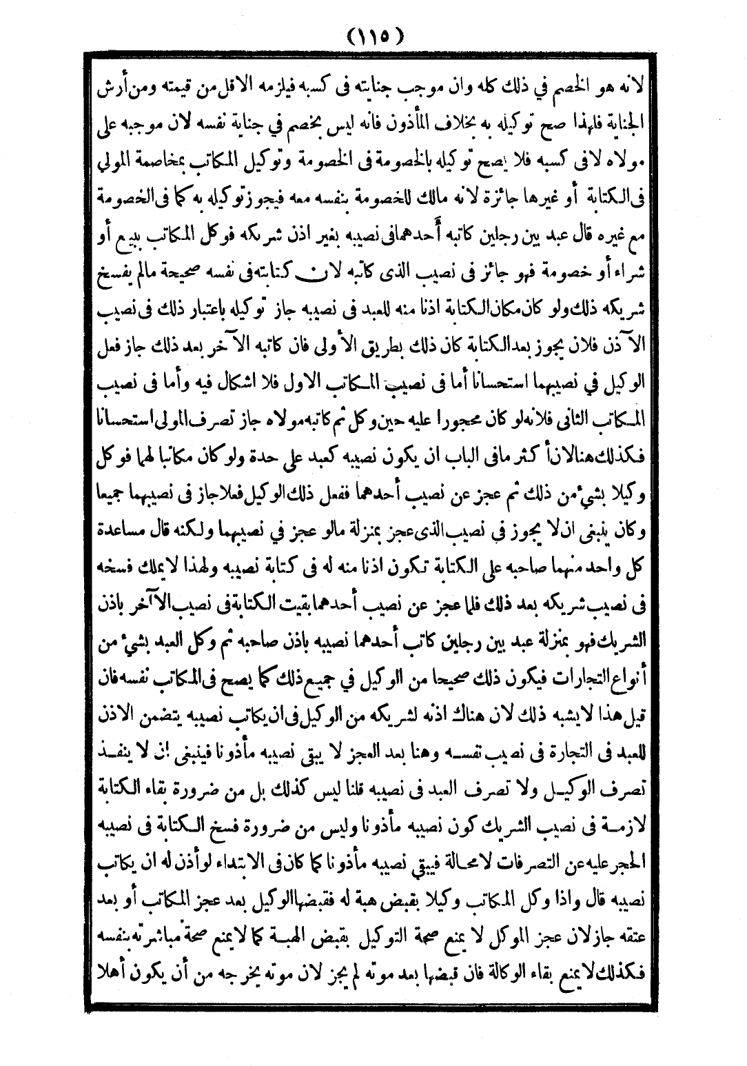 قَالَ عَبْدٌ بَيْنَ رَجُلَيْنِ كَاتَبَهُ أَحَدُهُمَا فِي نَصِيبِهِ بِغَيْرِ إذْنِ شَرِيكِهِ فَوَكَّلَ الْمُكَاتَبَ بِبَيْعٍ أَوْ شِرَاءٍ أَوْ خُصُومَةٍ فَهُوَ جَائِزٌ فِي نَصِيبِ الَّذِي كَاتَبَهُ لِأَنَّ كِتَابَتَهُ فِي نَفْسِهِ صَحِيحَةٌ مَا لَمْ يَفْسَخْ شَرِيكُهُ ذَلِكَ وَلَوْ كَانَ مَكَانَ الْكِتَابَةِ إذْنًا مِنْهُ لِلْعَبْدِ فِي نَصِيبِهِ جَازَ تَوْكِيلُهُ بِاعْتِبَارِ ذَلِكَ فِي نَصِيبِ الْآذِنِ فَلَأَنْ يَجُوزَ بَعْدَ الْكِتَابَةِ كَانَ ذَلِكَ بِطَرِيقِ الْأَوْلَى فَإِنْ كَاتَبَهُ الْآخَرُ بَعْدَ ذَلِكَ جَازَ فِعْلُ الْوَكِيلِ فِي نَصِيبِهِمَا اسْتِحْسَانًا أَمَّا فِي نَصِيبِ الْمُكَاتَبِ الْأَوَّلِ فَلَا إشْكَالَ فِيهِ وَأَمَّا فِي نَصِيبِ الْمُكَاتَبِ الثَّانِي فَلِأَنَّهُ لَوْ كَانَ مَحْجُورًا عَلَيْهِ حِينَ وُكِّلَ ثُمَّ كَاتَبَهُ مَوْلَاهُ جَازَ تَصَرُّفُ الْمَوْلَى اسْتِحْسَانًا فَكَذَلِكَ هُنَا لِأَنَّ أَكْثَرَ مَا فِي الْبَابِ أَنْ يَكُونَ نَصِيبُهُ كَعَبْدٍ عَلَى حِدَةٍ وَلَوْ كَانَ مُكَاتَبًا لَهُمَا فَوَكَّلَ وَكِيلًا بِشَيْءٍ مِنْ ذَلِكَ ثُمَّ عَجَزَ عَنْ نَصِيبِ أَحَدِهِمَا فَفَعَلَ ذَلِكَ الْوَكِيلُ فِعْلًا جَازَ فِي نَصِيبِهِمَا جَمِيعًا وَكَانَ يَنْبَغِي أَنْ لَا يَجُوزَ فِي نَصِيبِ الَّذِي عَجَزَ بِمَنْزِلَةِ مَا لَوْ عَجَزَ فِي نَصِيبِهِمَا وَلَكِنَّهُ قَالَ مُسَاعَدَةُ كُلِّ وَاحِدٍ مِنْهُمَا صَاحِبَهُ عَلَى الْكِتَابَةِ تَكُونُ إذْنًا مِنْهُ لَهُ فِي كِتَابَةِ نَصِيبِهِ وَلِهَذَا لَا يَمْلِكُ فَسْخَهُ فِي نَصِيبِ شَرِيكِهِ بَعْدَ ذَلِكَ فَلَمَّا عَجَزَ عَنْ نَصِيبِ أَحَدِهِمَا بَقِيَتْ الْكِتَابَةُ فِي نَصِيبِ الْآخَرِ بِإِذْنِ الشَّرِيكِ فَهُوَ بِمَنْزِلَةِ عَبْدٍ بَيْنَ رَجُلَيْنِ كَاتَبَ أَحَدُهُمَا نَصِيبَهُ بِإِذْنِ صَاحِبِهِ ثُمَّ وَكَّلَ الْعَبْدَ بِشَيْءٍ مِنْ أَنْوَاعِ التِّجَارَاتِ فَيَكُونُ ذَلِكَ صَحِيحًا مِنْ الْوَكِيلِ فِي جَمِيعِ ذَلِكَ كَمَا يَصِحُّ فِي الْمُكَاتَبِ نَفْسِهِ.