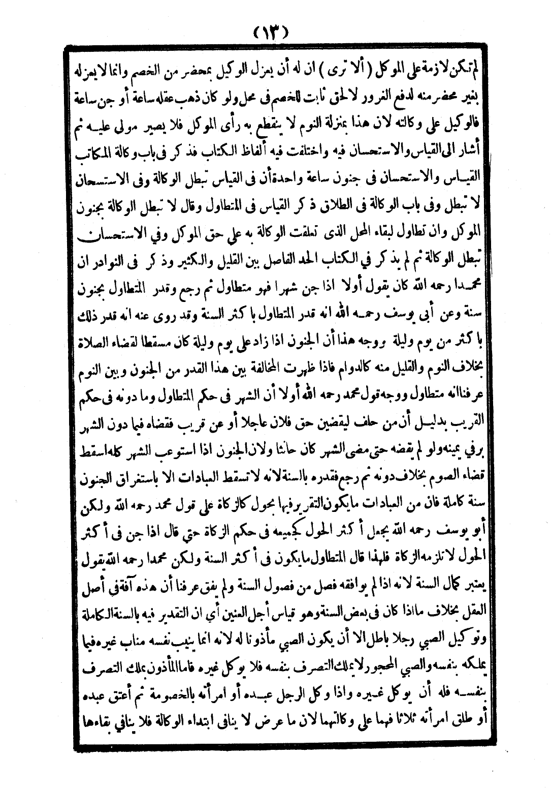 لَمْ تَكُنْ لَازِمَةً عَلَى الْمُوَكِّلِ، أَلَا تَرَى أَنَّ لَهُ أَنْ يَعْزِلَ الْوَكِيلَ بِمَحْضَرٍ مِنْ الْخَصْمِ، وَإِنَّمَا لَا يَعْزِلُهُ بِغَيْرِ مَحْضَرٍ مِنْهُ لِدَفْعِ الْغُرُورِ، لَا لِحَقٍّ ثَابِتٍ لِلْخَصْمِ فِي مَحَلٍّ، وَلَوْ كَانَ ذَهَبَ عَقْلُهُ سَاعَةً، أَوْ جُنَّ سَاعَةً فَالْوَكِيلُ عَلَى وَكَالَتِهِ؛ لِأَنَّ هَذَا بِمَنْزِلَةِ النَّوْمِ لَا يَنْقَطِعُ بِهِ رَأْيُ الْمُوَكِّلِ، فَلَا يَصِيرُ مُوَلًّى عَلَيْهِ، ثُمَّ أَشَارَ إلَى الْقِيَاسِ وَالِاسْتِحْسَانِ فِيهِ، وَاخْتَلَفَتْ فِيهِ أَلْفَاظُ الْكِتَابِ، فَذَكَرَ فِي بَابِ وَكَالَةِ الْمُكَاتَبِ، الْقِيَاسَ وَالِاسْتِحْسَانَ فِي جُنُونِ سَاعَةٍ وَاحِدَةٍ: أَنَّ فِي الْقِيَاسِ تَبْطُلُ الْوَكَالَةُ، وَفِي الِاسْتِحْسَانِ لَا تَبْطُلُ، وَفِي بَابِ الْوَكَالَةِ فِي الطَّلَاقِ ذَكَرَ الْقِيَاسَ فِي الْمُتَطَاوِلِ، وَقَالَ: " لَا تَبْطُلُ الْوَكَالَةُ بِجُنُونِ الْمُوَكِّلِ، وَإِنْ تَطَاوَلَ لِبَقَاءِ الْمَحَلِّ الَّذِي تَعَلَّقَتْ الْوَكَالَةُ بِهِ عَلَى حَقِّ الْمُوَكِّلِ، وَفِي الِاسْتِحْسَانِ تَبْطُلُ الْوَكَالَةُ " ثُمَّ لَمْ يَذْكُرْ فِي الْكِتَابِ الْحَدَّ الْفَاصِلَ بَيْنَ الْقَلِيلِ وَالْكَثِيرِ.