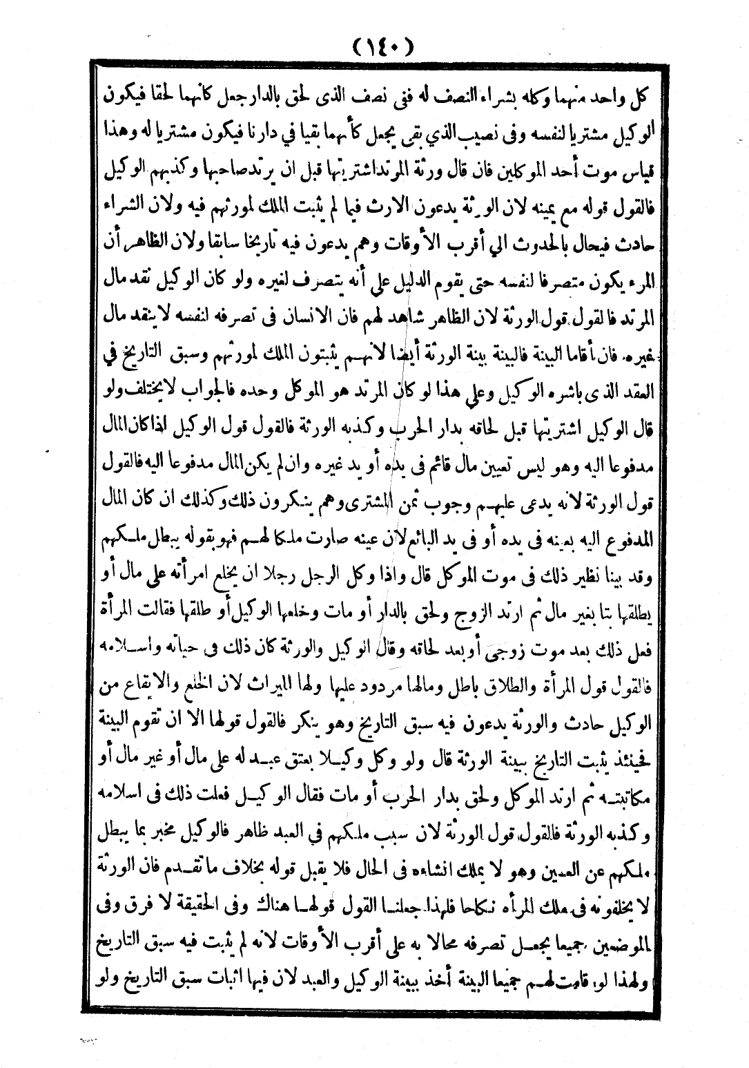 كُلَّ وَاحِدٍ مِنْهُمَا وَكَّلَهُ بِشِرَاءِ النِّصْفِ لَهُ، فَفِي نَصِفْ الَّذِي لَحِقَ بِالدَّارِ جُعِلَ كَأَنَّهُمَا لَحِقَا فَيَكُونُ الْوَكِيلُ مُشْتَرِيًا لِنَفْسِهِ وَفِي نَصِيبِ الَّذِي بَقِيَ يُجْعَلُ كَأَنَّهُمَا فِي دَارِنَا فَيَكُونُ مُشْتَرِيًا لَهُ وَهَذَا قِيَاسُ مَوْتِ أَحَدِ الْمُوَكِّلَيْنِ، فَإِنْ قَالَ وَرَثَةُ الْمُرْتَدِّ اشْتَرَيْتهَا قَبْلَ أَنْ يَرْتَدَّ صَاحِبُهَا وَكَذَّبَهُمْ الْوَكِيلُ فَالْقَوْلُ قَوْلُهُ مَعَ يَمِينِهِ لِأَنَّ الْوَرَثَةَ يَدَّعُونَ الْإِرْثَ فِيمَا لَمْ يَثْبُتْ الْمِلْكُ لِمُوَرِّثِهِمْ فِيهِ، وَلِأَنَّ الشِّرَاءَ حَادِثٌ فَيُحَالُ بِالْحُدُوثِ إلَى أَقْرَبِ الْأَوْقَاتِ وَهُمْ يَدَّعُونَ فِيهِ تَارِيخًا سَابِقًا، وَلِأَنَّ الظَّاهِرَ أَنَّ الْمَرْءَ يَكُونُ مُتَصَرِّفًا لِنَفْسِهِ حَتَّى يَقُومَ الدَّلِيلُ عَلَى أَنَّهُ يَتَصَرَّفُ لِغَيْرِهِ، وَلَوْ كَانَ الْوَكِيلُ نَقَدَ مَالَ الْمُرْتَدِّ فَالْقَوْلُ قَوْلُ الْوَرَثَةِ لِأَنَّ الظَّاهِرَ شَاهِدٌ لَهُمْ فَإِنَّ الْإِنْسَانَ فِي تَصَرُّفِهِ لِنَفْسِهِ لَا يَنْقُدُ مَالَ غَيْرِهِ، فَإِنْ أَقَامَا الْبَيِّنَةَ فَالْبَيِّنَةُ بَيِّنَةُ الْوَرَثَةِ أَيْضًا لِأَنَّهُمْ يُثْبِتُونَ الْمِلْكَ لِمُوَرِّثِهِمْ وَسَبَقَ التَّارِيخُ فِي الْعَقْدِ الَّذِي بَاشَرَهُ الْوَكِيلُ، وَعَلَى هَذَا لَوْ كَانَ الْمُرْتَدُّ هُوَ الْمُوَكِّلُ وَحْدَهُ فَالْجَوَابُ لَا يَخْتَلِفُ وَلَوْ قَالَ الْوَكِيلُ اشْتَرَيْتهَا قَبْلَ لِحَاقِهِ بِدَارِ الْحَرْبِ وَكَذَّبَهُ الْوَرَثَةُ فَالْقَوْلُ قَوْلُ الْوَكِيلِ إذَا كَانَ الْمَالُ مَدْفُوعًا إلَيْهِ وَهُوَ لَيْسَ تَعْيِينُ مَالٍ قَائِمٍ فِي يَدِهِ أَوْ يَدِ غَيْرِهِ، وَإِنْ لَمْ يَكُنْ الْمَالُ مَدْفُوعًا إلَيْهِ فَالْقَوْلُ قَوْلُ الْوَرَثَةِ لِأَنَّهُ يَدَّعِي عَلَيْهِمْ وُجُوبَ ثَمَنِ الْمُشْتَرَى وَهُمْ يُنْكِرُونَ ذَلِكَ وَكَذَلِكَ إنْ كَانَ الْمَالُ الْمَدْفُوعُ إلَيْهِ بِعَيْنِهِ فِي يَدِهِ أَوْ فِي يَدِ الْبَائِعِ لِأَنَّ عَيْنَهُ صَارَتْ مِلْكًا لَهُمْ فَهُوَ بِقَوْلِهِ يُبْطِلُ مِلْكَهُمْ وَقَدْ بَيَّنَّا نَظِيرَ ذَلِكَ فِي مَوْتِ الْمُوَكِّلِ