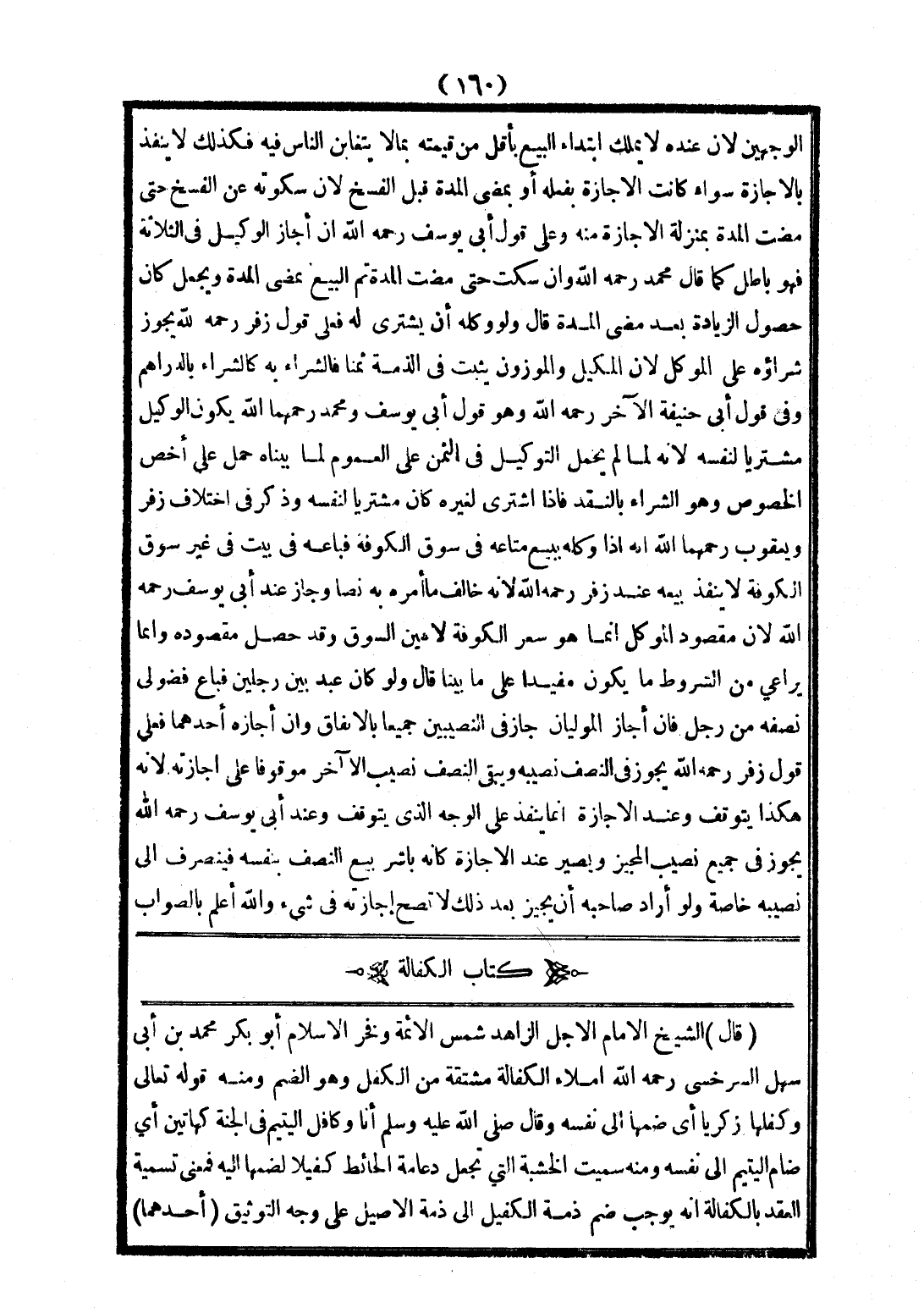 (قَالَ) الشَّيْخُ الْإِمَامُ الْأَجَلُّ الزَّاهِدُ شَمْسُ الْأَئِمَّةِ وَفَخْرُ الْإِسْلَامِ أَبُو بَكْرٍ مُحَمَّدُ بْنُ أَبِي سَهْلٍ السَّرَخْسِيُّ - رَحِمَهُ اللَّهُ - إمْلَاءً الْكَفَالَةُ مُشْتَقَّةٌ مِنْ الْكِفْلِ وَهُوَ الضَّمُّ وَمِنْهُ قَوْله تَعَالَى {وَكَفَّلَهَا زَكَرِيَّا} [آل عمران: 37] أَيْ: ضَمَّهَا إلَى نَفْسِهِ وَقَالَ - صَلَّى اللَّهُ عَلَيْهِ وَسَلَّمَ - «أَنَا وَكَافِلُ الْيَتِيمِ فِي الْجَنَّةِ كَهَاتَيْنِ» أَيْ ضَامُّ الْيَتِيمِ إلَى نَفْسِهِ وَمِنْهُ سُمِّيَتْ الْخَشَبَةُ الَّتِي تُجْعَلُ دِعَامَةَ الْحَائِطِ كَفِيلًا لِضَمِّهَا إلَيْهِ فَمَعْنَى تَسْمِيَةِ الْعَقْدِ بِالْكَفَالَةِ أَنَّهُ يُوجِبُ ضَمَّ ذِمَّةِ الْكَفِيلِ إلَى ذِمَّةِ الْأَصِيلِ عَلَى وَجْهِ التَّوْثِيقِ (أَحَدُهُمَا)
