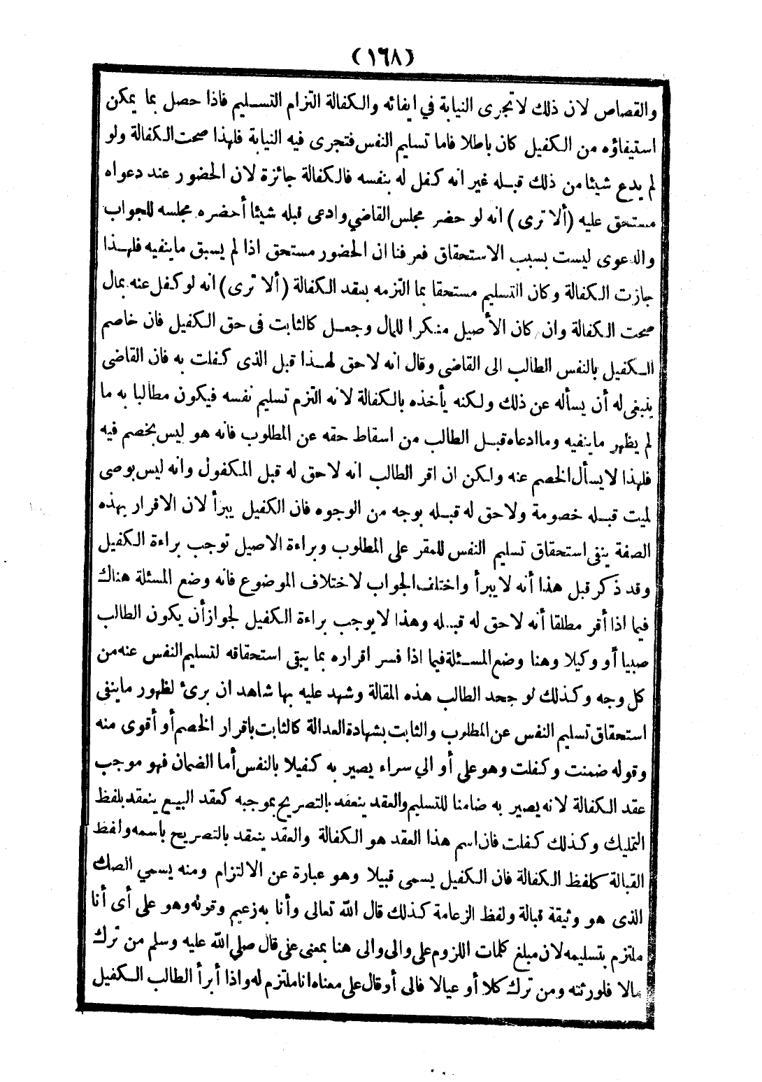 وَالْقِصَاصِ لِأَنَّ ذَلِكَ لَا تُجْرَى النِّيَابَةُ فِي إيفَائِهِ وَالْكَفَالَةُ الْتِزَامُ التَّسْلِيمِ فَإِذَا حَصَلَ بِمَا يُمْكِنُ اسْتِيفَاؤُهُ مِنْ الْكَفِيلِ؛ كَانَ بَاطِلًا. فَأَمَّا تَسْلِيمُ النَّفْسِ فَتُجْرَى فِيهِ النِّيَابَةُ فَلِهَذَا صَحَّتْ الْكَفَالَةُ وَلَوْ لَمْ يَدَّعِ شَيْئًا مِنْ ذَلِكَ قِبَلَهُ. غَيْرَ أَنَّهُ كَفَلَ لَهُ، بِنَفْسِهِ فَالْكَفَالَةُ جَائِزَةٌ؛ لِأَنَّ الْحُضُورَ عِنْدَ دَعْوَاهُ مُسْتَحَقٌّ عَلَيْهِ. (أَلَا تَرَى) أَنَّهُ لَوْ حَضَرَ مَجْلِسَ الْقَاضِي وَادَّعَى قِبَلَهُ شَيْئًا أَحْضَرَهُ مَجْلِسَهُ لِلْجَوَابِ وَالدَّعْوَى لَيْسَتْ بِسَبَبِ الِاسْتِحْقَاقِ فَعَرَفْنَا أَنَّ الْحُضُورَ مُسْتَحَقٌّ إذَا لَمْ يَسْبِقْ مَا يَنْفِيه؛ فَلِهَذَا جَازَتْ الْكَفَالَةُ وَكَانَ التَّسْلِيمُ مُسْتَحَقًّا فَعَرَفْنَا أَنَّ الْحُضُورَ مُسْتَحَقٌّ إذَا لَمْ يَسْبِقْ مَا يَنْفِيه فَلِهَذَا جَازَتْ الْكَفَالَةُ وَكَانَ التَّسْلِيمُ مُسْتَحَقًّا بِمَا الْتَزَمَهُ بِعَقْدِ الْكَفَالَةِ.