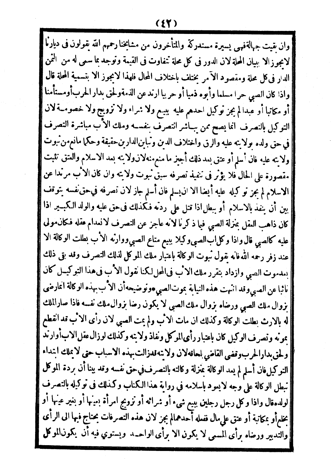 قَالَ وَإِذَا كَانَ الصَّبِيُّ حُرًّا مُسْلِمًا، وَأَبُوهُ ذِمِّيًّا أَوْ حَرْبِيًّا ارْتَدَّ عَنْ الذِّمَّةِ وَلَحِقَ بِدَارُ الْحَرْبِ، أَوْ مُسْتَأْمَنًا أَوْ مُكَاتَبًا أَوْ عَبْدًا لَمْ يَجُزْ تَوْكِيلُ أَحَدِهِمْ عَلَيْهِ بِبَيْعٍ وَلَا شِرَاءٍ وَلَا تَزْوِيجٍ وَلَا خُصُومَةٍ؛ لِأَنَّ التَّوْكِيلَ بِالتَّصَرُّفِ إنَّمَا يَصِحُّ مِمَّنْ يُبَاشِرُ التَّصَرُّفَ بِنَفْسِهِ، وَمَلَكَ الْأَبُ مُبَاشَرَةَ التَّصَرُّفِ فِي حَقِّ وَلَدِهِ بِوِلَايَتِهِ عَلَيْهِ، وَالرِّقُّ وَاخْتِلَافُ الدِّينِ، وَتَبَايُنُ الدَّارَيْنِ حَقِيقَةً وَحُكْمًا مَانِعٌ مِنْ ثُبُوتِ وِلَايَتِهِ عَلَيْهِ، فَإِنْ أَسْلَمَ أَوْ عَتَقَ بَعْدَ ذَلِكَ أُجِيزَ مَا مُنِعَ مِنْهُ؛ لِأَنَّ وِلَايَتَهُ بَعْدَ الْإِسْلَامِ وَالْعِتْقِ تَثْبُتُ مَقْصُورَةً عَلَى الْحَالِ، فَلَا يُؤَثِّرُ فِي تَنْفِيذِ تَصَرُّفِهِ سَبْقُ ثُبُوتِ وِلَايَتِهِ، وَإِنْ كَانَ الْأَبُ مُرْتَدًّا عَنْ الْإِسْلَامِ لَمْ يَجُزْ تَوْكِيلُهُ عَلَيْهِ أَيْضًا إلَّا أَنْ يُسْلِمَ، فَإِنْ أَسْلَمَ جَازَ؛ لِأَنَّ تَصَرُّفَهُ فِي حَقِّ نَفْسِهِ يَتَوَقَّفُ بَيْنَ أَنْ يَنْفُذَ بِالْإِسْلَامِ أَوْ يَبْطُلَ إذَا قُتِلَ عَلَى رِدَّتِهِ، فَكَذَلِكَ فِي حَقٍّ عَلَيْهِ، وَالْوَلَدُ الْكَبِيرُ إذَا كَانَ ذَاهِبَ الْعَقْلِ بِمَنْزِلَةِ الصَّبِيِّ فِيمَا ذَكَرْنَا؛ لِأَنَّهُ عَاجِزٌ عَنْ التَّصَرُّفِ لِانْعِدَامِ عَقْلِهِ، فَكَانَ مُوَلًّى عَلَيْهِ كَالصَّبِيِّ