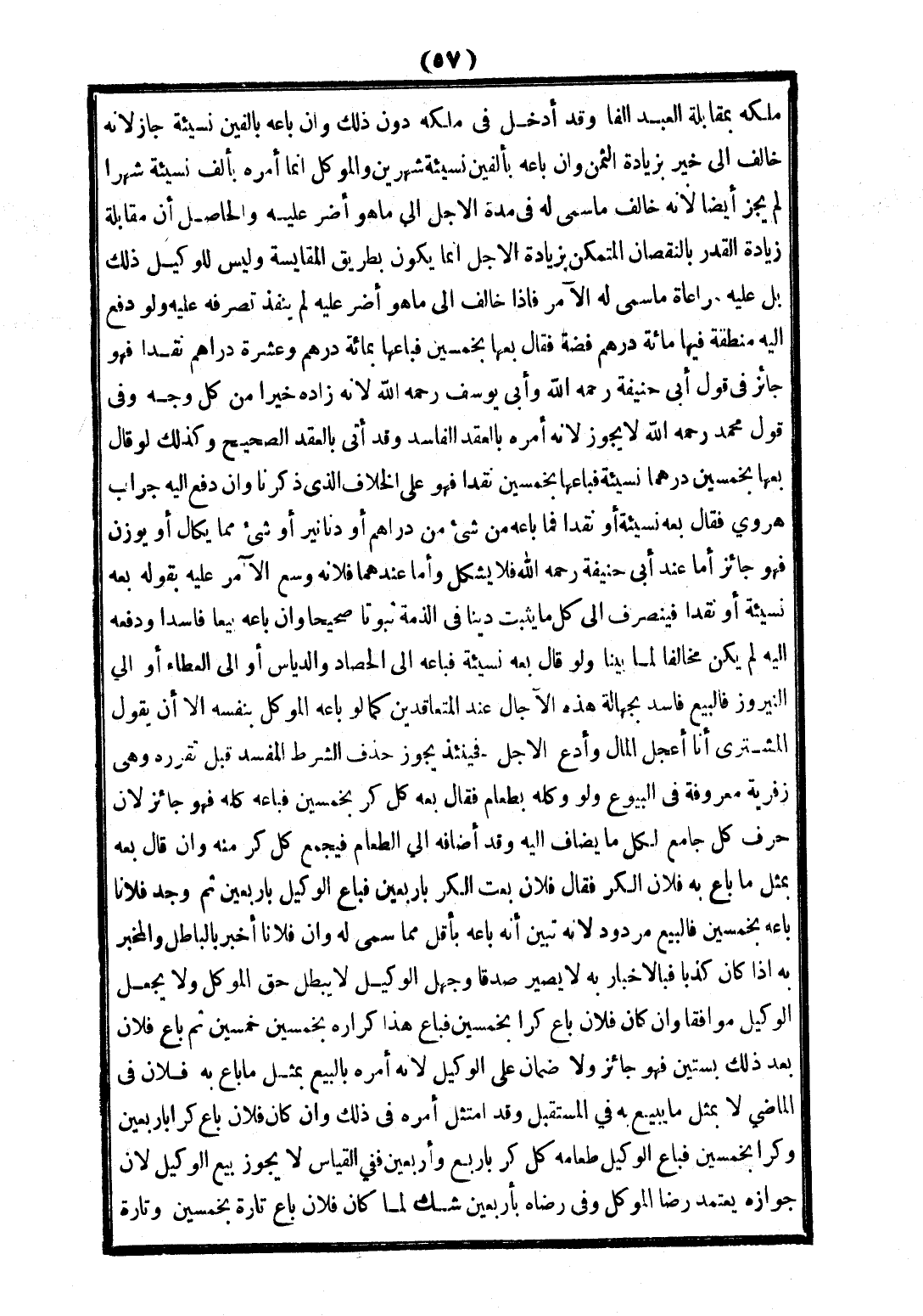 مِلْكِهِ بِمُقَابَلَةِ الْعَبْدِ أَلْفًا، وَقَدْ أَدْخَلَ فِي مِلْكِهِ دُونَ ذَلِكَ، وَإِنْ بَاعَهُ بِأَلْفَيْنِ نَسِيئَةً؛ جَازَ؛ لِأَنَّهُ خَالَفَ إلَى خَيْرٍ بِزِيَادَةِ الثَّمَنِ، وَإِنْ بَاعَهُ بِأَلْفَيْنِ نَسِيئَةً شَهْرَيْنِ، وَالْمُوَكِّلُ إنَّمَا أَمَرَهُ بِأَلْفٍ نَسِيئَةً شَهْرًا - لَمْ يَجُزْ أَيْضًا؛ لِأَنَّهُ خَالَفَ مَا سَمَّى لَهُ فِي مُدَّةِ الْأَجَلِ إلَى مَا هُوَ أَضَرُّ عَلَيْهِ، وَالْحَاصِلُ أَنَّ مُقَابَلَةَ زِيَادَةِ الْقَدْرِ بِالنُّقْصَانِ الْمُتَمَكِّنِ بِزِيَادَةِ الْأَجَلِ، إنَّمَا يَكُونُ بِطَرِيقِ الْمُقَايَسَةِ، وَلَيْسَ لِلْوَكِيلِ ذَلِكَ، بَلْ عَلَيْهِ مُرَاعَاةُ مَا سَمَّى لَهُ الْآمِرُ، فَإِذَا خَالَفَ إلَى مَا هُوَ أَضَرُّ عَلَيْهِ؛ لَمْ يَنْفُذْ تَصَرُّفُهُ عَلَيْهِ، وَلَوْ دَفَعَ إلَيْهِ مِنْطَقَةً فِيهَا مِائَةُ دِرْهَمٍ فِضَّةً، فَقَالَ: بِعْهَا بِخَمْسِينَ، فَبَاعَهَا بِمِائَةِ دِرْهَمٍ وَعَشَرَةِ دَرَاهِمَ نَقْدًا - فَهُوَ جَائِزٌ فِي قَوْلِ أَبِي حَنِيفَةَ - رَحِمَهُ اللَّهُ - وَأَبِي يُوسُفَ - رَحِمَهُ اللَّهُ -؛ لِأَنَّهُ زَادَهُ خَيْرًا مِنْ كُلِّ وَجْهٍ، وَفِي قَوْلِ مُحَمَّدٍ - رَحِمَهُ اللَّهُ -: لَا يَجُوزُ؛ لِأَنَّهُ أَمَرَهُ بِالْعَقْدِ الْفَاسِدِ، وَقَدْ أَتَى بِالْعَقْدِ الصَّحِيحِ، وَكَذَلِكَ لَوْ قَالَ: بِعْهَا بِخَمْسِينَ دِرْهَمًا نَسِيئَةً، فَبَاعَهَا بِخَمْسِينَ نَقْدًا فَهُوَ عَلَى الْخِلَافِ الَّذِي ذَكَرْنَا، وَإِنْ دَفَعَ إلَيْهِ جِرَابَ هَرَوِيٍّ فَقَالَ: بِعْهُ نَسِيئَةً أَوْ نَقْدًا، فَمَا بَاعَهُ مِنْ شَيْءٍ مِنْ دَرَاهِمَ، أَوْ دَنَانِيرَ، أَوْ شَيْءٍ مِمَّا يُكَالُ، أَوْ يُوزَنُ - فَهُوَ جَائِزٌ، أَمَّا عِنْدَ أَبِي حَنِيفَةَ - رَحِمَهُ اللَّهُ - فَلَا يُشْكِلُ، وَأَمَّا عِنْدَهُمَا؛ فَلِأَنَّهُ وَسَّعَ الْآمِرُ عَلَيْهِ بِقَوْلِهِ: بِعْهُ نَسِيئَةً، أَوْ نَقْدًا، فَيَنْصَرِفُ إلَى كُلِّ مَا يَثْبُتُ دَيْنًا فِي الذِّمَّةِ ثُبُوتًا صَحِيحًا، وَإِنْ بَاعَهُ بَيْعًا فَاسِدًا وَدَفَعَهُ إلَيْهِ؛ لَمْ يَكُنْ مُخَالِفًا لِمَا بَيَّنَّا، وَلَوْ قَالَ: بِعْهُ نَسِيئَةً فَبَاعَهُ إلَى الْحَصَادِ، وَالدِّيَاسِ، أَوْ إلَى الْعَطَاءِ، أَوْ إلَى النَّيْرُوزِ - فَالْبَيْعُ فَاسِدٌ بِجَهَالَةِ هَذِهِ الْآجَالِ عِنْدَ الْمُتَعَاقِدَيْنِ.