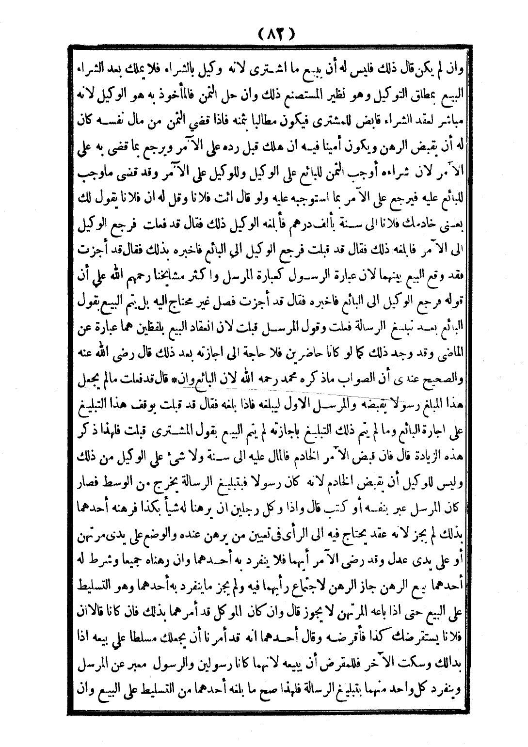 وَإِنْ لَمْ يَكُنْ قَالَ ذَلِكَ فَلَيْسَ لَهُ أَنْ يَبِيعَ مَا اشْتَرَى لِأَنَّهُ وَكِيلٌ بِالشِّرَاءِ فَلَا يَمْلِكُ بَعْدَ الشِّرَاءِ الْبَيْعَ بِمُطْلَقِ التَّوْكِيلِ وَهُوَ نَظِيرُ الْمُسْتَصْنِعِ ذَلِكَ وَإِنْ حَلَّ الثَّمَنُ فَالْمَأْخُوذُ بِهِ هُوَ الْوَكِيلُ لِأَنَّهُ مُبَاشِرٌ لِعَقْدِ الشِّرَاءِ قَابِضٌ لِلْمُشْتَرِي فَيَكُونُ مُطَالَبًا بِثَمَنِهِ فَإِذَا قَضَى الثَّمَنَ مِنْ مَالِ نَفْسِهِ كَانَ لَهُ أَنْ يَقْبِضَ الرَّهْنَ وَيَكُونَ أَمِينًا فِيهِ إنْ هَلَكَ قَبْلَ رَدِّهِ عَلَى الْآمِرِ وَيَرْجِعُ بِمَا قَضَى بِهِ عَلَى الْآمِرِ لِأَنَّ شِرَاءَهُ أَوْجَبَ الثَّمَنَ لِلْبَائِعِ عَلَى الْوَكِيلِ وَلِلْوَكِيلِ عَلَى الْآمِرِ وَقَدْ قَضَى مَا وَجَبَ لِلْبَائِعِ عَلَيْهِ فَيَرْجِعُ عَلَى الْآمِرِ بِمَا اسْتَوْجَبَهُ عَلَيْهِ وَلَوْ قَالَ ائْتِ فُلَانًا وَقُلْ لَهُ إنَّ فُلَانًا يَقُولُ لَك بِعْنِي خَادِمَك فُلَانًا إلَى سَنَةٍ بِأَلْفِ دِرْهَمٍ فَأَبْلَغَهُ الْوَكِيلُ ذَلِكَ فَقَالَ قَدْ فَعَلْت فَرَجَعَ الْوَكِيلُ إلَى الْآمِرِ فَأَبْلَغَهُ ذَلِكَ فَقَالَ قَدْ قَبِلْت فَرَجَعَ الْوَكِيلُ إلَى الْبَائِعِ فَأَخْبَرَهُ بِذَلِكَ فَقَالَ قَدْ أَجَزْت فَقَدْ وَقَعَ الْبَيْعُ بَيْنَهُمَا لِأَنَّ عِبَارَةَ الرَّسُولِ كَعِبَارَةِ الْمُرْسِلِ وَأَكْثَرُ مَشَايِخِنَا رَحِمَهُمْ اللَّهُ عَلَى أَنَّ قَوْلَهُ فَرَجَعَ الْوَكِيلُ إلَى الْبَائِعِ فَأَخْبَرَهُ فَقَالَ قَدْ أَجَزْت فَصْلَ غَيْرُ مُحْتَاجٍ إلَيْهِ بَلْ يَتِمُّ الْبَيْعُ بِقَوْلِ الْبَائِعِ بَعْدَ تَبْلِيغِ الرِّسَالَةِ فَعَلْت وَقَوْلِ الْمُرْسِلِ قَبِلْت لِأَنَّ انْعِقَادَ الْبَيْعِ بِلَفْظَيْنِ هُمَا عِبَارَةٌ عَنْ الْمَاضِي وَقَدْ وُجِدَ ذَلِكَ كَمَا لَوْ كَانَا حَاضِرَيْنِ فَلَا حَاجَةَ إلَى إجَازَتِهِ بَعْدَ ذَلِكَ
