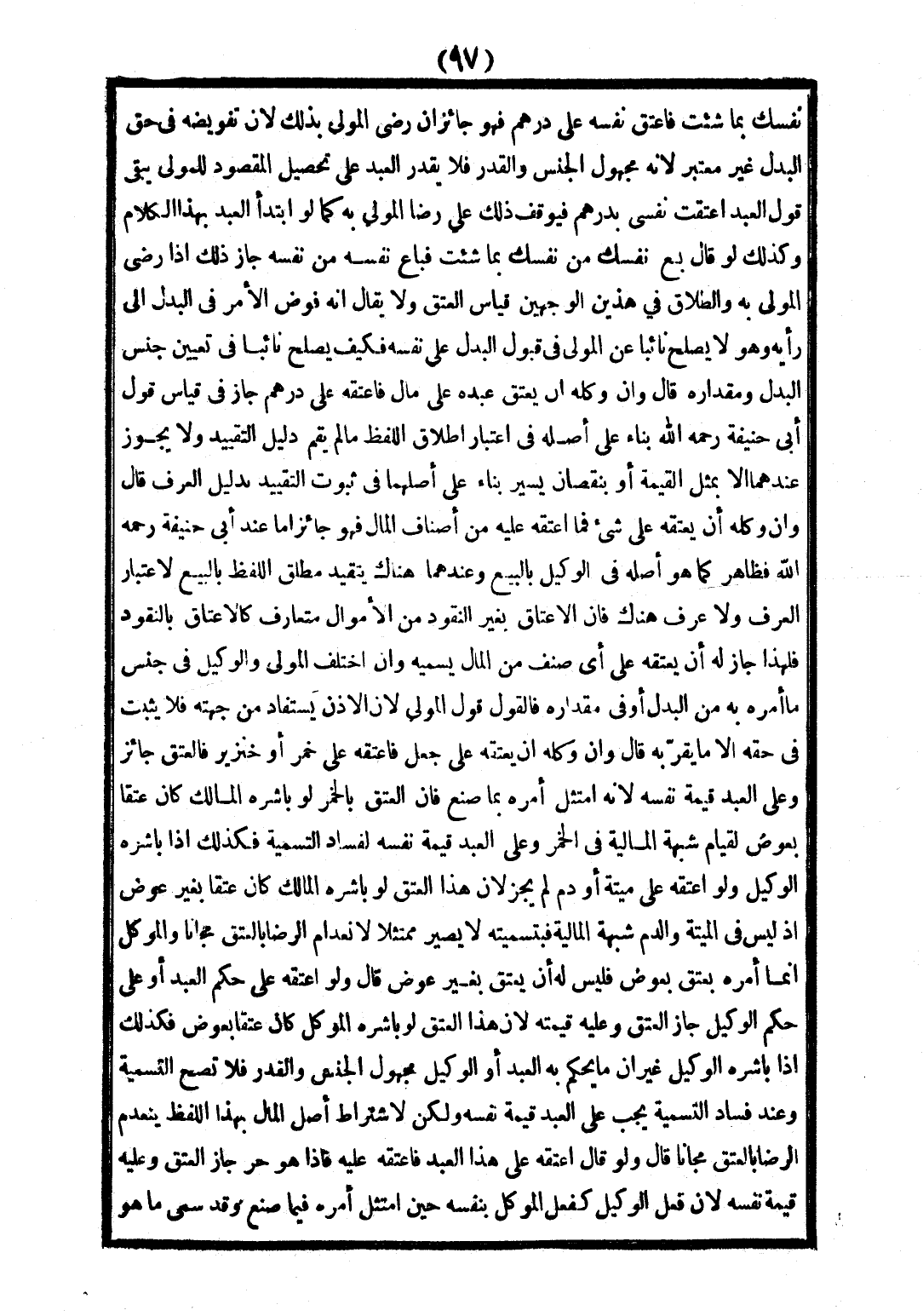 قَالَ وَإِنْ وَكَّلَهُ أَنْ يُعْتِقَ عَبْدَهُ عَلَى مَالِ فَأَعْتَقَهُ عَلَى دِرْهَمٍ جَازَ فِي قِيَاسِ قَوْلِ أَبِي حَنِيفَةَ - رَحِمَهُ اللَّهُ - بِنَاءً عَلَى أَصْلِهِ فِي اعْتِبَارِ إطْلَاقِ اللَّفْظِ مَا لَمْ يَقُمْ دَلِيلُ التَّقْيِيدِ وَلَا يَجُوزُ عِنْدَهُمَا إلَّا بِمِثْلِ الْقِيمَةِ أَوْ بِنُقْصَانٍ يَسِيرٍ بِنَاءً عَلَى أَصْلِهِمَا فِي ثُبُوتِ التَّقْيِيدِ بِدَلِيلِ الْعُرْفِ