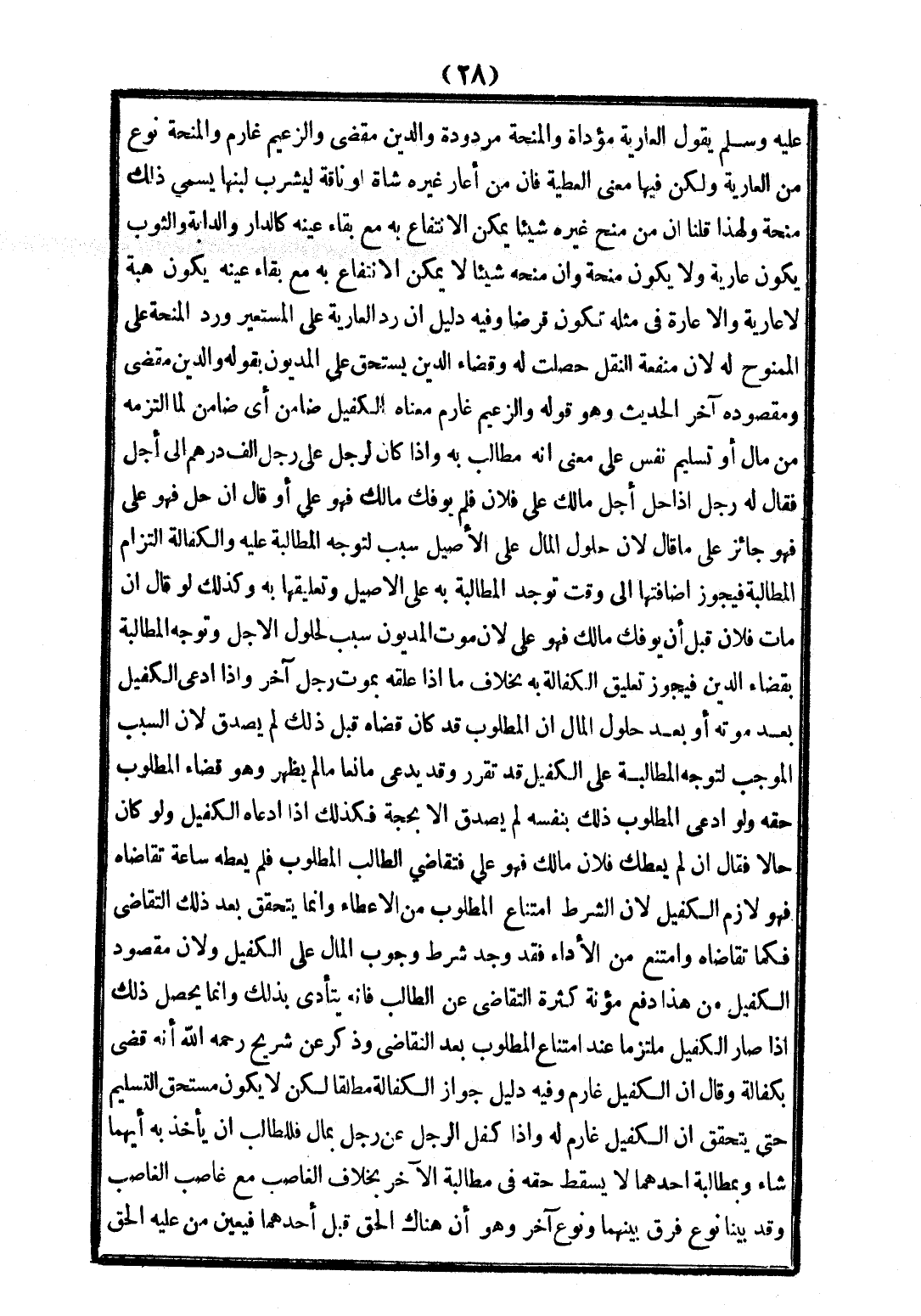 يَقُولُ: «الْعَارِيَّةُ مُؤَدَّاةٌ وَالْمِنْحَةُ مَرْدُودَةٌ وَالدَّيْنُ مَقْضِيٌّ وَالزَّعِيمُ غَارِمٌ.» وَالْمِنْحَةُ نَوْعٌ مِنْ الْعَارِيَّةِ، وَلَكِنْ فِيهَا مَعْنَى الْعَطِيَّةِ فَإِنَّ مَنْ أَعَارَ غَيْرَهُ شَاةً أَوْ نَاقَةً لِيَشْرَبَ لَبَنَهَا؛ يُسَمِّي ذَلِكَ مِنْحَةً وَلِهَذَا قُلْنَا إنَّ مَنْ مَنَحَ غَيْرَهُ شَيْئًا يُمْكِنُ الِانْتِفَاعُ بِهِ مَعَ بَقَاءِ عَيْنِهِ كَالدَّارِ وَالدَّابَّةِ وَالثَّوْبِ يَكُونُ عَارِيَّةً وَلَا يَكُونُ مِنْحَةً، وَإِنْ مَنَحَهُ شَيْئًا لَا يُمْكِنُ الِانْتِفَاعُ بِهِ مَعَ بَقَاءِ عَيْنِهِ؛ يَكُونُ هِبَةً لَا عَارِيَّةً، وَالْإِعَارَةُ فِي مِثْلِهِ تَكُونُ قَرْضًا. وَفِيهِ دَلِيلٌ أَنَّ رَدَّ الْعَارِيَّةِ عَلَى الْمُسْتَعِيرِ، وَرَدَّ الْمِنْحَةِ عَلَى الْمَمْنُوحِ لَهُ؛ لِأَنَّ مَنْفَعَةَ النَّقْلِ حَصَلَتْ لَهُ وَقَضَاءُ الدَّيْنِ يُسْتَحَقُّ عَلَى الْمَدْيُونِ بِقَوْلِهِ: وَالدَّيْنُ مَقْضِيٌّ. وَمَقْصُودُهُ آخِرَ الْحَدِيثِ - وَهُوَ قَوْلُهُ: وَالزَّعِيمُ غَارِمٌ -: مَعْنَاهُ الْكَفِيلُ ضَامِنٌ أَيْ ضَامِنٌ لِمَا الْتَزَمَهُ مِنْ مَالٍ أَوْ تَسْلِيمِ نَفْسٍ عَلَى مَعْنَى أَنَّهُ مُطَالَبٌ بِهِ. وَإِذَا كَانَ لِرَجُلٍ عَلَى رَجُلٍ أَلْفُ دِرْهَمٍ إلَى أَجَلٍ فَقَالَ لَهُ رَجُلٌ: إذَا حَلَّ أَجَلُ مَالِكَ عَلَى فُلَانٍ فَلَمْ يُوفِك مَالَك؛ فَهُوَ عَلَيَّ، أَوْ قَالَ: إنْ حَلَّ فَهُوَ عَلَيَّ؛ فَهُوَ جَائِزٌ عَلَى مَا قَالَ؛ لِأَنَّ حُلُولَ الْمَالِ عَلَى الْأَصِيلِ سَبَبٌ لِتَوَجُّهِ الْمُطَالَبَةِ عَلَيْهِ. وَالْكَفَالَةُ الْتِزَامُ الْمُطَالَبَةِ فَيَجُوزُ إضَافَتُهَا إلَى وَقْتٍ تُوجَدُ الْمُطَالَبَةُ بِهِ عَلَى الْأَصِيلِ وَتَعْلِيقُهَا بِهِ، وَكَذَلِكَ لَوْ قَالَ إنْ مَاتَ فُلَانٌ قَبْلَ أَنْ يُوفِيَكَ مَالَك فَهُوَ عَلَيَّ؛ لِأَنَّ مَوْتَ الْمَدْيُونِ سَبَبٌ لِحُلُولِ الْأَجَلِ وَتَوَجُّهِ الْمُطَالَبَةِ بِقَضَاءِ الدَّيْنِ.