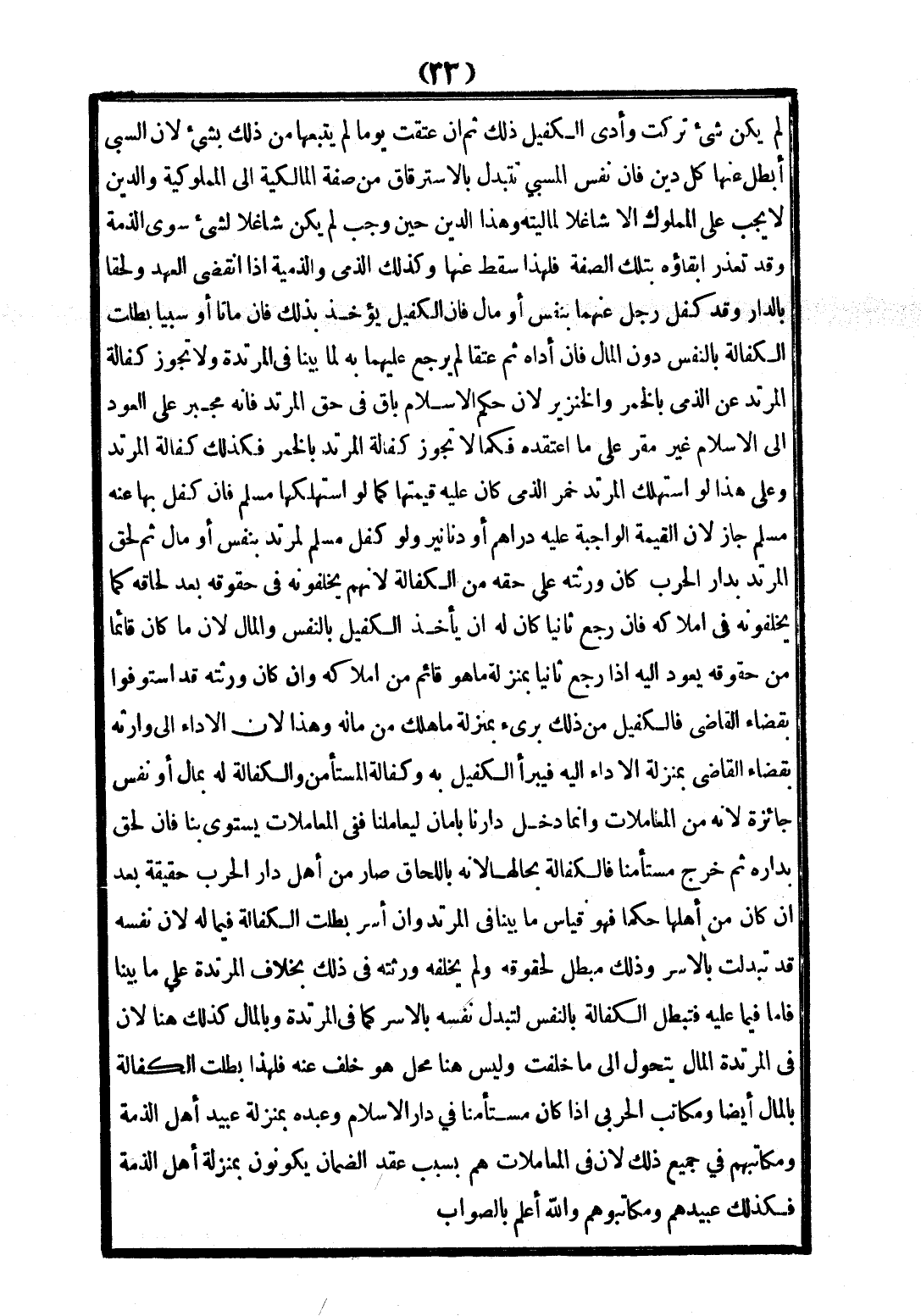 وَكَفَالَةُ الْمُسْتَأْمَنِ وَالْكَفَالَةُ لَهُ بِمَالٍ أَوْ نَفْسٍ جَائِزَةٌ؛ لِأَنَّهُ مِنْ الْمُعَامَلَاتِ وَإِنَّمَا دَخَلَ دَارَنَا بِأَمَانٍ لِيُعَامِلَنَا فَفِي الْمُعَامَلَاتِ يَسْتَوِي بِنَا. فَإِنْ لَحِقَ بِدَارِهِ ثُمَّ خَرَجَ مُسْتَأْمَنًا فَالْكَفَالَةُ بِحَالِهَا؛ لِأَنَّهُ بِاللَّحَاقِ صَارَ مِنْ أَهْلِ دَارِ الْحَرْبِ حَقِيقَةً بَعْدَ أَنْ كَانَ مِنْ أَهْلِهَا حُكْمًا فَهُوَ قِيَاسُ مَا بَيَّنَّا فِي الْمُرْتَدِّ وَإِنْ أُسِرَ بَطَلَتْ الْكَفَالَةُ فِيمَا لَهُ؛ لِأَنَّ نَفْسَهُ قَدْ تَبَدَّلَتْ بِالْأَسْرِ وَذَلِكَ مُبْطِلٌ لِحُقُوقِهِ، وَلَمْ يَخْلُفْهُ وَرَثَتُهُ فِي ذَلِكَ بِخِلَافِ الْمُرْتَدَّةِ عَلَى مَا بَيَّنَّا فَأَمَّا فِيمَا عَلَيْهِ فَتَبْطُلُ الْكَفَالَةُ بِالنَّفْسِ لِتَبَدُّلِ نَفْسِهِ بِالْأَسْرِ كَمَا فِي الْمُرْتَدَّةِ وَبِالْمَالِ كَذَلِكَ هُنَا؛ لِأَنَّ فِي الْمُرْتَدَّةِ الْمَالَ يَتَحَوَّلُ إلَى مَا خَلَّفَتْ وَلَيْسَ هُنَا مَحَلٌّ هُوَ خَلَفٌ عَنْهُ؛ فَلِهَذَا بَطَلَتْ الْكَفَالَةُ بِالْمَالِ أَيْضًا. وَمُكَاتَبُ الْحَرْبِيِّ إذَا كَانَ مُسْتَأْمَنًا فِي دَارِ الْإِسْلَامِ؛ وَعَبْدُهُ بِمَنْزِلَةِ عَبِيدِ أَهْلِ الذِّمَّةِ وَمُكَاتَبِهِمْ فِي جَمِيعِ ذَلِكَ؛ لِأَنَّ فِي الْمُعَامَلَاتِ هُمْ بِسَبَبِ عَقْدِ الضَّمَانِ يَكُونُونَ بِمَنْزِلَةِ أَهْلِ الذِّمَّةِ فَكَذَلِكَ عَبِيدُهُمْ وَمُكَاتَبُوهُمْ. وَاَللَّهُ أَعْلَمُ بِالصَّوَابِ.