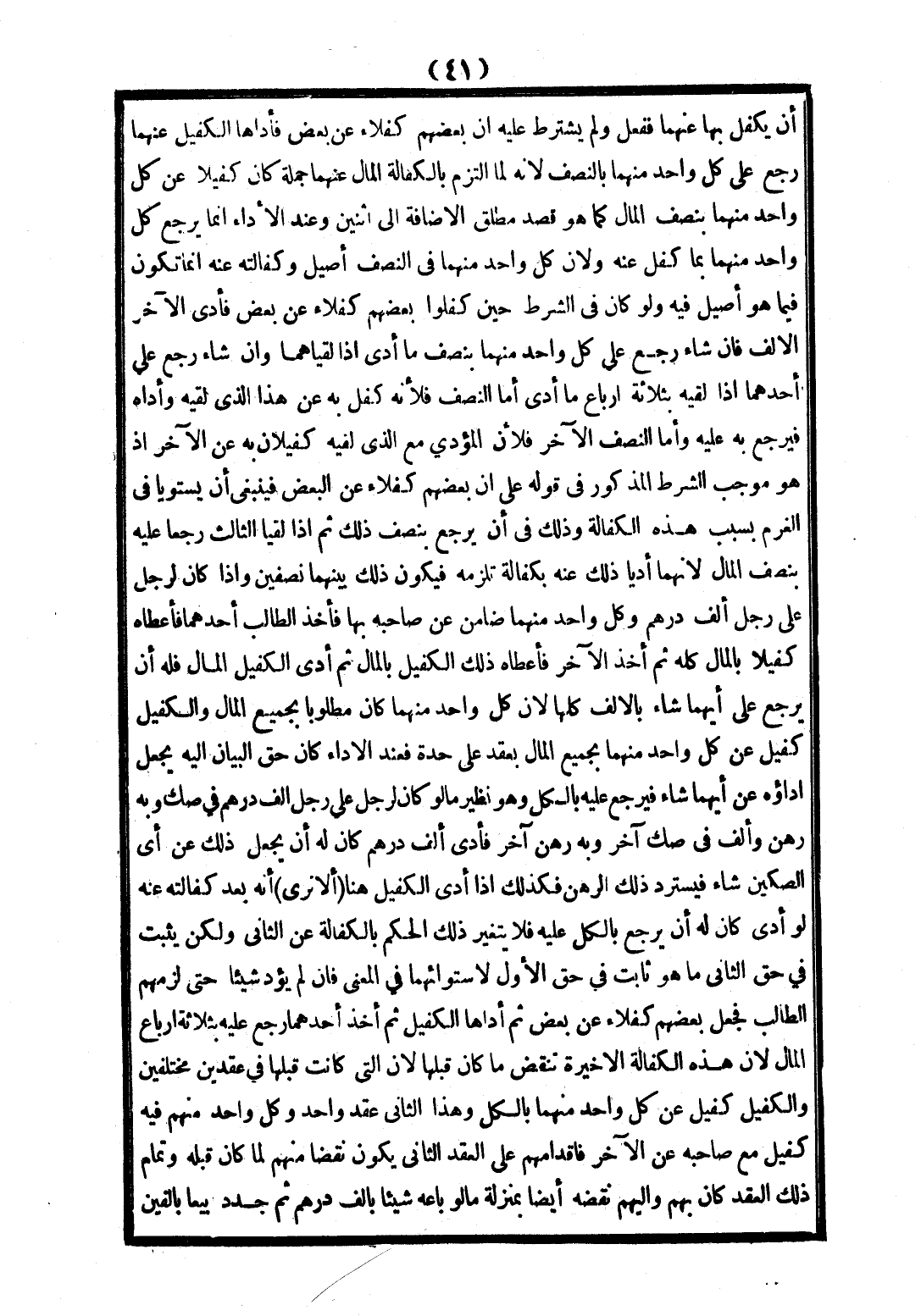 أَنْ يَكْفُلَ بِهَا عَنْهُمَا فَفَعَلَ، وَلَمْ يَشْتَرِطْ عَلَيْهِ أَنَّ بَعْضَهُمْ كُفَلَاءُ عَنْ بَعْضٍ فَأَدَّاهَا الْكَفِيلُ عَنْهُمَا؛ رَجَعَ عَلَى كُلِّ وَاحِدٍ مِنْهُمَا بِالنِّصْفِ؛ لِأَنَّهُ لَمَّا الْتَزَمَ بِالْكَفَالَةِ الْمَالَ عَنْهُمَا جُمْلَةً؛ كَانَ كَفِيلًا عَنْ كُلِّ وَاحِدٍ مِنْهُمَا بِنِصْفِ الْمَالِ كَمَا هُوَ قَصْدُ مُطْلَقِ الْإِضَافَةِ إلَى اثْنَيْنِ وَعِنْدَ الْأَدَاءِ إنَّمَا يَرْجِعُ كُلُّ وَاحِدٍ مِنْهُمَا بِمَا كَفَلَ عَنْهُ. وَلِأَنَّ كُلَّ وَاحِدٍ مِنْهُمَا فِي النِّصْفِ أَصِيلٌ وَكَفَالَتُهُ عَنْهُ إنَّمَا تَكُونُ فِيمَا هُوَ أَصِيلٌ فِيهِ وَلَوْ كَانَ فِي الشَّرْطِ حِينَ كَفَلُوا بَعْضُهُمْ كُفَلَاءُ عَنْ بَعْضٍ فَأَدَّى الْآخَرُ الْأَلْفَ فَإِنْ شَاءَ رَجَعَ عَلَى كُلِّ وَاحِدٍ مِنْهُمَا بِنِصْفِ مَا أَدَّى إذَا لَقِيَاهُمَا، وَإِنْ شَاءَ رَجَعَ عَلَى أَحَدِهِمَا إذَا لَقِيَهُ بِثَلَاثَةِ أَرْبَاعِ مَا أَدَّى أَمَّا النِّصْفُ فَلِأَنَّهُ كَفَلَ بِهِ عَنْ هَذَا الَّذِي لَقِيَهُ وَأَدَّاهُ فَيَرْجِعُ بِهِ عَلَيْهِ وَأَمَّا النِّصْفُ الْآخَرُ فَلِأَنَّ الْمُؤَدِّيَ مَعَ الَّذِي لَقِيَهُ كَفِيلَانِ بِهِ عَنْ الْآخَرِ؛ إذْ هُوَ مُوجَبُ الشَّرْطِ الْمَذْكُورِ فِي قَوْلِهِ: عَلَى أَنَّ بَعْضَهُمْ كُفَلَاءُ عَنْ الْبَعْضِ فَيَنْبَغِي أَنْ يَسْتَوِيَا فِي الْغُرْمِ بِسَبَبِ هَذِهِ الْكَفَالَةِ وَذَلِكَ فِي أَنْ يَرْجِعَ بِنِصْفِ ذَلِكَ ثُمَّ إذَا لَقِيَا الثَّالِثَ رَجَعَا عَلَيْهِ بِنِصْفِ الْمَالِ؛ لِأَنَّهُمَا أَدَّيَا ذَلِكَ عَنْهُ بِكَفَالَةٍ تَلْزَمُهُ فَيَكُونُ ذَلِكَ بَيْنَهُمَا نِصْفَيْنِ
