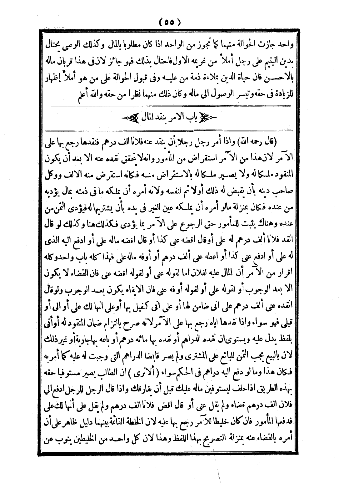 (قَالَ - رَحِمَهُ اللَّهُ -): وَإِذَا أَمَرَ رَجُلٌ رَجُلًا بِأَنْ يَنْقُدَ عَنْهُ فُلَانًا أَلْفَ دِرْهَمٍ فَنَقَدَهَا؛ رَجَعَ بِهَا عَلَى الْآمِرِ؛ لِأَنَّ هَذَا مِنْ الْآمِرِ اسْتِقْرَاضٌ مِنْ الْمَأْمُورِ وَأَنَّهُ لَا يَتَحَقَّقُ نَقْدُهُ عَنْهُ إلَّا بَعْدَ أَنْ يَكُونَ الْمَنْقُودُ مِلْكًا لَهُ وَلَا يَصِيرُ مِلْكًا لَهُ بِالِاسْتِقْرَاضِ مِنْهُ فَكَأَنَّهُ اسْتَقْرَضَ مِنْهُ الْأَلْفَ وَوَكَّلَ صَاحِبَ دَيْنِهِ بِأَنْ يَقْبِضَ لَهُ ذَلِكَ أَوَّلًا ثُمَّ لِنَفْسِهِ؛ وَلِأَنَّهُ أَمَرَهُ أَنْ يُمَلِّكَهُ مَا فِي ذِمَّتِهِ بِمَالٍ يُؤَدِّيهِ مِنْ عِنْدِهِ فَكَانَ بِمَنْزِلَةِ مَا لَوْ أَمَرَهُ أَنْ يُمَلِّكَهُ عَيْنَ الْغَيْرِ فِي يَدِهِ بِأَنْ يَشْتَرِيَهَا لَهُ فَيُؤَدِّيَ الثَّمَنَ مِنْ عِنْدِهِ وَهُنَاكَ يَثْبُتُ لِلْمَأْمُورِ حَقُّ الرُّجُوعِ عَلَى الْآمِرِ بِمَا يُؤَدِّي فَكَذَلِكَ هُنَا، وَكَذَلِكَ لَوْ قَالَ: اُنْقُدْ فُلَانًا أَلْفَ دِرْهَمٍ لَهُ عَلَيَّ، أَوْ قَالَ: اقْضِهِ عَنِّي كَذَا أَوْ قَالَ: اقْضِهِ مَا لَهُ عَلَيَّ، أَوْ ادْفَعْ إلَيْهِ الَّذِي لَهُ عَلَيَّ، أَوْ ادْفَعْ عَنِّي كَذَا، أَوْ أَعْطِهِ عَنِّي أَلْفَ دِرْهَمٍ، أَوْ أَوْفِهِ مَالَهُ عَلَيَّ، فَهَذَا كُلُّهُ بَابٌ وَاحِدٌ وَكُلُّهُ إقْرَارٌ مِنْ الْآمِرِ أَنَّ الْمَالَ عَلَيْهِ لِفُلَانٍ إمَّا لِقَوْلِهِ: عَنِّي أَوْ لِقَوْلِهِ: اقْضِهِ عَنِّي. فَإِنَّ الْقَضَاءَ لَا يَكُونُ إلَّا بَعْدَ الْوُجُوبِ أَوْ لِقَوْلِهِ: عَلَيَّ أَوْ لِقَوْلِهِ: أَوْفِهِ عَنِّي فَإِنَّ الْإِيفَاءَ يَكُونُ بَعْدَ الْوُجُوبِ وَلَوْ قَالَ: اُنْقُدْهُ عَنِّي أَلْفَ دِرْهَمٍ عَلَى أَنِّي ضَامِنٌ لَهَا أَوْ عَلَى أَنِّي كَفِيلٌ بِهَا أَوْ عَلَى أَنَّهَا لَك عَلَيَّ أَوْ إلَيَّ أَوْ قِبَلِي فَهُوَ سَوَاءٌ وَإِذَا نَقَدَهَا إيَّاهُ رَجَعَ بِهَا عَلَى الْآمِرِ؛ لِأَنَّهُ صَرَّحَ بِالْتِزَامِ ضَمَانِ الْمَنْقُودِ لَهُ أَوْ أَتَى بِلَفْظٍ يَدُلُّ عَلَيْهِ وَيَسْتَوِي إنْ نَقَدَهُ الدَّرَاهِمَ أَوْ نَقَدَهُ بِهَا مِائَةَ دِرْهَمٍ أَوْ بَاعَهُ بِهَا جَارِيَةً أَوْ غَيْرَ ذَلِكَ؛ لِأَنَّ بِالْبَيْعِ يَجِبُ الثَّمَنُ لِلْبَائِعِ عَلَى الْمُشْتَرِي وَلَمْ يَصِرْ قَابِضًا الدَّرَاهِمَ الَّتِي وَجَبَتْ لَهُ عَلَيْهِ كَمَا أَمَرَ بِهِ. فَكَانَ هَذَا وَمَا لَوْ دَفَعَ إلَيْهِ دَرَاهِمَ فِي الْحُكْمِ سَوَاءً.