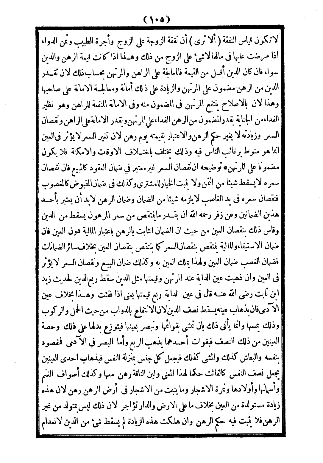 (أَلَا تَرَى) أَنَّ نَفَقَةَ الزَّوْجَةِ عَلَى الزَّوْجِ، وَأُجْرَةَ الطَّبِيبِ، وَثَمَنَ الدَّوَاءِ إذَا مَرِضَتْ عَلَيْهَا فِي مَالِهَا، لَا شَيْءَ عَلَى الزَّوْجِ مِنْ ذَلِكَ، وَهَذَا إذَا كَانَتْ قِيمَةُ الرَّهْنِ وَالدَّيْنِ سَوَاءً، فَإِنْ كَانَ الدَّيْنُ أَقَلَّ مِنْ الْقِيمَةِ فَالْمُعَالَجَةُ عَلَى الرَّاهِنِ وَالْمُرْتَهِنِ بِحِسَابِ ذَلِكَ؛ لِأَنَّ تَقَدُّرَ الدَّيْنِ مِنْ الرَّهْنِ مَضْمُونٌ عَلَى الْمُرْتَهِنِ، وَالزِّيَادَةُ عَلَى ذَلِكَ أَمَانَةٌ، وَمُعَالَجَةُ الْأَمَانَةِ عَلَى صَاحِبِهَا، وَهَذَا؛ لِأَنَّ بِالْإِصْلَاحِ يَنْتَفِعُ الْمُرْتَهِنُ فِي الْمَضْمُونِ مِنْهُ، وَفِي الْأَمَانَةِ الْمَنْفَعَةُ لِلرَّاهِنِ وَهُوَ نَظِيرُ الْفِدَاءِ مِنْ الْجِنَايَةِ بِقَدْرِ الْمَضْمُونِ مِنْ الرَّهْنِ وَالْفِدَاءُ عَلَى الْمُرْتَهِنِ، وَبِقَدْرِ الْأَمَانَةِ عَلَى الرَّاهِنِ، وَنُقْصَانِ السِّعْرِ، وَزِيَادَتِهِ لَا يُغَيَّرُ حُكْمُ الرَّهْنِ، وَالِاعْتِبَارُ بِقِيمَتِهِ يَوْمَ رُهِنَ؛ لِأَنَّ تَغَيُّرَ السِّعْرِ، لَا يُؤَثِّرُ فِي الْعَيْنِ، إنَّمَا هُوَ مَنُوطٌ بِرَغَائِبِ النَّاسِ فِيهِ، وَذَلِكَ يَخْتَلِفُ بِاخْتِلَافِ الْأَوْقَاتِ، وَالْأَمْكِنَةِ فَلَا يَكُونُ مَضْمُونًا عَلَى الْمُرْتَهِنِ تَوْضِيحُهُ: أَنَّ نُقْصَانَ السِّعْرِ غَيْرُ مُعْتَبَرٍ فِي ضَمَانِ الْعُقُودِ، كَالْمَبِيعِ، فَإِنَّ نُقْصَانَ سِعْرِهِ لَا يُسْقِطُ شَيْئًا مِنْ الثَّمَنِ وَلَا يُثْبِتُ الْخِيَارَ لِلْمُشْتَرَى، وَكَذَلِكَ ضَمَانُ الْمَقْبُوضِ كَالْمَغْصُوبِ، فَنُقْصَانُ سِعْرِهِ فِي يَدِ الْغَاصِبِ لَا يُلْزِمُهُ شَيْئًا مِنْ الضَّمَانِ، وَضَمَانُ الرَّهْنِ لَا بُدَّ أَنْ يُعْتَبَرَ بِأَحَدِ هَذَيْنِ الضَّامِنَيْنِ.