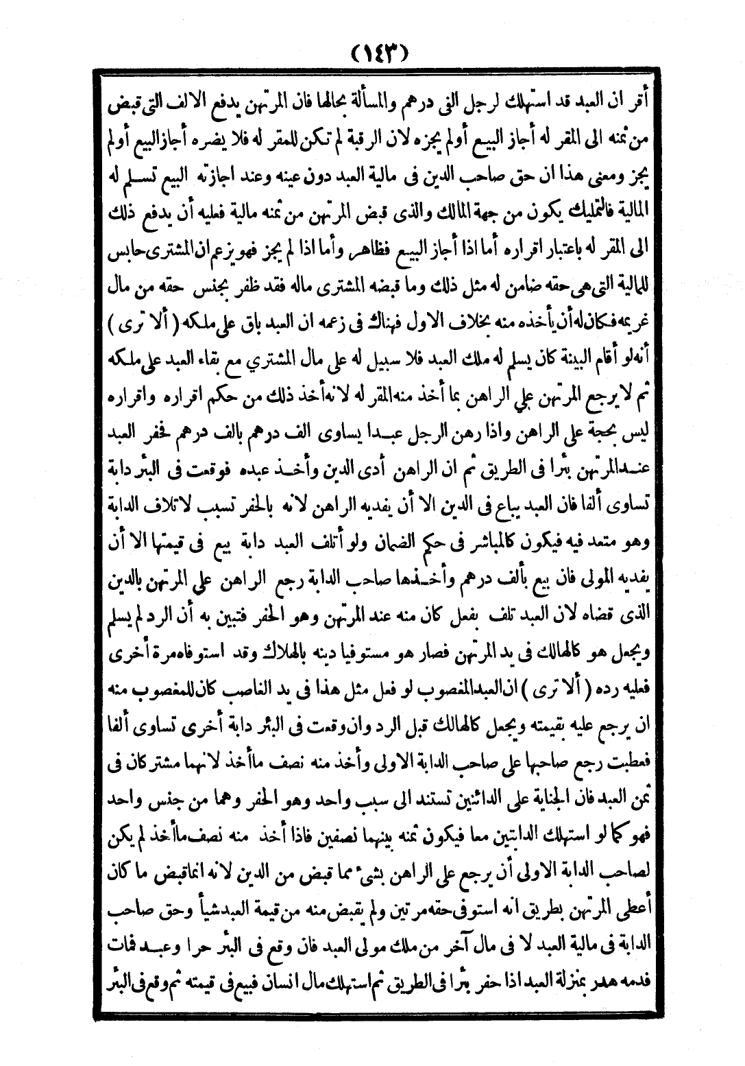 وَإِذَا رَهَنَ الرَّجُلُ عَبْدًا يُسَاوِي أَلْفَ دِرْهَمٍ بِأَلْفِ دِرْهَمٍ فَحَفَرَ الْعَبْدُ عِنْدَ الْمُرْتَهِنِ بِئْرًا فِي الطَّرِيقِ ثُمَّ إنَّ الرَّاهِنَ أَدَّى الدَّيْنَ وَأَخَذَ عَبْدَهُ فَوَقَعَتْ فِي الْبِئْرِ دَابَّةٌ تُسَاوِي أَلْفًا فَإِنَّ الْعَبْدَ يُبَاعُ فِي الدَّيْنِ إلَّا أَنْ يَفْدِيَهُ الرَّاهِنُ؛ لِأَنَّهُ بِالْحَفْرِ تَسَبَّبَ لِإِتْلَافِ الدَّابَّةِ وَهُوَ مُتَعَدٍّ فِيهِ فَيَكُونُ كَالْمُبَاشِرِ فِي حُكْمِ الضَّمَانِ وَلَوْ أَتْلَفَ الْعَبْدُ دَابَّةً بِيعَ فِي قِيمَتِهَا إلَّا أَنْ يَفْدِيَهُ الْمَوْلَى، فَإِنْ بِيعَ بِأَلْفِ دِرْهَمٍ وَأَخَذَهَا صَاحِبُ الدَّابَّةِ رَجَعَ الرَّاهِنُ عَلَى الْمُرْتَهِنِ بِالدَّيْنِ الَّذِي قَضَاهُ؛ لِأَنَّ الْعَبْدَ تَلِفَ بِفِعْلٍ كَانَ مِنْهُ عِنْدَ الْمُرْتَهِنِ وَهُوَ الْحَفْرُ فَتَبَيَّنَ بِهِ أَنَّ الرَّدَّ لَمْ يُسَلَّمْ وَيُجْعَلُ هُوَ كَالْهَالِكِ فِي يَدِ الْمُرْتَهِنِ فَصَارَ هُوَ مُسْتَوْفِيًا دَيْنَهُ بِالْهَلَاكِ وَقَدْ اسْتَوْفَاهُ مَرَّةً أُخْرَى فَعَلَيْهِ رَدُّهُ (أَلَا تَرَى) أَنَّ الْعَبْدَ الْمَغْصُوبَ لَوْ فَعَلَ مِثْلَ هَذَا فِي يَدِ الْغَاصِبِ كَانَ لِلْمَغْصُوبِ مِنْهُ أَنْ يَرْجِعَ عَلَيْهِ بِقِيمَتِهِ وَيُجْعَلَ كَالْهَالِكِ قَبْلَ الرَّدِّ