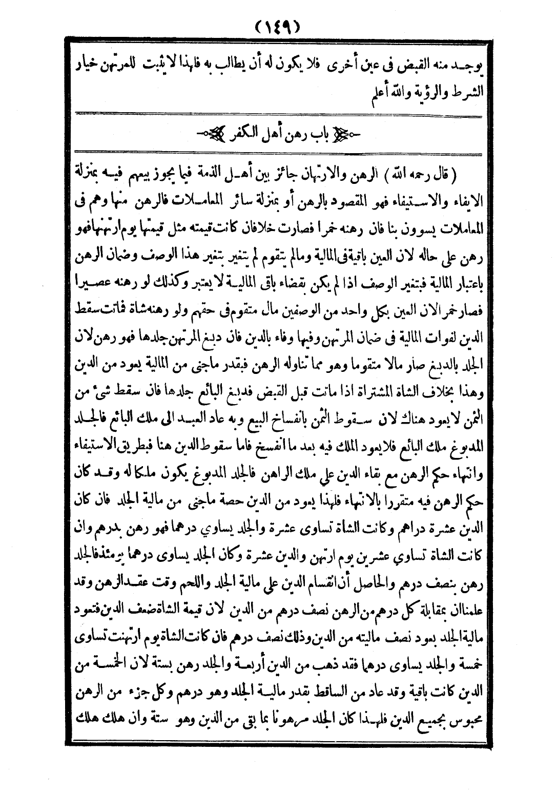 (بَابُ رَهْنِ أَهْلِ الْكُفْرِ) (قَالَ - رَحِمَهُ اللَّهُ -): الرَّهْنُ وَالِارْتِهَانُ جَائِزٌ بَيْنَ أَهْلِ الذِّمَّةِ فِيمَا يَجُوزُ بَيْعُهُمْ فِيهِ بِمَنْزِلَةِ الْإِيفَاءِ وَالِاسْتِيفَاءِ فَهُوَ الْمَقْصُودُ بِالرَّهْنِ أَوْ بِمَنْزِلَةِ سَائِرِ الْمُعَامَلَاتِ فَالرَّهْنُ مِنْهَا، وَهُمْ فِي الْمُعَامَلَاتِ يُسَوَّوْنَ بِنَا، فَإِنْ رَهَنَهُ خَمْرًا فَصَارَتْ خَلًّا فَإِنْ كَانَتْ قِيمَتُهُ مِثْلَ قِيمَتِهَا يَوْمَ ارْتَهَنَهَا فَهُوَ رَهْنٌ عَلَى حَالِهِ؛ لِأَنَّ الْعَيْنَ بَاقِيَةٌ فِي الْمَالِيَّةِ، وَمَا لَمْ يُتَقَوَّمْ لَمْ يَتَغَيَّرْ بِتَغَيُّرِ هَذَا الْوَصْفِ، وَضَمَانُ الرَّهْنِ بِاعْتِبَارِ الْمَالِيَّةِ، فَبِتَغَيُّرِ الْوَصْفِ إذَا لَمْ يَكُنْ بِقَضَاءِ بَاقِي الْمَالِيَّةِ لَا يُعْتَبَرُ، وَكَذَلِكَ لَوْ رَهَنَهُ عَصِيرًا فَصَارَ خَمْرًا؛ لِأَنَّ الْعَيْنَ بِكُلِّ وَاحِدٍ مِنْ الْوَصْفَيْنِ مَالٌ مُتَقَوِّمٌ فِي حَقِّهِمْ.