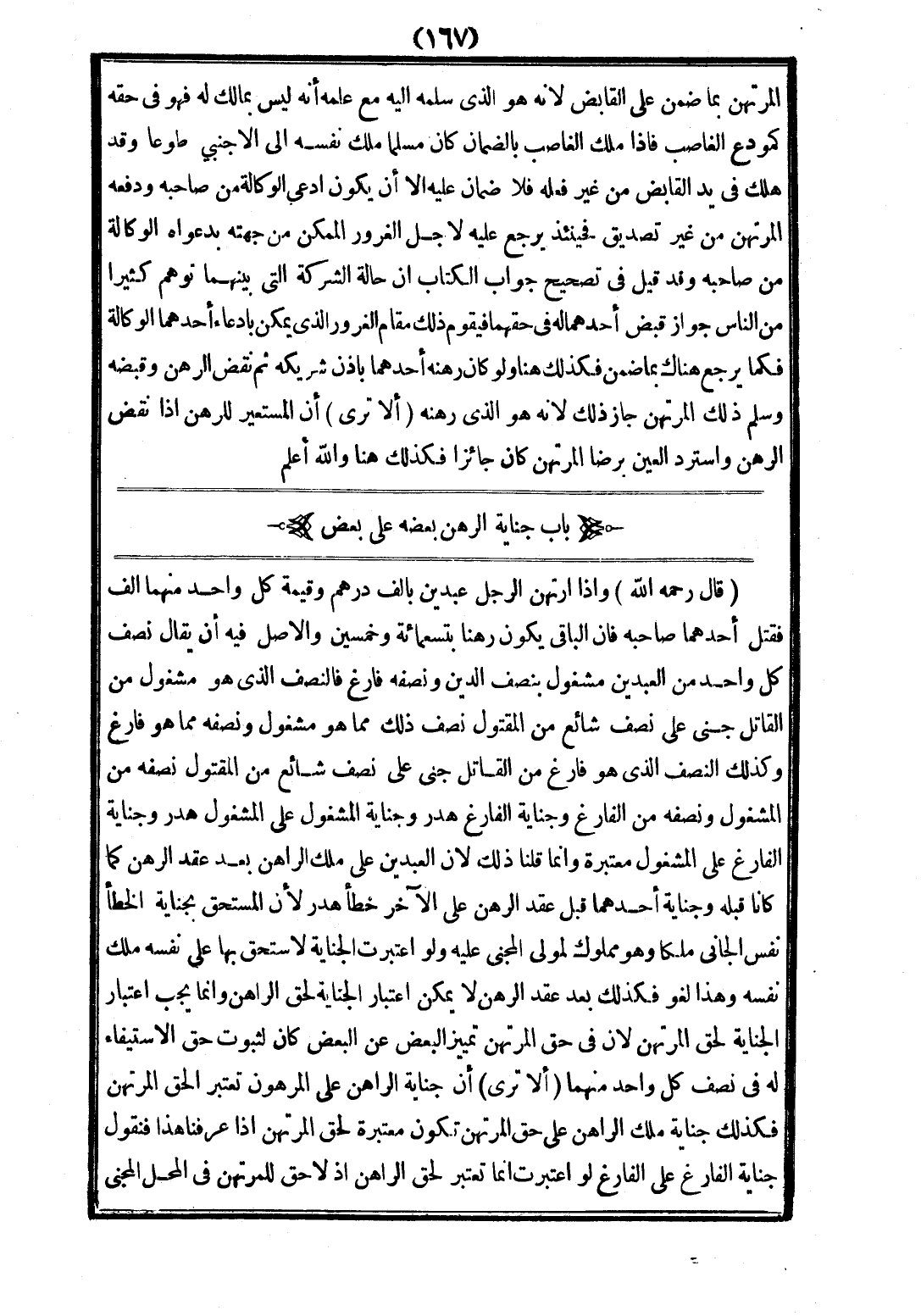 (بَابُ جِنَايَةِ الرَّهْنِ بَعْضِهِ عَلَى بَعْضٍ) (قَالَ - رَحِمَهُ اللَّهُ -): وَإِذَا ارْتَهَنَ الرَّجُلُ عَبْدَيْنِ بِأَلْفِ دِرْهَمٍ وَقِيمَةُ كُلِّ وَاحِدٍ مِنْهُمَا أَلْفٌ، فَقَتَلَ أَحَدُهُمَا صَاحِبَهُ فَإِنَّ الْبَاقِيَ يَكُونُ رَهْنًا بِتِسْعِمِائَةٍ وَخَمْسِينَ وَالْأَصْلُ فِيهِ أَنْ يُقَالَ: نِصْفُ كُلِّ وَاحِدٍ مِنْ الْعَبْدَيْنِ مَشْغُولٌ بِنِصْفِ الدَّيْنِ وَنِصْفُهُ فَارِغٌ، فَالنِّصْفُ الَّذِي هُوَ مَشْغُولٌ مِنْ الْقَاتِلِ جَنَى عَلَى نِصْفٍ شَائِعٍ مِنْ الْمَقْتُولِ نِصْفُ ذَلِكَ مِمَّا هُوَ مَشْغُولٌ وَنِصْفُهُ مِمَّا هُوَ فَارِغٌ، وَكَذَلِكَ النِّصْفُ الَّذِي هُوَ فَارِغٌ مِنْ الْقَاتِلِ جَنَى عَلَى نِصْفٍ شَائِعٍ مِنْ الْمَقْتُولِ نِصْفُهُ مِنْ الْمَشْغُولِ وَنِصْفُهُ مِنْ الْفَارِغِ، وَجِنَايَةُ الْفَارِغِ هَدَرٌ، وَجِنَايَةُ الْمَشْغُولِ عَلَى الْمَشْغُولِ هَدَرٌ، وَجِنَايَةُ الْفَارِغِ عَلَى الْمَشْغُولِ مُعْتَبَرَةٌ، وَإِنَّمَا قُلْنَا ذَلِكَ؛ لِأَنَّ الْعَبْدَيْنِ عَلَى مِلْكِ الرَّاهِنِ بَعْدَ عَقْدِ الرَّهْنِ، كَمَا كَانَا قَبْلَهُ، وَجِنَايَةُ أَحَدِهِمَا قَبْلَ عَقْدِ الرَّهْنِ عَلَى الْآخَرِ خَطَأٌ هَدَرٌ؛ لِأَنَّ الْمُسْتَحَقَّ بِجِنَايَةِ الْخَطَأِ نَفْسُ الْجَانِي مِلْكًا، وَهُوَ مَمْلُوكٌ لِمَوْلَى الْمَجْنِيِّ عَلَيْهِ وَلَوْ اُعْتُبِرَتْ الْجِنَايَةُ لَاسْتَحَقَّ بِهَا عَلَى نَفْسِهِ مِلْكَ نَفْسِهِ وَهَذَا لَغْوٌ، فَكَذَلِكَ بَعْدَ عَقْدِ الرَّهْنِ لَا يُمْكِنُ اعْتِبَارُ الْجِنَايَةِ لِحَقِّ الرَّاهِنِ، وَإِنَّمَا يَجِبُ اعْتِبَارُ الْجِنَايَةِ لِحَقِّ الْمُرْتَهِنِ؛ لِأَنَّ فِي حَقِّ الْمُرْتَهِنِ تَمْيِيزَ الْبَعْضِ عَنْ الْبَعْضِ كَانَ لِثُبُوتِ حَقِّ الِاسْتِيفَاءِ لَهُ فِي نِصْفِ كُلِّ وَاحِدٍ مِنْهُمَا