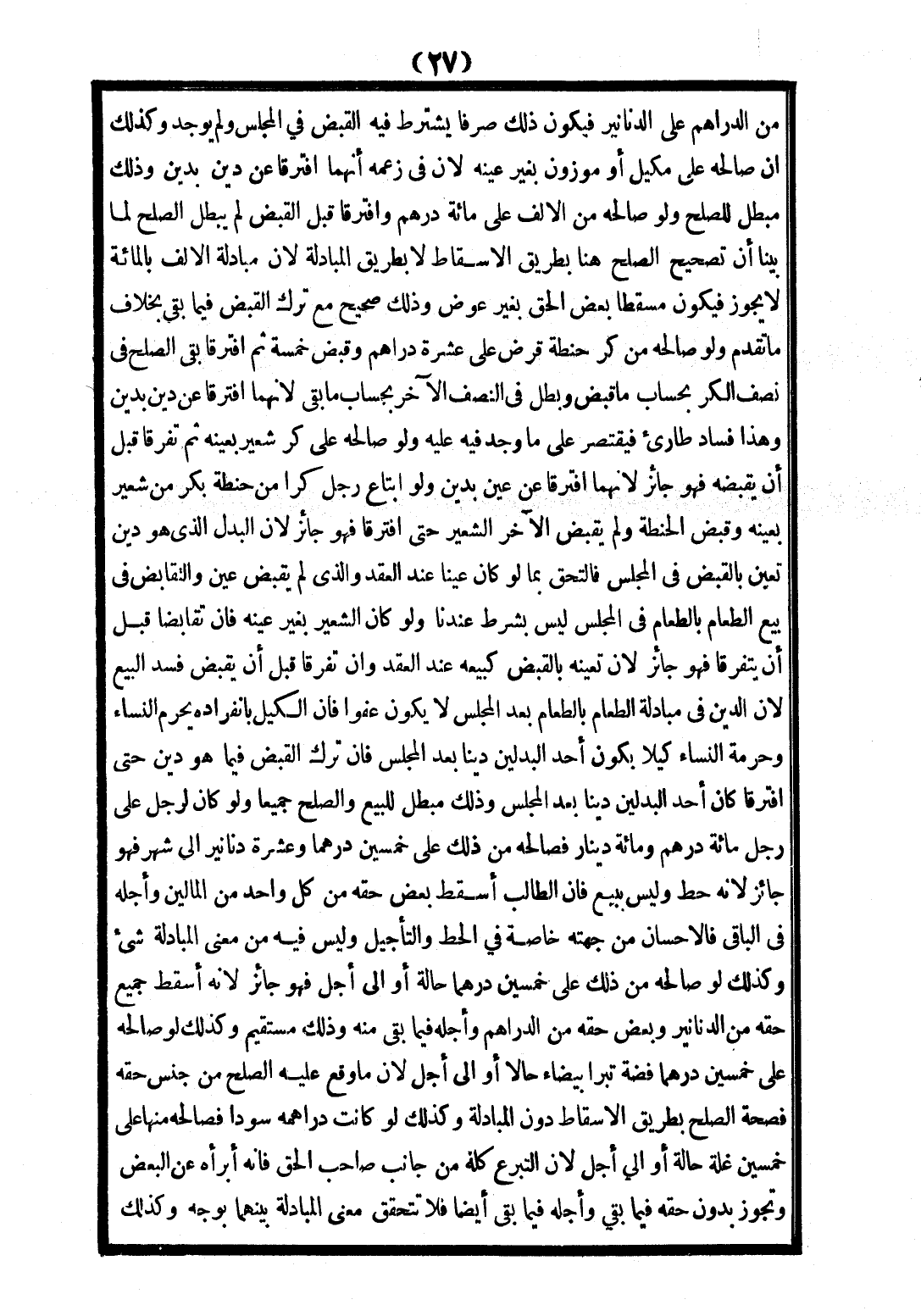 مِنْ الدَّرَاهِمِ عَلَى الدَّنَانِيرِ فَيَكُونُ ذَلِكَ صَرْفًا يُشْتَرَطُ فِيهِ الْقَبْضُ فِي الْمَجْلِسِ، وَلَمْ يُوجَدْ، وَكَذَلِكَ إنْ صَالَحَهُ عَلَى مَكِيلٍ أَوْ مَوْزُونٍ بِغَيْرِ عَيْنِهِ؛ لِأَنَّ فِي زَعْمِهِ أَنَّهُمَا افْتَرَقَا عَنْ دَيْنٍ بِدَيْنٍ وَذَلِكَ مُبْطِلٌ لِلصُّلْحِ، وَلَوْ صَالَحَهُ مِنْ الْأَلْفِ عَلَى مِائَةِ دِرْهَمٍ وَافْتَرَقَا قَبْلَ الْقَبْضِ لَمْ يَبْطُلْ الصُّلْحُ لِمَا بَيَّنَّا أَنَّ تَصْحِيحَ الصُّلْحِ هُنَا بِطَرِيقِ الْإِسْقَاطِ لَا بِطَرِيقِ الْمُبَادَلَةِ؛ لِأَنَّ مُبَادَلَةَ الْأَلْفِ بِالْمِائَةِ لَا يَجُوزُ فَيَكُونُ مُسْقِطًا بَعْضَ الْحَقِّ بِغَيْرِ عِوَضٍ وَذَلِكَ صَحِيحٌ مَعَ تَرْكِ الْقَبْضِ فِيمَا بَقِيَ بِخِلَافِ مَا تَقَدَّمَ.