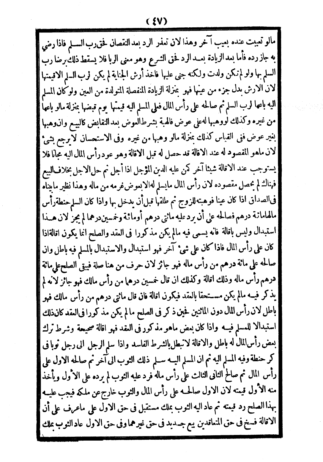 وَإِذَا سَلَّمَ الرَّجُلُ إلَى رَجُلٍ ثَوْبًا فِي كُرِّ حِنْطَةٍ، وَفِيهِ الْمُسْلَمُ إلَيْهِ، ثُمَّ إنَّ الْمُسْلَمَ إلَيْهِ سَلَّمَ ذَلِكَ الثَّوْبَ إلَى آخَرَ، ثُمَّ صَالَحَهُ الْأَوَّلُ عَلَى رَأْسِ الْمَالِ، ثُمَّ صَالَحَ الثَّانِي الثَّالِثَ عَلَى رَأْسِ مَالِهِ فَرَدَّ عَلَيْهِ الثَّوْبَ لَمْ يَرُدَّهُ عَلَى الْأَوَّلِ وَيَأْخُذُ مِنْهُ الْأَوَّلُ قِيمَتَهُ؛ لِأَنَّ الْأَوَّلَ صَالَحَهُ عَلَى رَأْسِ الْمَالِ وَالثَّوْبُ خَارِجٌ عَنْ مِلْكِهِ فَيَجِبُ عَلَيْهِ بِهَذَا الصُّلْحِ رَدُّ قِيمَتِهِ، ثُمَّ عَادَ إلَيْهِ الثَّوْبُ بِمِلْكٍ مُسْتَقْبَلٍ فِي حَقِّ الْأَوَّلِ عَلَى مَا عُرِفَ عَلَى أَنَّ الْإِقَالَةَ فَسْخٌ فِي حَقِّ الْمُتَعَاقِدَيْنِ، بَيْعٌ جَدِيدٌ فِي حَقِّ غَيْرِهِمَا، وَفِي حَقِّ الْأَوَّلِ عَادَ الثَّوْبُ بِمِلْكٍ