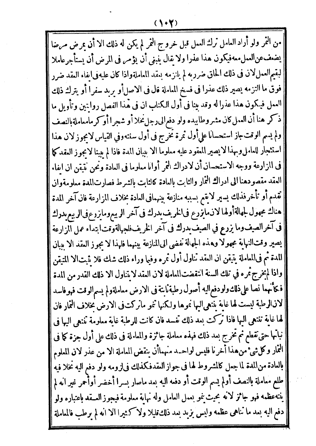 مِنْ الثَّمَرِ، وَلَوْ أَرَادَ الْعَامِلُ تَرْكَ الْعَمَلِ قَبْلَ خُرُوجِ الثَّمَرِ لَمْ يَكُنْ لَهُ ذَلِكَ، إلَّا أَنْ يَمْرَضَ مَرَضًا يَضْعُفُ عَنْ الْعَمَلِ مَعَهُ فَيَكُونَ ذَلِكَ عُذْرًا، وَلَا يُقَالُ: يَنْبَغِي أَنْ يُؤْمَرَ فِي الْمَرَضِ أَنْ يَسْتَأْجِرَ عَامِلًا لِيُقِيمَ الْعَمَلَ؛ لِأَنَّ فِي ذَلِكَ إلْحَاقَ ضَرَرٍ بِهِ لَمْ يَلْتَزِمْهُ بِعَقْدِ الْمُعَامَلَةِ، وَإِذَا كَانَ عَلَيْهِ فِي إيفَاءِ الْعَقْدِ ضَرَرٌ فَوْقَ مَا الْتَزَمَهُ يَصِيرُ ذَلِكَ عُذْرًا فِي فَسْخِ الْمُعَامَلَةِ، قَالَ فِي الْأَصْلِ: أَوْ يُرِيدُ سَفَرًا أَوْ يَتْرُكُ ذَلِكَ الْعَمَلَ فَيَكُونُ هَذَا عُذْرًا لَهُ. وَقَدْ بَيَّنَّا فِي أَوَّلِ الْكِتَابِ أَنَّ فِي هَذَا الْفَصْلِ رِوَايَتَيْنِ، وَتَأْوِيلُ مَا ذُكِرَ هُنَا أَنَّ الْعَمَلَ كَانَ مَشْرُوطًا بِيَدِهِ.