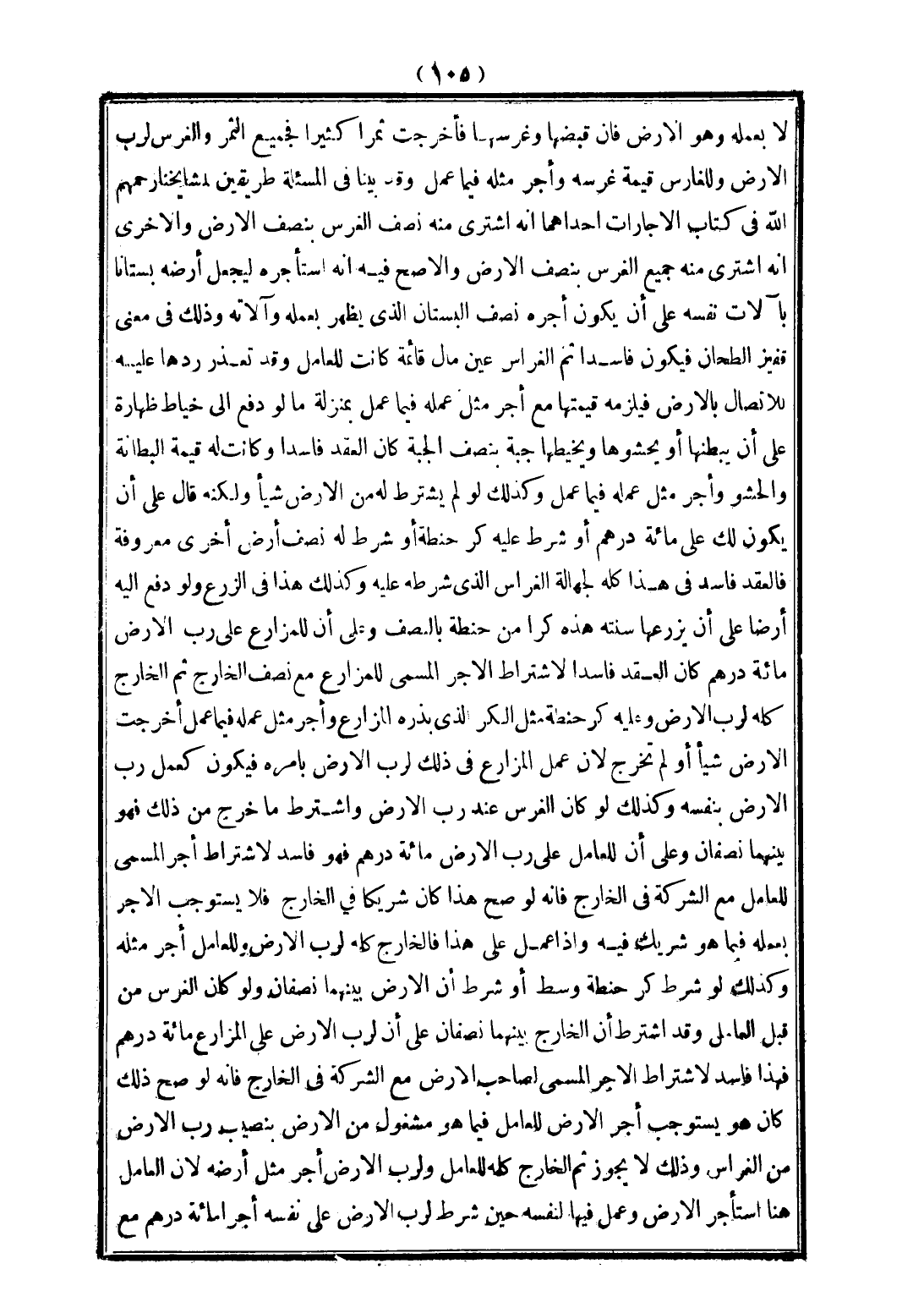 وَلَوْ دَفَعَ إلَيْهِ أَرْضًا عَلَى أَنْ يَزْرَعَهَا سَنَتَهُ هَذِهِ كُرًّا مِنْ حِنْطَةٍ بِالنِّصْفِ، وَعَلَى أَنَّ لِلْمُزَارِعِ عَلَى رَبِّ الْأَرْضِ مِائَةَ دِرْهَمٍ - كَانَ الْعَقْدُ فَاسِدًا لِاشْتِرَاطِ الْأَجْرِ الْمُسَمَّى لِلْمُزَارِعِ مَعَ نِصْفِ الْخَارِجِ، ثُمَّ الْخَارِجُ كُلُّهُ لِرَبِّ الْأَرْضِ وَعَلَيْهِ كُرُّ حِنْطَةٍ مِثْلُ الْكُرِّ الَّذِي بَذَرَهُ الْمُزَارِعُ وَأَجْرُ مِثْلِ عَمَلِهِ فِيمَا عَمِلَ، أَخْرَجَتْ الْأَرْضُ شَيْئًا أَوْ لَمْ تُخْرِجْ؛ لِأَنَّ عَمَلَ الْمُزَارِعِ فِي ذَلِكَ لِرَبِّ الْأَرْضِ بِأَمْرِهِ، فَيَكُونُ كَعَمَلِ رَبِّ الْأَرْضِ بِنَفْسِهِ. وَكَذَلِكَ لَوْ كَانَ الْغَرْسُ عِنْدَ رَبِّ الْأَرْضِ وَاشْتَرَطَ مَا خَرَجَ مِنْ ذَلِكَ فَهُوَ بَيْنَهُمَا نِصْفَانِ، وَعَلَى أَنَّ لِلْعَامِلِ عَلَى رَبِّ الْأَرْضِ مِائَةَ دِرْهَمٍ - فَهُوَ فَاسِدٌ لِاشْتِرَاطِ أَجْرِ الْمُسَمَّى لِلْعَامِلِ مَعَ الشَّرِكَةِ فِي الْخَارِجِ، فَإِنَّهُ لَوْ صَحَّ هَذَا كَانَ شَرِيكًا فِي الْخَارِجِ فَلَا يَسْتَوْجِبُ الْأَجْرَ بِعَمَلِهِ فِيمَا هُوَ شَرِيكٌ فِيهِ، وَإِذَا عَمِلَ عَلَى هَذَا فَالْخَارِجُ كُلُّهُ لِرَبِّ الْأَرْضِ وَلِلْعَامِلِ أَجْرُ مِثْلِهِ، وَكَذَلِكَ لَوْ شَرَطَ كُرَّ حِنْطَةٍ وَسَطٍ، أَوْ شَرَطَ أَنَّ الْأَرْضَ بَيْنَهُمَا نِصْفَانِ. وَلَوْ كَانَ الْغَرْسُ مِنْ قِبَلِ الْعَامِلِ وَقَدْ اشْتَرَطَ أَنَّ الْخَارِجَ بَيْنَهُمَا نِصْفَانِ، عَلَى أَنَّ لِرَبِّ الْأَرْضِ عَلَى الْمُزَارِعِ مِائَةَ دِرْهَمٍ - فَهَذَا فَاسِدٌ لِاشْتِرَاطِ الْأَجْرِ الْمُسَمَّى لِصَاحِبِ الْأَرْضِ مَعَ الشَّرِكَةِ فِي الْخَارِجِ، فَإِنَّهُ لَوْ صَحَّ ذَلِكَ كَانَ هُوَ يَسْتَوْجِبُ أَجْرَ الْأَرْضِ لِلْعَامِلِ فِيمَا هُوَ مَشْغُولٌ مِنْ الْأَرْضِ بِنَصِيبِ رَبِّ الْأَرْضِ مِنْ الْغِرَاسِ، وَذَلِكَ لَا يَجُوزُ، ثُمَّ الْخَارِجُ كُلُّهُ لِلْعَامِلِ، وَلِرَبِّ الْأَرْضِ أَجْرُ مِثْلِ أَرْضِهِ؛ لِأَنَّ الْعَامِلَ هُنَا اسْتَأْجَرَ الْأَرْضَ وَعَمِلَ فِيهَا لِنَفْسِهِ حِينَ شَرَطَ لِرَبِّ الْأَرْضِ عَلَى نَفْسِهِ أَجْرًا مِائَةَ دِرْهَمٍ مَعَ