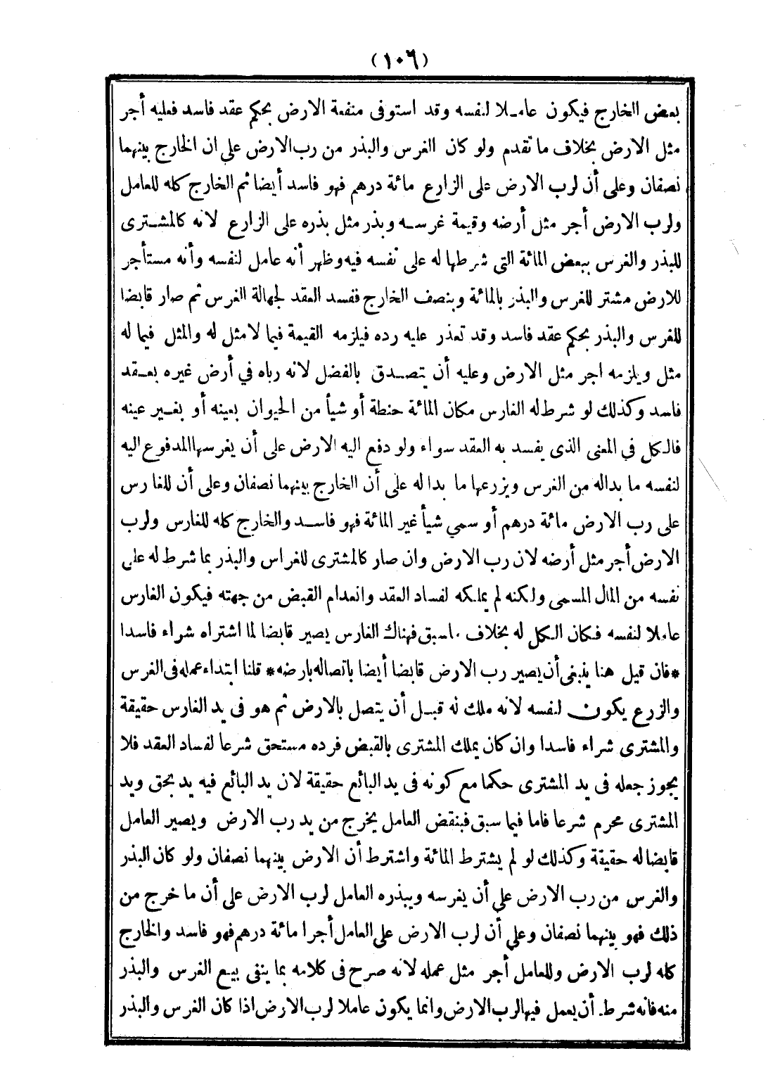بَعْضِ الْخَارِجِ، فَيَكُونُ عَامِلًا لِنَفْسِهِ، وَقَدْ اسْتَوْفَى مَنْفَعَةَ الْأَرْضِ بِحُكْمِ عَقْدٍ فَاسِدٍ فَعَلَيْهِ أَجْرُ مِثْلِ الْأَرْضِ بِخِلَافِ مَا تَقَدَّمَ. وَلَوْ كَانَ الْغَرْسُ وَالْبَذْرُ مِنْ رَبِّ الْأَرْضِ عَلَى أَنَّ الْخَارِجَ بَيْنَهُمَا نِصْفَانِ، وَعَلَى أَنَّ لِرَبِّ الْأَرْضِ عَلَى الْمُزَارِعِ مِائَةَ دِرْهَمٍ - فَهُوَ فَاسِدٌ أَيْضًا، ثُمَّ الْخَارِجُ كُلُّهُ لِلْعَامِلِ، وَلِرَبِّ الْأَرْضِ أَجْرُ مِثْلِ أَرْضِهِ وَقِيمَةُ غَرْسِهِ وَبَذْرٌ مِثْلُ بَذْرِهِ عَلَى الزَّارِعِ؛ لِأَنَّهُ كَالْمُشْتَرِي لِلْبَذْرِ وَالْغَرْسِ بِبَعْضِ الْمِائَةِ الَّتِي شَرَطَهَا لَهُ عَلَى نَفْسِهِ فِيهِ، وَظَهَرَ أَنَّهُ عَامِلٌ لِنَفْسِهِ وَأَنَّهُ مُسْتَأْجِرٌ لِلْأَرْضِ مُشْتَرٍ لِلْغَرْسِ وَالْبَذْرِ بِالْمِائَةِ وَبِنِصْفِ الْخَارِجِ، فَفَسَدَ الْعَقْدُ لِجَهَالَةِ الْغَرْسِ، ثُمَّ صَارَ قَابِضًا لِلْغَرْسِ وَالْبَذْرِ بِحُكْمِ عَقْدٍ فَاسِدٍ، وَقَدْ تَعَذَّرَ عَلَيْهِ رَدُّهُ، فَيُلْزِمُهُ الْقِيمَةُ فِيمَا لَا مِثْلَ لَهُ، وَالْمِثْلُ فِيمَا لَهُ مِثْلٌ، وَيُلْزِمُهُ أَجْرُ مِثْلِ الْأَرْضِ، وَعَلَيْهِ أَنْ يَتَصَدَّقَ بِالْفَضْلِ؛ لِأَنَّهُ رَبَّاهُ فِي أَرْضِ غَيْرِهِ بِعَقْدٍ فَاسِدٍ. وَكَذَلِكَ لَوْ شَرَطَ لَهُ الْغَارِسُ مَكَانَ الْمِائَةِ حِنْطَةً أَوْ شَيْئًا مِنْ الْحَيَوَانِ بِعَيْنِهِ أَوْ بِغَيْرِ عَيْنِهِ - فَالْكُلُّ فِي الْمَعْنَى الَّذِي يَفْسُدُ بِهِ الْعَقْدُ سَوَاءٌ.