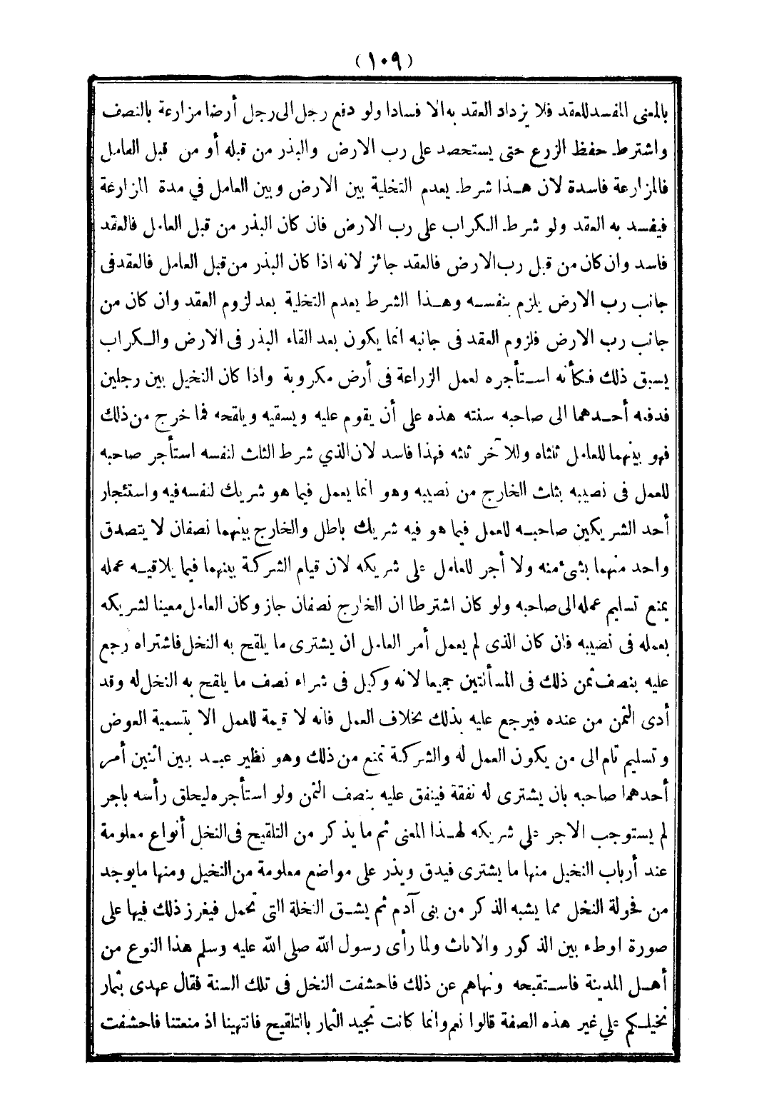 وَإِذَا كَانَ النَّخِيلُ بَيْنَ رَجُلَيْنِ فَدَفَعَهُ أَحَدُهُمَا إلَى صَاحِبِهِ سَنَتَهُ هَذِهِ عَلَى أَنْ يَقُومَ عَلَيْهِ وَيَسْقِيَهُ وَيُلَقِّحَهُ فَمَا خَرَجَ مِنْ ذَلِكَ فَهُوَ بَيْنَهُمَا: لِلْعَامِلِ ثُلُثَاهُ وَلِلْآخَرِ ثُلُثُهُ - فَهَذَا فَاسِدٌ؛ لِأَنَّ الَّذِي شَرَطَ الثُّلُثَ لِنَفْسِهِ اسْتَأْجَرَ صَاحِبَهُ لِلْعَمَلِ فِي نَصِيبِهِ بِثُلُثِ الْخَارِجِ مِنْ نَصِيبِهِ، وَهُوَ إنَّمَا يَعْمَلُ فِيمَا هُوَ شَرِيكٌ لِنَفْسِهِ فِيهِ، وَاسْتِئْجَارُ أَحَدِ الشَّرِيكَيْنِ صَاحِبَهُ لِلْعَمَلِ فِيمَا هُوَ فِيهِ شَرِيكٌ بَاطِلٌ، وَالْخَارِجُ بَيْنَهُمَا نِصْفَانِ لَا يَتَصَدَّقُ وَاحِدٌ مِنْهُمَا بِشَيْءٍ مِنْهُ، وَلَا أَجْرَ لِلْعَامِلِ عَلَى شَرِيكِهِ؛ لِأَنَّ قِيَامَ الشَّرِكَةِ بَيْنَهُمَا فِيمَا يُلَاقِيهِ عَمَلُهُ يَمْنَعُ تَسْلِيمَ عَمَلِهِ إلَى صَاحِبِهِ. وَلَوْ كَانَ اشْتَرَطَا أَنَّ الْخَارِجَ نِصْفَانِ جَازَ وَكَانَ الْعَامِلُ مُعِينًا لِشَرِيكِهِ بِعَمَلِهِ فِي نَصِيبِهِ، فَإِنْ كَانَ الَّذِي لَمْ يَعْمَلْ أَمَرَ الْعَامِلَ أَنْ يَشْتَرِيَ مَا يُلَقِّحُ بِهِ النَّخْلَ فَاشْتَرَاهُ - رَجَعَ عَلَيْهِ بِنِصْفِ ثَمَنِ ذَلِكَ فِي الْمَسْأَلَتَيْنِ جَمِيعًا؛ لِأَنَّهُ وَكِيلٌ فِي شِرَاءِ نِصْفِ مَا يُلَقِّحُ بِهِ النَّخْلَ لَهُ وَقَدْ أَدَّى الثَّمَنَ مِنْ عِنْدِهِ فَيَرْجِعُ عَلَيْهِ بِذَلِكَ، بِخِلَافِ الْعَمَلِ فَإِنَّهُ لَا قِيمَةَ لِلْعَمَلِ إلَّا بِتَسْمِيَةِ الْعِوَضِ وَتَسْلِيمٍ تَامٍّ إلَى مَنْ يَكُونُ الْعَمَلُ لَهُ، وَالشَّرِكَةُ تَمْنَعُ مِنْ ذَلِكَ، وَهُوَ نَظِيرُ عَبْدٍ بَيْنَ اثْنَيْنِ أَمَرَ أَحَدُهُمَا صَاحِبَهُ بِأَنْ يَشْتَرِيَ لَهُ نَفَقَةً فَيُنْفِقَ عَلَيْهِ بِنِصْفِ الثَّمَنِ، وَلَوْ اسْتَأْجَرَهُ لِيَحْلِقَ رَأْسَهُ بِأَجْرٍ لَمْ يَسْتَوْجِبْ الْأَجْرَ عَلَى شَرِيكِهِ لِهَذَا الْمَعْنَى، ثُمَّ مَا يَذْكُرُ مِنْ التَّلْقِيحِ فِي النَّخْلِ أَنْوَاعٌ مَعْلُومَةٌ عِنْدَ أَرْبَابِ النَّخِيلِ: مِنْهَا مَا يُشْتَرَى فَيُدَقُّ وَيُذَرُّ عَلَى مَوَاضِعَ مَعْلُومَةٍ مِنْ النَّخِيلِ. وَمِنْهَا مَا يُوجَدُ مِنْ فُحُولَةِ النَّخْلِ مِمَّا يُشْبِهُ الذَّكَرَ مِنْ بَنِي آدَمَ ثُمَّ يَشُقُّ النَّخْلَةَ الَّتِي تَحْمِلُ فَيَغْرِزُ ذَلِكَ فِيهَا عَلَى صُورَةِ الْوَطْءِ بَيْنَ الذُّكُورِ وَالْإِنَاثِ، وَلَمَّا رَأَى رَسُولُ اللَّهِ - صَلَّى اللَّهُ عَلَيْهِ وَسَلَّمَ - هَذَا النَّوْعَ مِنْ أَهْلِ الْمَدِينَةِ فَاسْتَقْبَحَهُ وَنَهَاهُمْ عَنْ ذَلِكَ فَأَحْشَفَتْ النَّخْلُ فِي تِلْكَ السَّنَةِ فَقَالَ: عَهْدِي بِثِمَارِ نَخِيلِكُمْ عَلَى غَيْرِ هَذِهِ الصِّفَةِ. قَالُوا: نَعَمْ. وَإِنَّمَا كَانَتْ تُجِيدُ الثِّمَارَ بِالتَّلْقِيحِ فَانْتَهَيْنَا إذْ مَنَعْتنَا فَأَحْشَفَتْ.