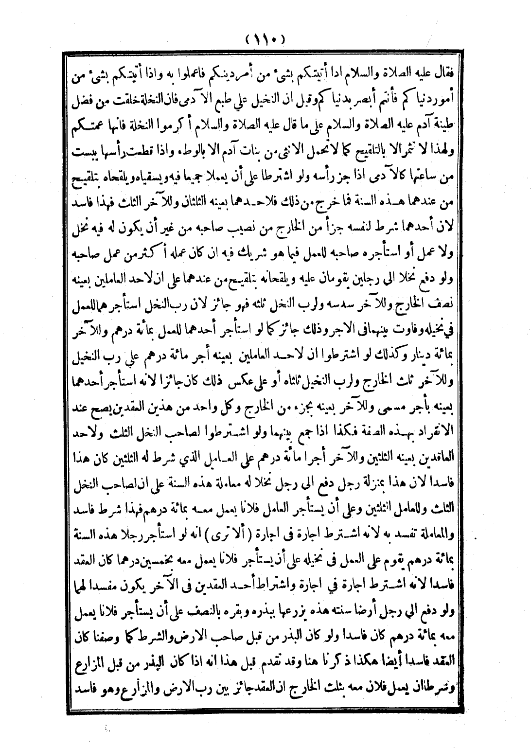 فَقَالَ - عَلَيْهِ الصَّلَاةُ وَالسَّلَامُ -: إذَا أَتَيْتُكُمْ بِشَيْءٍ مِنْ أَمْرِ دِينِكُمْ فَاعْمَلُوا بِهِ، وَإِذَا أَتَيْتُكُمْ بِشَيْءٍ مِنْ أُمُورِ دُنْيَاكُمْ فَأَنْتُمْ أَبْصَرُ بِدُنْيَاكُمْ. وَقِيلَ إنَّ النَّخِيلَ عَلَى طَبْعِ الْآدَمِيِّ، فَإِنَّ النَّخْلَةَ خُلِقَتْ مِنْ فَضْلِ طِينَةِ آدَمَ - عَلَيْهِ الصَّلَاةُ وَالسَّلَامُ - عَلَى مَا قَالَ - عَلَيْهِ الصَّلَاةُ وَالسَّلَامُ -: «أَكْرِمُوا النَّخْلَةَ فَإِنَّهَا عَمَّتُكُمْ»، وَلِهَذَا لَا تُثْمِرُ إلَّا بِالتَّلْقِيحِ كَمَا لَا تَحْمِلُ الْأُنْثَى مِنْ بَنَاتِ آدَمَ إلَّا بِالْوَطْءِ، وَإِذَا قُطِعَتْ رَأْسُهَا يَبِسَتْ مِنْ سَاعَتِهَا كَالْآدَمِيِّ إذَا جُزَّ رَأْسُهُ. وَلَوْ اشْتَرَطَا عَلَى أَنْ يَعْمَلَا جَمِيعًا فِيهِ وَيَسْقِيَاهُ وَيُلَقِّحَاهُ بِتَلْقِيحٍ مِنْ عِنْدِهِمَا هَذِهِ السَّنَةَ فَمَا خَرَجَ مِنْ ذَلِكَ فَلِأَحَدِهِمَا بِعَيْنِهِ الثُّلُثَانِ وَلِلْآخَرِ الثُّلُثُ - فَهَذَا فَاسِدٌ؛ لِأَنَّ أَحَدَهُمَا شَرَطَ لِنَفْسِهِ جُزْءًا مِنْ الْخَارِجِ مِنْ نَصِيبِ صَاحِبِهِ مِنْ غَيْرِ أَنْ يَكُونَ لَهُ فِيهِ نَخْلٌ وَلَا عَمَلٌ، أَوْ اسْتَأْجَرَهُ صَاحِبُهُ لِلْعَمَلِ فِيمَا هُوَ شَرِيكٌ فِيهِ إنْ كَانَ عَمَلُهُ أَكْثَرَ مِنْ عَمَلِ صَاحِبِهِ.