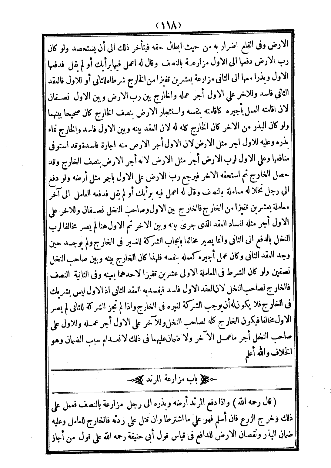 (قَالَ - رَحِمَهُ اللَّهُ -): وَإِذَا دَفَعَ الْمُرْتَدُّ أَرْضَهُ وَبَذْرَهُ إلَى رَجُلٍ مُزَارَعَةً بِالنِّصْفِ، فَعَمِلَ عَلَى ذَلِكَ وَخَرَجَ الزَّرْعُ: فَإِنْ أَسْلَمَ فَهُوَ عَلَى مَا اشْتَرَطَا، وَإِنْ قُتِلَ عَلَى رِدَّتِهِ فَالْخَارِجُ لِلْعَامِلِ وَعَلَيْهِ ضَمَانُ الْبَذْرِ وَنُقْصَانُ الْأَرْضِ لِلدَّافِعِ فِي قِيَاسِ قَوْلِ أَبِي حَنِيفَةَ رَحِمَهُ اللَّهُ عَلَى قَوْلِ مَنْ أَجَازَ
