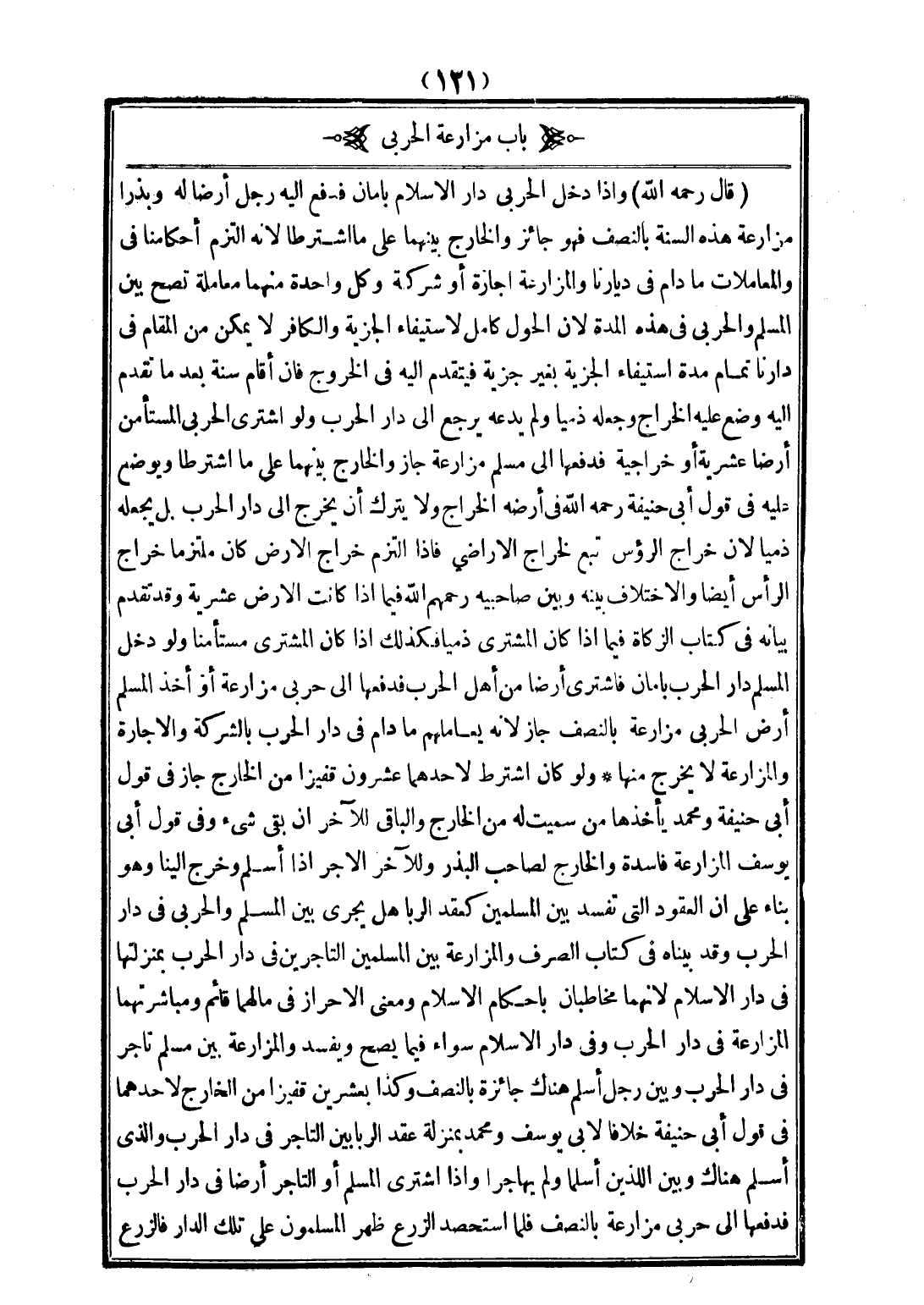 قَالَ - رَحِمَهُ اللَّهُ -): وَإِذَا دَخَلَ الْحَرْبِيُّ دَارَ الْإِسْلَامِ بِأَمَانٍ فَدَفَعَ إلَيْهِ رَجُلٌ أَرْضًا لَهُ وَبَذْرًا مُزَارَعَةً هَذِهِ السَّنَةَ بِالنِّصْفِ - فَهُوَ جَائِزٌ، وَالْخَارِجُ بَيْنَهُمَا عَلَى مَا اشْتَرَطَا؛ لِأَنَّهُ الْتَزَمَ أَحْكَامَنَا فِي الْمُعَامَلَاتِ مَا دَامَ فِي دِيَارِنَا، وَالْمُزَارَعَةُ إجَارَةٌ أَوْ شَرِكَةٌ، وَكُلُّ وَاحِدَةٍ مِنْهُمَا مُعَامَلَةٌ تَصِحُّ بَيْنَ الْمُسْلِمِ وَالْحَرْبِيِّ فِي هَذِهِ الْمُدَّةِ؛ لِأَنَّ الْحَوْلَ كَامِلٌ لِاسْتِيفَاءِ الْجِزْيَةِ، وَالْكَافِرُ لَا يُمَكَّنُ مِنْ الْمُقَامِ فِي دَارِنَا تَمَامَ مُدَّةِ اسْتِيفَاءِ الْجِزْيَةِ بِغَيْرِ جِزْيَةٍ، فَيَتَقَدَّمُ إلَيْهِ فِي الْخُرُوجِ، فَإِنْ أَقَامَ سَنَةً بَعْدَ مَا تَقَدَّمَ إلَيْهِ وَضَعَ عَلَيْهِ الْخَرَاجَ، وَجَعَلَهُ ذِمِّيًّا، وَلَمْ يَدَعْهُ يَرْجِعُ إلَى دَارِ الْحَرْبِ.