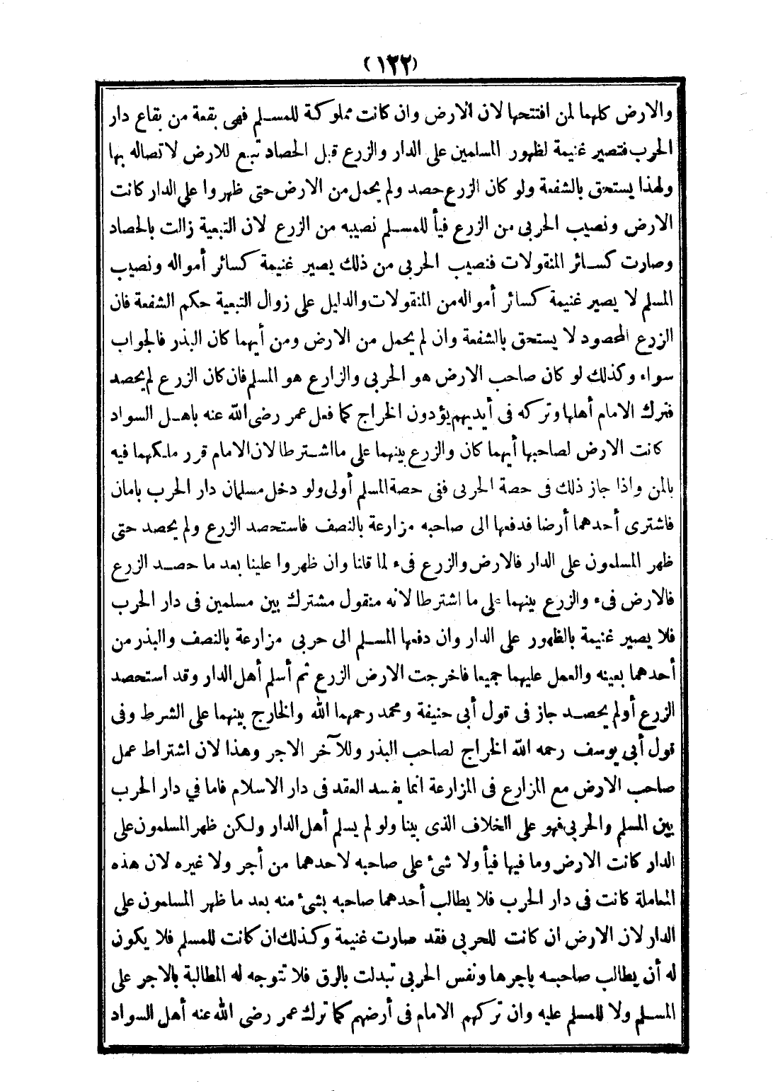 وَالْأَرْضُ كُلُّهُمَا لِمَنْ افْتَتَحَهَا؛ لِأَنَّ الْأَرْضَ وَإِنْ كَانَتْ مَمْلُوكَةً لِلْمُسْلِمِ فَهِيَ بُقْعَةٌ مِنْ بِقَاعِ دَارِ الْحَرْبِ، فَتَصِيرُ غَنِيمَةً لِظُهُورِ الْمُسْلِمِينَ عَلَى الدَّارِ، وَالزَّرْعُ قَبْلَ الْحَصَادِ تَبَعٌ لِلْأَرْضِ لِاتِّصَالِهِ بِهَا، وَلِهَذَا يُسْتَحَقُّ بِالشُّفْعَةِ. وَلَوْ كَانَ الزَّرْعُ حُصِدَ وَلَمْ يُحْمَلْ مِنْ الْأَرْضِ حَتَّى ظَهَرُوا عَلَى الدَّارِ - كَانَتْ الْأَرْضُ وَنَصِيبُ الْحَرْبِيِّ مِنْ الزَّرْعِ فَيْئًا، وَلِلْمُسْلِمِ نَصِيبَهُ مِنْ الزَّرْعِ؛ لِأَنَّ التَّبَعِيَّةَ زَالَتْ بِالْحَصَادِ، وَصَارَتْ كَسَائِرِ الْمَنْقُولَاتِ فَنَصِيبُ الْحَرْبِيِّ مِنْ ذَلِكَ يَصِيرُ غَنِيمَةً كَسَائِرِ أَمْوَالِهِ وَنَصِيبُ الْمُسْلِمِ لَا يَصِيرُ غَنِيمَةً كَسَائِرِ أَمْوَالِهِ مِنْ الْمَنْقُولَاتِ. وَالدَّلِيلُ عَلَى زَوَالِ التَّبَعِيَّةِ حُكْمُ الشُّفْعَةِ، فَإِنَّ الزَّرْعَ الْمَحْصُودَ لَا يُسْتَحَقُّ بِالشُّفْعَةِ وَإِنْ لَمْ يُحْمَلْ مِنْ الْأَرْضِ. وَمِنْ أَيِّهِمَا كَانَ الْبَذْرُ فَالْجَوَابُ سَوَاءٌ. وَكَذَلِكَ لَوْ كَانَ صَاحِبُ الْأَرْضِ هُوَ الْحَرْبِيُّ وَالزَّارِعُ هُوَ الْمُسْلِمُ، فَإِنْ كَانَ الزَّرْعُ لَمْ يُحْصَدْ فَتَرَكَ الْإِمَامُ أَهْلَهَا، وَتَرَكَهُ فِي أَيْدِيهِمْ يُؤَدُّونَ الْخَرَاجَ كَمَا فَعَلَ عُمَرُ - رَضِيَ اللَّهُ عَنْهُ - بِأَهْلِ السَّوَادِ - كَانَتْ الْأَرْضُ لِصَاحِبِهَا أَيَّهُمَا كَانَ، وَالزَّرْعُ بَيْنَهُمَا عَلَى مَا اشْتَرَطَا؛ لِأَنَّ الْإِمَامَ قَرَّرَ مِلْكَهُمَا فِيهِ بِالْمَنِّ، وَإِذَا جَازَ ذَلِكَ فِي حِصَّةِ الْحَرْبِيِّ فَفِي حِصَّةِ الْمُسْلِمِ أَوْلَى.