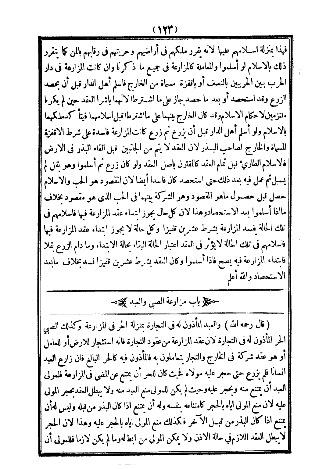 [قَالَ - رَحِمَهُ اللَّهُ -]: وَالْعَبْدُ الْمَأْذُونُ لَهُ فِي التِّجَارَةِ بِمَنْزِلَةِ الْحُرِّ فِي الْمُزَارَعَةِ، وَكَذَلِكَ الصَّبِيُّ الْحُرُّ الْمَأْذُونُ لَهُ فِي التِّجَارَةِ؛ لِأَنَّ عَقْدَ الْمُزَارَعَةِ مِنْ عُقُودِ التِّجَارَةِ فَإِنَّهُ اسْتِئْجَارٌ لِلْأَرْضِ أَوْ لِلْعَامِلِ، أَوْ هُوَ عَقْدُ شَرِكَةٍ فِي الْخَارِجِ، وَالتُّجَّارُ يَتَعَامَلُونَ بِهِ، فَالْمَأْذُونُ فِيهِ كَالْحُرِّ الْبَالِغِ، فَإِنْ زَارَعَ الْعَبْدُ إنْسَانًا فَلَمْ يَزْرَعْ حَتَّى حَجَرَ عَلَيْهِ مَوْلَاهُ فَحَيْثُ كَانَ لِلْحُرِّ أَنْ يَمْتَنِعَ عَنْ الْمُضِيِّ فِي الْمُزَارَعَةِ فَلِمَوْلَى الْعَبْدِ أَنْ يَمْتَنِعَ مِنْهُ وَيَحْجُرَ عَلَيْهِ، وَحَيْثُ لَمْ يَكُنْ لِلْمَوْلَى مَنْعُ الْعَبْدِ مِنْهُ وَلَا يَبْطُلُ الْعَقْدُ بِحَجْرِ الْمَوْلَى عَلَيْهِ لِأَنَّ مَنْعَ الْمَوْلَى إيَّاهُ بِالْحَجْرِ كَامْتِنَاعِهِ بِنَفْسِهِ، وَلَهُ أَنْ يَمْتَنِعَ إذَا كَانَ الْبَذْرُ مِنْ قِبَلِهِ، وَلَيْسَ لَهُ أَنْ يَمْتَنِعَ إذَا كَانَ الْبَذْرُ مِنْ قِبَلِ الْآخَرِ، فَكَذَلِكَ مَنْعُ الْمَوْلَى إيَّاهُ بِالْحَجْرِ عَلَيْهِ، وَهَذَا لِأَنَّ الْحَجْرَ لَا يُبْطِلُ الْعَقْدَ اللَّازِمَ فِي حَالَةِ الْإِذْنِ وَلَا يُمَكَّنُ الْمَوْلَى مِنْ إبْطَالِهِ، وَمَا لَمْ يَكُنْ لَازِمًا فَلِلْمَوْلَى أَنْ
