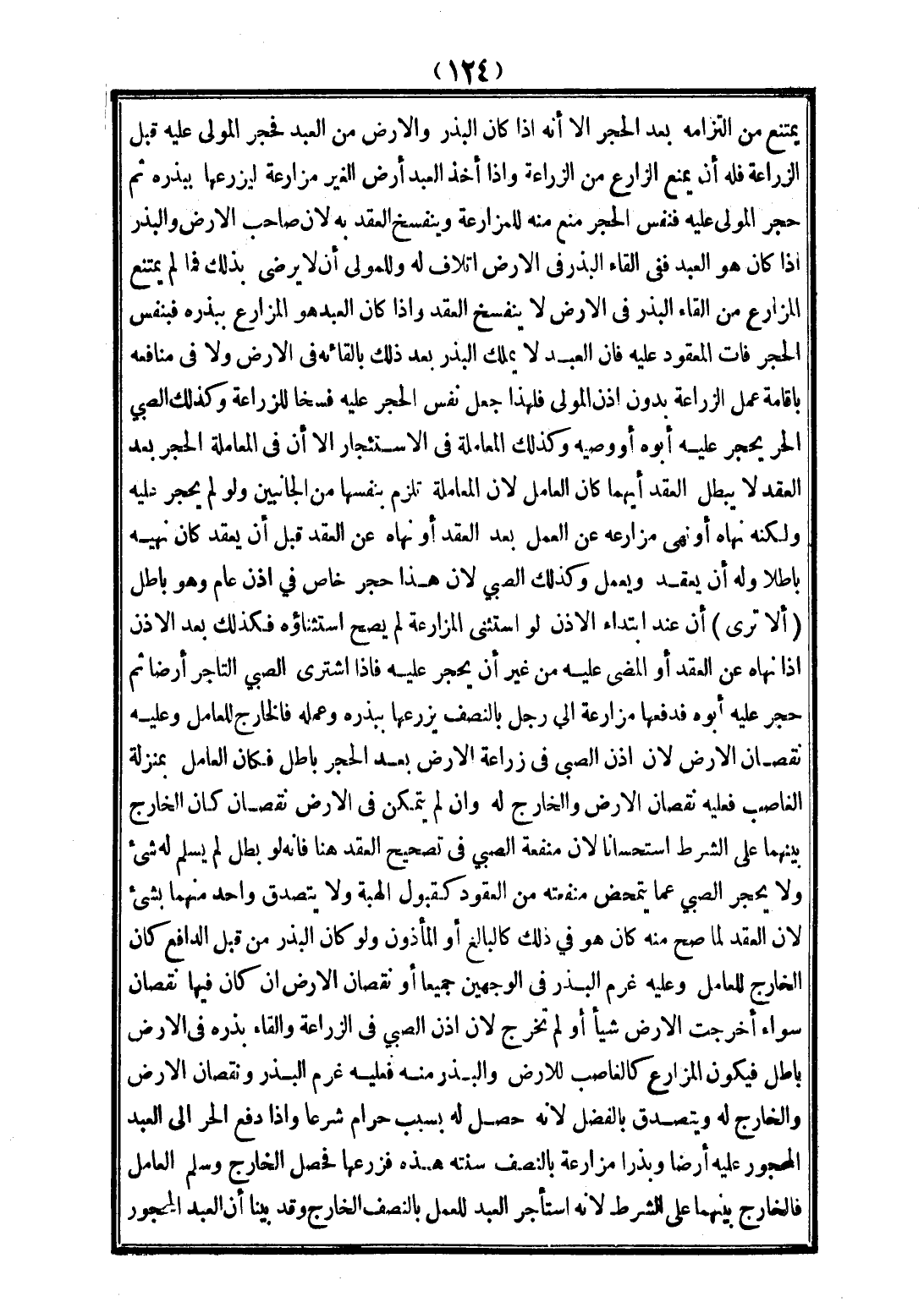 يَمْتَنِعَ مِنْ الْتِزَامِهِ بَعْدَ الْحَجْرِ إلَّا أَنَّهُ إذَا كَانَ الْبَذْرُ وَالْأَرْضُ مِنْ الْعَبْدِ فَحَجَرَ الْمَوْلَى عَلَيْهِ قَبْلَ الزِّرَاعَةِ فَلَهُ أَنْ يَمْنَعَ الزَّارِعَ مِنْ الزِّرَاعَةِ. وَإِذَا أَخَذَ الْعَبْدُ أَرْضَ الْغَيْرِ مُزَارَعَةً لِيَزْرَعَهَا بِبَذْرِهِ ثُمَّ حَجَرَ الْمَوْلَى عَلَيْهِ فَنَفْسُ الْحَجْرِ مَنْعٌ مِنْهُ لِلْمُزَارَعَةِ وَيَنْفَسِخُ الْعَقْدُ بِهِ؛ لِأَنَّ صَاحِبَ الْأَرْضِ وَالْبَذْرِ إذَا كَانَ هُوَ الْعَبْدُ فَفِي إلْقَاءِ الْبَذْرِ فِي الْأَرْضِ إتْلَافٌ لَهُ وَلِلْمَوْلَى أَنْ لَا يَرْضَى بِذَلِكَ، فَمَا لَمْ يَمْتَنِعْ الْمُزَارِعُ مِنْ إلْقَاءِ الْبَذْرِ فِي الْأَرْضِ لَا يَنْفَسِخُ الْعَقْدُ، وَإِذَا كَانَ الْعَبْدُ هُوَ الْمُزَارِعُ بِبَذْرِهِ فَبِنَفْسِ الْحَجْرِ فَاتَ الْمَعْقُودُ عَلَيْهِ، فَإِنَّ الْعَبْدَ لَا يَمْلِكُ الْبَذْرَ بَعْدَ ذَلِكَ بِإِلْقَائِهِ فِي الْأَرْضِ وَلَا فِي مَنَافِعِهِ بِإِقَامَةِ عَمَلِ الزِّرَاعَةِ بِدُونِ إذْنِ الْمَوْلَى، فَلِهَذَا جَعَلَ نَفْسَ الْحَجْرِ عَلَيْهِ فَسْخًا لِلزِّرَاعَةِ. وَكَذَلِكَ الصَّبِيُّ الْحُرُّ يَحْجُرُ عَلَيْهِ أَبُوهُ أَوْ وَصِيُّهُ. وَكَذَلِكَ الْمُعَامَلَةُ فِي الِاسْتِئْجَارِ إلَّا أَنَّ فِي الْمُعَامَلَةِ الْحَجْرَ بَعْدَ الْعَقْدِ لَا يُبْطِلُ الْعَقْدَ، أَيَّهمَا كَانَ الْعَامِلُ، لِأَنَّ الْمُعَامَلَةَ تُلْزَمُ بِنَفْسِهَا مِنْ الْجَانِبَيْنِ وَلَوْ لَمْ يَحْجُرْ عَلَيْهِ وَلَكِنَّهُ نَهَاهُ أَوْ نَهَى مُزَارِعَهُ عَنْ الْعَمَلِ بَعْدَ الْعَقْدِ أَوْ نَهَاهُ عَنْ الْعَقْدِ قَبْلَ أَنْ يَعْقِدَ كَانَ نَهْيُهُ بَاطِلًا وَلَهُ أَنْ يَعْقِدَ وَيَعْمَلَ. وَكَذَلِكَ الصَّبِيُّ لِأَنَّ هَذَا حَجْرٌ خَاصٌّ فِي إذْنٍ عَامٍّ وَهُوَ بَاطِلٌ [أَلَا تَرَى] أَنَّ عِنْدَ ابْتِدَاءِ الْإِذْنِ لَوْ اسْتَثْنَى الْمُزَارَعَةَ لَمْ يَصِحَّ اسْتِثْنَاؤُهُ؟ فَكَذَلِكَ بَعْدَ الْإِذْنِ إذَا نَهَاهُ عَنْ الْعَقْدِ أَوْ الْمُضِيِّ عَلَيْهِ مِنْ غَيْرِ أَنْ يَحْجُرَ عَلَيْهِ. فَإِذَا اشْتَرَى الصَّبِيُّ التَّاجِرُ أَرْضًا ثُمَّ حَجَرَ عَلَيْهِ أَبُوهُ فَدَفَعَهَا مُزَارَعَةً إلَى رَجُلٍ بِالنِّصْفِ يَزْرَعُهَا بِبَذْرِهِ وَعَمَلِهِ فَالْخَارِجُ لِلْعَامِلِ وَعَلَيْهِ نُقْصَانُ الْأَرْضِ لِأَنَّ إذْنَ الصَّبِيِّ فِي زِرَاعَةِ الْأَرْضِ بَعْدَ الْحَجْرِ بَاطِلٌ فَكَانَ الْعَامِلُ بِمَنْزِلَةِ الْغَاصِبِ فَعَلَيْهِ نُقْصَانُ الْأَرْضِ وَالْخَارِجُ لَهُ، وَإِنْ لَمْ يَتَمَكَّنْ فِي الْأَرْضِ نُقْصَانٌ كَانَ الْخَارِجُ بَيْنَهُمَا عَلَى الشَّرْطِ اسْتِحْسَانًا لِأَنَّ مَنْفَعَةَ الصَّبِيِّ فِي تَصْحِيحِ الْعَقْدِ هُنَا، فَإِنَّهُ لَوْ بَطَلَ لَمْ يَسْلَمْ لَهُ شَيْءٌ، وَلَا يَحْجُرُ الصَّبِيَّ عَمَّا يُتَمَحَّضُ مَنْفَعَتُهُ مِنْ الْعُقُودِ كَقَبُولِ الْهِبَةِ وَلَا يَتَصَدَّقُ وَاحِدٌ مِنْهُمَا بِشَيْءٍ لِأَنَّ الْعَقْدَ لَمَّا صَحَّ مِنْهُ كَانَ هُوَ فِي ذَلِكَ كَالْبَالِغِ أَوْ الْمَأْذُونِ. وَلَوْ كَانَ الْبَذْرُ مِنْ قِبَلِ الدَّافِعِ كَانَ الْخَارِجُ لِلْعَامِلِ وَعَلَيْهِ غُرْمُ الْبَذْرِ فِي الْوَجْهَيْنِ جَمِيعًا أَوْ نُقْصَانُ الْأَرْضِ إنْ كَانَ فِيهَا نُقْصَانٌ، سَوَاءٌ أَخْرَجَتْ الْأَرْضُ شَيْئًا أَوْ لَمْ تُخْرَجْ لِأَنَّ إذْنَ الصَّبِيِّ فِي الزِّرَاعَةِ وَإِلْقَاءِ بَذْرِهِ فِي الْأَرْضِ بَاطِلٌ فَيَكُونُ الْمُزَارِعُ كَالْغَاصِبِ لِلْأَرْضِ وَالْبَذْرِ مِنْهُ فَعَلَيْهِ غُرْمُ الْبَذْرِ وَنُقْصَانُ الْأَرْضِ، وَالْخَارِجُ لَهُ وَيَتَصَدَّقُ بِالْفَضْلِ لِأَنَّهُ حَصَلَ لَهُ بِسَبَبٍ حَرَامٍ شَرْعًا.