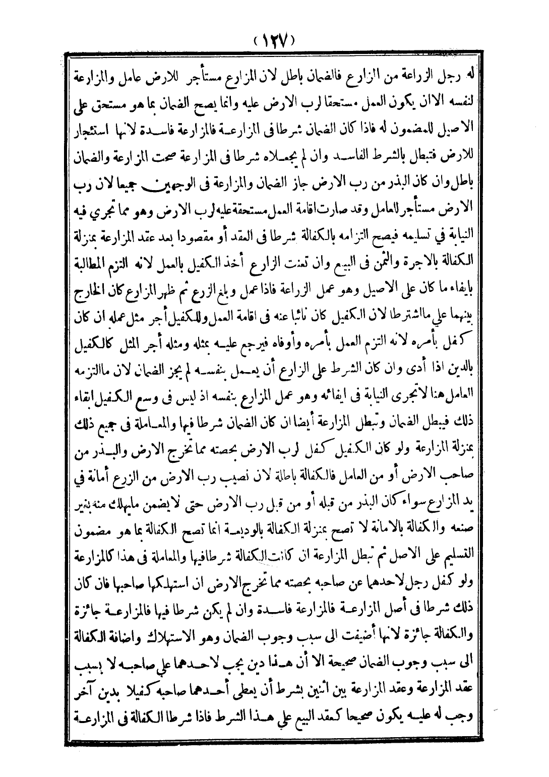 لَهُ رَجُلٌ الزِّرَاعَةَ مِنْ الزَّارِعِ فَالضَّمَانُ بَاطِلٌ؛ لِأَنَّ الْمُزَارِعَ مُسْتَأْجِرٌ لِلْأَرْضِ عَامِلٌ، وَالْمُزَارَعَةُ لِنَفْسِهِ إلَّا أَنْ يَكُونَ الْعَمَلُ مُسْتَحَقًّا لِرَبِّ الْأَرْضِ عَلَيْهِ، وَإِنَّمَا يَصِحُّ الضَّمَانُ بِمَا هُوَ مُسْتَحَقٌّ عَلَى الْأَصِيلِ لِلْمَضْمُونِ لَهُ، فَإِذَا كَانَ الضَّمَانُ شَرْطًا فِي الْمُزَارَعَةِ فَالْمُزَارَعَةُ فَاسِدَةٌ لِأَنَّهَا اسْتِئْجَارٌ لِلْأَرْضِ فَتَبْطُلُ بِالشَّرْطِ الْفَاسِدِ، وَإِنْ لَمْ يَجْعَلَاهُ شَرْطًا فِي الْمُزَارَعَةِ صَحَّتْ الْمُزَارَعَةُ وَالضَّمَانُ بَاطِلٌ، وَإِنْ كَانَ الْبَذْرُ مِنْ رَبِّ الْأَرْضِ جَازَ الضَّمَانُ وَالْمُزَارَعَةُ فِي الْوَجْهَيْنِ جَمِيعًا؛ لِأَنَّ رَبَّ الْأَرْضِ مُسْتَأْجِرٌ لِلْعَامِلِ، وَقَدْ صَارَتْ إقَامَةُ الْعَمَلِ مُسْتَحَقَّةً عَلَيْهِ لِرَبِّ الْأَرْضِ وَهُوَ مِمَّا تَجْرِي فِيهِ النِّيَابَةُ فِي تَسْلِيمِهِ فَيَصِحُّ الْتِزَامُهُ بِالْكَفَالَةِ شَرْطًا فِي الْعَقْدِ أَوْ مَقْصُودًا بَعْدَ عَقْدِ الْمُزَارَعَةِ بِمَنْزِلَةِ الْكَفَالَةِ بِالْأُجْرَةِ، وَالثَّمَنِ فِي الْبَيْعِ، وَإِنْ تَعَنَّتَ الزَّارِعُ أَخَذَ الْكَفِيلُ بِالْعَمَلِ لِأَنَّهُ الْتَزَمَ الْمُطَالَبَةَ بِإِيفَاءِ مَا كَانَ عَلَى الْأَصِيلِ وَهُوَ عَمَلُ الزِّرَاعَةِ، فَإِذَا عَمِلَ وَبَلَغَ الزَّرْعُ ثُمَّ ظَهَرَ الْمُزَارِعُ كَانَ الْخَارِجُ بَيْنَهُمَا عَلَى مَا اشْتَرَطَا لِأَنَّ الْكَفِيلَ كَانَ نَائِبًا عَنْهُ فِي إقَامَةِ الْعَمَلِ، وَلِلْكَفِيلِ أَجْرُ مِثْلِ عَمَلِهِ إنْ كَانَ كَفَلَ بِأَمْرِهِ لِأَنَّهُ الْتَزَمَ الْعَمَلَ بِأَمْرِهِ وَأَوْفَاهُ فَيَرْجِعُ عَلَيْهِ بِمِثْلِهِ؛ وَمِثْلُهُ أَجْرُ الْمِثْلِ؛ كَالْكَفِيلِ بِالدَّيْنِ إذَا أَدَّى، وَإِنْ كَانَ الشَّرْطُ عَلَى الزَّارِعِ أَنْ يَعْمَلَ بِنَفْسِهِ لَمْ يَجُزْ الضَّمَانُ؛ لِأَنَّ مَا الْتَزَمَهُ الْعَامِلُ هُنَا لَا تَجْرِي النِّيَابَةُ فِي إيفَائِهِ وَهُوَ عَمَلُ الْمُزَارِعِ بِنَفْسِهِ إذْ لَيْسَ فِي وُسْعِ الْكَفِيلِ إبْقَاءُ ذَلِكَ فَيَبْطُلُ الضَّمَانُ، وَتَبْطُلُ الْمُزَارَعَةُ أَيْضًا إنْ كَانَ الضَّمَانُ شَرْطًا فِيهَا، وَالْمُعَامَلَةُ فِي جَمِيعِ ذَلِكَ بِمَنْزِلَةِ الْمُزَارَعَةِ، وَلَوْ كَانَ الْكَفِيلُ كَفَلَ لِرَبِّ الْأَرْضِ بِحِصَّتِهِ مِمَّا تُخْرِجُ الْأَرْضُ - وَالْبَذْرُ مِنْ صَاحِبِ الْأَرْضِ أَوْ مِنْ الْعَامِلِ - فَالْكَفَالَةُ بَاطِلَةٌ لِأَنَّ نَصِيبَ رَبِّ الْأَرْضِ مِنْ الزَّرْعِ أَمَانَةٌ فِي يَدِ الْمُزَارِعِ، سَوَاءٌ كَانَ الْبَذْرُ مِنْ قِبَلِهِ أَوْ مِنْ قِبَلِ رَبِّ الْأَرْضِ حَتَّى لَا يَضْمَنَ مَا يَهْلَكُ مِنْهُ بِغَيْرِ صُنْعِهِ، وَالْكَفَالَةُ بِالْأَمَانَةِ لَا تَصِحُّ بِمَنْزِلَةِ الْكَفَالَةِ الْوَدِيعَةِ، إنَّمَا تَصِحُّ الْكَفَالَةُ بِمَا هُوَ مَضْمُونُ التَّسْلِيمِ عَلَى الْأَصْلِ ثُمَّ تَبْطُلُ الْمُزَارَعَةُ إنْ كَانَتْ الْكَفَالَةُ شَرْطًا فِيهَا، وَالْمُعَامَلَةُ فِي هَذَا كَالْمُزَارَعَةِ. وَلَوْ كَفَلَ رَجُلٌ لِأَحَدِهِمَا عَنْ صَاحِبِهِ بِحِصَّتِهِ مِمَّا تُخْرِجُ الْأَرْضُ إنْ اسْتَهْلَكَهَا صَاحِبُهَا - فَإِنْ كَانَ ذَلِكَ شَرْطًا فِي أَصْلِ الْمُزَارَعَةِ فَالْمُزَارَعَةُ فَاسِدَةٌ، وَإِنْ لَمْ يَكُنْ شَرْطًا فِيهَا فَالْمُزَارَعَةُ جَائِزَةٌ وَالْكَفَالَةُ جَائِزَةٌ لِأَنَّهَا أُضِيفَتْ إلَى سَبَبِ وُجُوبِ الضَّمَانِ وَهُوَ الِاسْتِهْلَاكُ، وَإِضَافَةُ الْكَفَالَةِ إلَى سَبَبِ وُجُوبِ الضَّمَانِ صَحِيحَةٌ إلَّا أَنَّ هَذَا دَيْنٌ يَجِبُ لِأَحَدِهِمَا عَلَى صَاحِبِهِ لَا بِسَبَبِ عَقْدِ الْمُزَارَعَةِ. وَعَقْدُ الْمُ