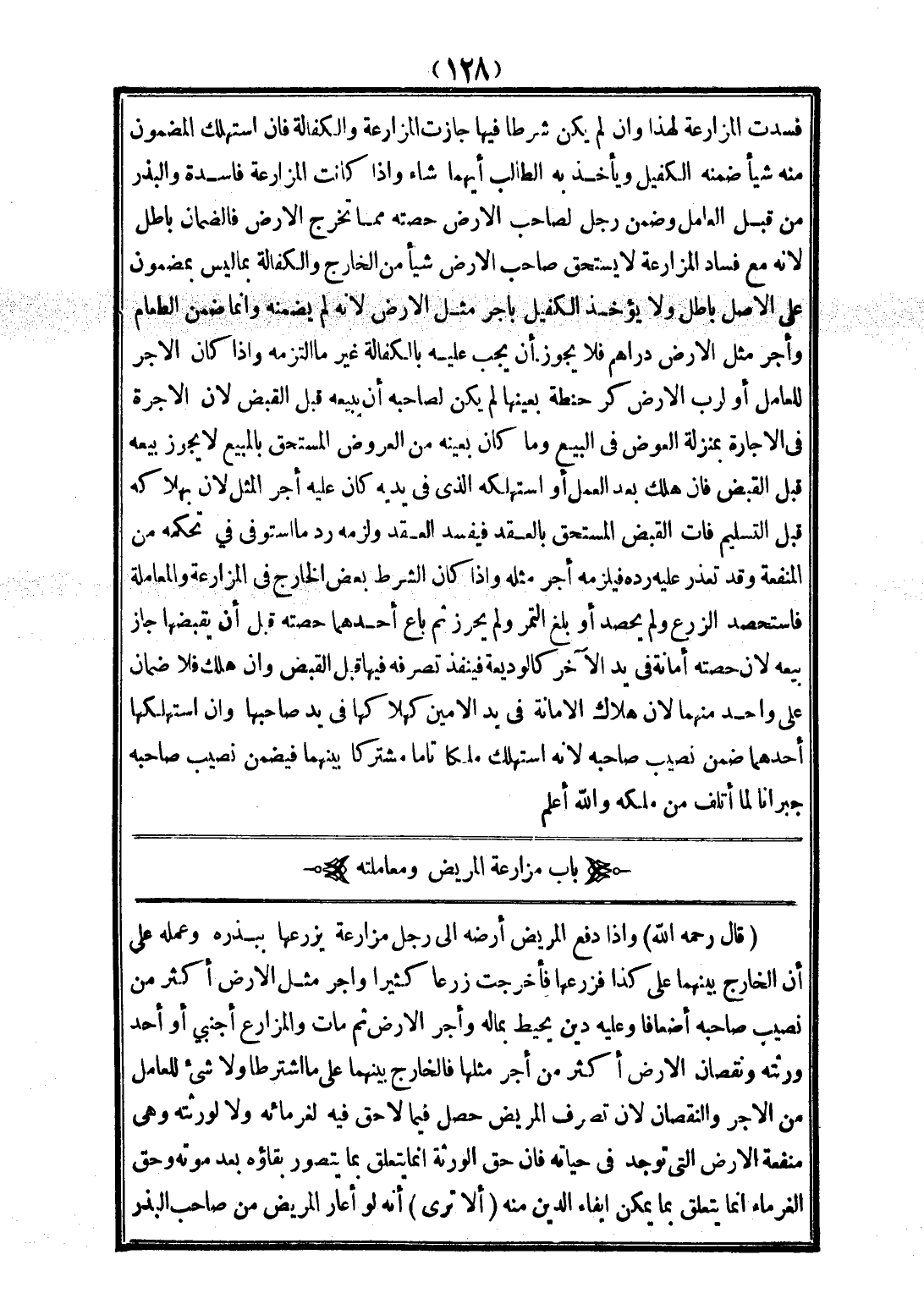 فَسَدَتْ الْمُزَارَعَةُ لِهَذَا، وَإِنْ لَمْ يَكُنْ شَرْطًا فِيهَا جَازَتْ الْمُزَارَعَةُ وَالْكَفَالَةُ، فَإِنْ اسْتَهْلَكَ الْمَضْمُونُ مِنْهُ شَيْئًا ضَمِنَهُ الْكَفِيلُ وَيَأْخُذُ بِهِ الطَّالِبُ أَيَّهمَا شَاءَ، وَإِنْ كَانَتْ الْمُزَارَعَةُ فَاسِدَةً وَالْبَذْرُ مِنْ قِبَلِ الْعَامِلِ وَضَمِنَ رَجُلٌ لِصَاحِبِ الْأَرْضِ حِصَّتَهُ مِمَّا تُخْرِجُ الْأَرْضُ - فَالضَّمَانُ بَاطِلٌ؛ لِأَنَّهُ مَعَ فَسَادِ الْمُزَارَعَةِ لَا يَسْتَحِقُّ صَاحِبُ الْأَرْضِ شَيْئًا مِنْ الْخَارِجِ. وَالْكَفَالَةُ بِمَا لَيْسَ بِمَضْمُونٍ عَلَى الْأَصْلِ بَاطِلٌ، وَلَا يُؤْخَذُ الْكَفِيلُ بِأَجْرِ مِثْلِ الْأَرْضِ لِأَنَّهُ لَمْ يَضْمَنْهُ وَإِنَّمَا ضَمِنَ الطَّعَامَ، وَأَجْرُ مِثْلِ الْأَرْضِ دَرَاهِمُ فَلَا يَجُوزُ أَنْ يَجِبَ عَلَيْهِ بِالْكَفَالَةِ غَيْرُ مَا الْتَزَمَهُ. وَإِذَا كَانَ الْأَجْرُ لِلْعَامِلِ أَوْ لِرَبِّ الْأَرْضِ كُرَّ حِنْطَةٍ بِعَيْنِهَا لَمْ يَكُنْ لِصَاحِبِهِ أَنْ يَبِيعَهُ قَبْلَ الْقَبْضِ؛ لِأَنَّ الْأُجْرَةَ فِي الْإِجَارَةِ بِمَنْزِلَةِ الْعِوَضِ فِي الْبَيْعِ، وَمَا كَانَ بِعَيْنِهِ مِنْ الْعُرُوضِ الْمُسْتَحَقِّ بِالْمَبِيعِ لَا يَجُوزُ بَيْعُهُ قَبْلَ الْقَبْضِ، فَإِنْ هَلَكَ بَعْدَ الْعَمَلِ أَوْ اسْتَهْلَكَهُ الَّذِي فِي يَدِهِ كَانَ عَلَيْهِ أَجْرُ الْمِثْلِ؛ لِأَنَّ بِهَلَاكِهِ قَبْلَ التَّسْلِيمِ فَاتَ الْقَبْضُ الْمُسْتَحَقُّ بِالْعَقْدِ فَيَفْسُدُ الْعَقْدُ، وَلَزِمَهُ رَدُّ مَا اسْتَوْفَى فِي تَحَكُّمِهِ مِنْ الْمَنْفَعَةِ وَقَدْ تَعَذَّرَ عَلَيْهِ رَدُّهُ فَيَلْزَمُهُ أَجْرُ مِثْلِهِ، وَإِذَا كَانَ الشَّرْطُ بَعْضَ الْخَارِجِ فِي الْمُزَارَعَةِ وَالْمُعَامَلَةِ فَاسْتُحْصِدَ الزَّرْعُ أَوْ لَمْ يُحْصَدْ أَوْ بَلَغَ التَّمْرُ وَلَمْ يُحْرَزْ ثُمَّ بَاعَ أَحَدُهُمَا حِصَّتَهُ قَبْلَ أَنْ يَقْبِضَهَا جَازَ بَيْعُهُ؛ لِأَنَّ حِصَّتَهُ أَمَانَةٌ فِي يَدِ الْآخَرِ كَالْوَدِيعَةِ فَيَنْفُذُ تَصَرُّفُهُ فِيهَا قَبْلَ الْقَبْضِ، وَإِنْ هَلَكَ فَلَا ضَمَانَ عَلَى وَاحِدٍ مِنْهُمَا لِأَنَّ هَلَاكَ الْأَمَانَةِ فِي يَدِ الْأَمِينِ كَهَلَاكِهَا فِي يَدِ صَاحِبِهَا، وَإِنْ اسْتَهْلَكَهَا أَحَدُهُمَا ضَمِنَ نَصِيبَ صَاحِبِهِ لِأَنَّهُ اسْتَهْلَكَ مِلْكًا تَامًّا مُشْتَرَكًا بَيْنَهُمَا فَيَضْمَنُ نَصِيبَ صَاحِبِهِ جُبْرَانًا لِمَا أَتْلَفَ مِنْ مِلْكِهِ. وَاَللَّهُ أَعْلَمُ.