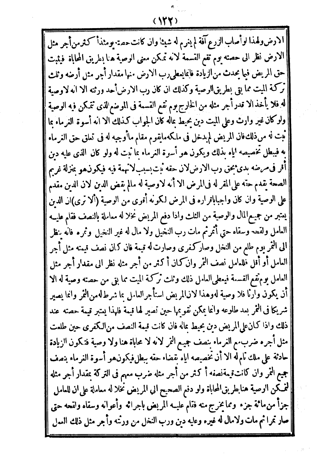 الْأَرْضِ، وَلِهَذَا لَوْ أَصَابَ الزَّرْعَ آفَةٌ لَمْ يَغْرَمْ لَهُ شَيْئًا، وَإِنْ كَانَتْ حِصَّتُهُ يَوْمَئِذٍ أَكْثَرَ مِنْ أَجْرِ مِثْلِ الْأَرْضِ نُظِرَ إلَى حِصَّتِهِ يَوْمَ تَقَعُ الْقِسْمَةُ؛ لِأَنَّهُ تَمَكَّنَ مَعْنَى الْوَصِيَّةِ هُنَا بِطَرِيقِ الْمُحَابَاةِ فَيَثْبُتُ حَقُّ الْمَرِيضِ فِيمَا يَحْدُثُ مِنْ الزِّيَادَةِ، فَإِنَّمَا يُعْطَى رَبُّ الْأَرْضِ مِنْهَا مِقْدَارَ أَجْرِ مِثْلِ أَرْضِهِ، وَثُلُثُ تَرِكَةِ الْمَيِّتِ مِمَّا بَقِيَ بِطَرِيقِ الْوَصِيَّةِ، وَكَذَلِكَ إنْ كَانَ رَبُّ الْأَرْضِ أَحَدَ وَرَثَتِهِ إلَّا أَنَّهُ لَا وَصِيَّةَ لَهُ فَلَا يَأْخُذُ إلَّا قَدْرَ أَجْرِ مِثْلِهِ مِنْ الْخَارِجِ يَوْمَ تَقَعُ الْقِسْمَةُ فِي الْمَوْضِعِ الَّذِي تَتَمَكَّنُ فِيهِ الْوَصِيَّةُ.
