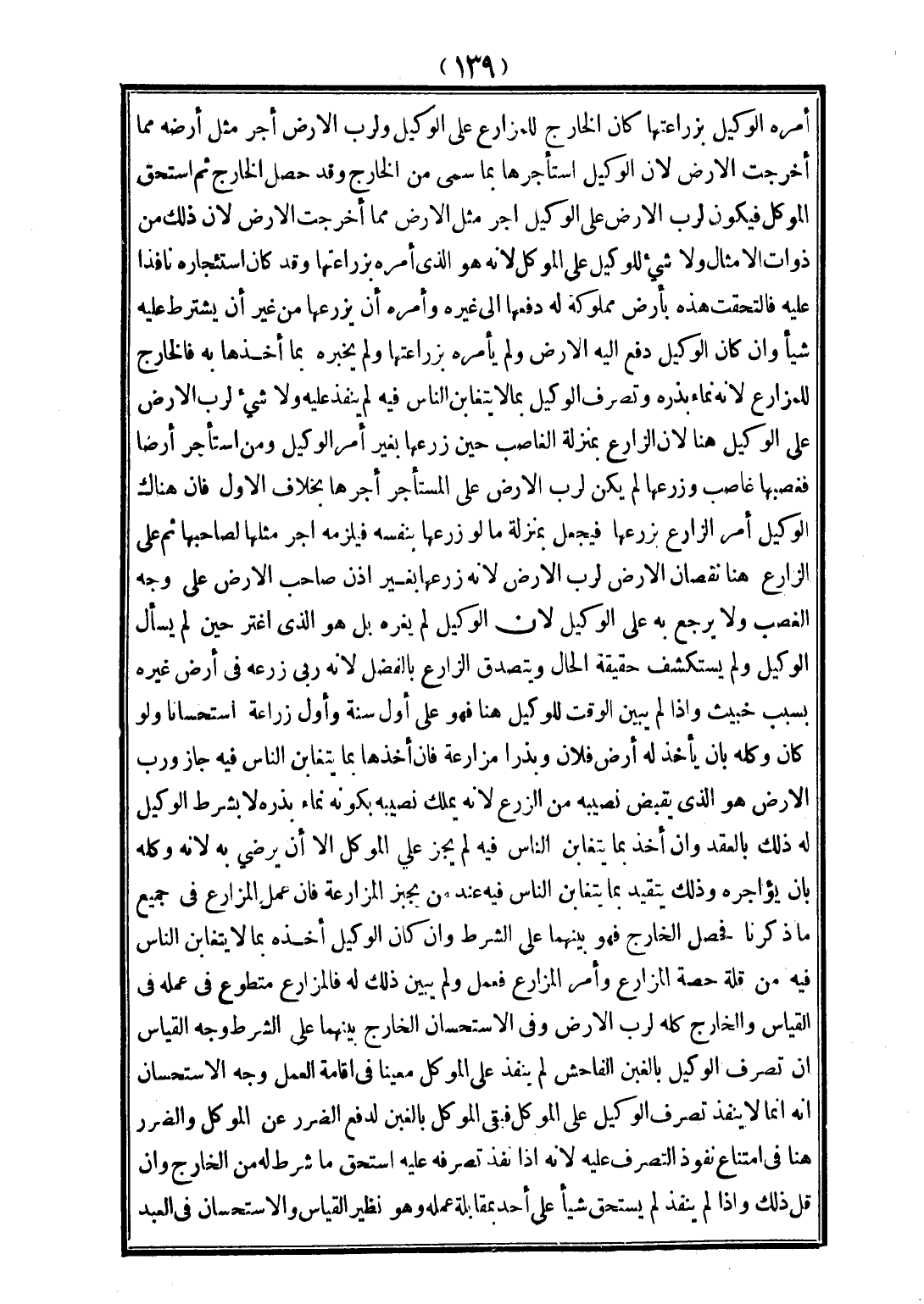 وَجْهُ الْقِيَاسِ أَنَّ تَصَرُّفَ الْوَكِيلِ بِالْغَبْنِ الْفَاحِشِ لَمْ يَنْفُذْ عَلَى الْمُوَكِّلِ مُعِينًا فِي إقَامَةِ الْعَمَلِ. وَجْهُ الِاسْتِحْسَانِ أَنَّهُ إنَّمَا لَا يَنْفُذُ تَصَرُّفُ الْوَكِيلِ عَلَى الْمُوَكِّلِ فَبَقِيَ الْمُوَكِّلُ بِالْغَبْنِ؛ لِدَفْعِ الضَّرَرِ عَنْ الْمُوَكِّلِ، وَالضَّرَرُ هُنَا فِي امْتِنَاعِ نُفُوذِ التَّصَرُّفِ عَلَيْهِ؛ لِأَنَّهُ إذَا نَفَذَ تَصَرُّفُهُ عَلَيْهِ اسْتَحَقَّ مَا شُرِطَ لَهُ مِنْ الْخَارِجِ وَإِنْ قَلَّ ذَلِكَ، وَإِذَا لَمْ يَنْفُذْ لَمْ يَسْتَحِقَّ شَيْئًا عَلَى أَحَدٍ بِمُقَابَلَةِ عَمَلِهِ، وَهُوَ نَظِيرُ الْقِيَاسِ وَالِاسْتِحْسَانِ فِي الْعَبْدِ
